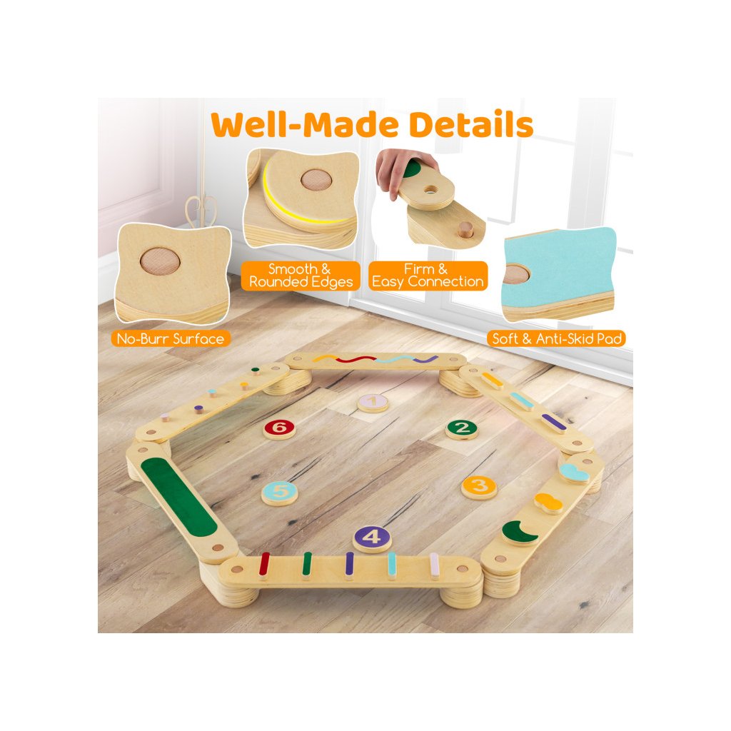 Balančná dráha obsahuje 6 kladín a 6 nášľapných kameňov. Jednoduchý systém vkladania jednotlivých častí dohromady, umožňuje stavať balančné dráhy ľubovoľným spôsobom a vytvárať tak rôzne zložité úrovne. Trénuje rovnováhu a koordináciu a zároveň hravou formou podporuje dôveru vo vlastné schopnosti. Môže zvýšiť sebavedomie, stimulovať kreativitu a predstavivosť, trénovať motorické zručnosti a svalovú silu a poskytovať zábavný a interaktívny spôsob rozvoja detí. Vhodné aj na terapeutické účely. Jednoduchý tvar a dizajn, moderné farby, vyrobené z prírodného dreva Špecifikácia: Farba: Viacfarebná Materiál: brezová preglejka Rozmery každého kladiny: 58 x 9,5 x 3 cm (D x Š x V) Rozmery každého nášľapného kameňa: 9,5 x 9,5 x 1,5 cm (D x Š x V) Rozmery okrúhle základne: 9,5 x 9,5 x 6 cm (D x Š x V) Rozmery dlhej základne: 17,5 x 9,5 x 6 cm (D x Š x V) Vhodný vek: Asi 1 rok Nosnosť: 60 kg Čistá hmotnosť: 6 kg Rozsah dodávky: 6 x kladina 6 x nášľapné kamene 5 x dlhá základňa 2 x guľatá základňa 1 x manuál Nosnosť: do 60 kgDodatočné parametre