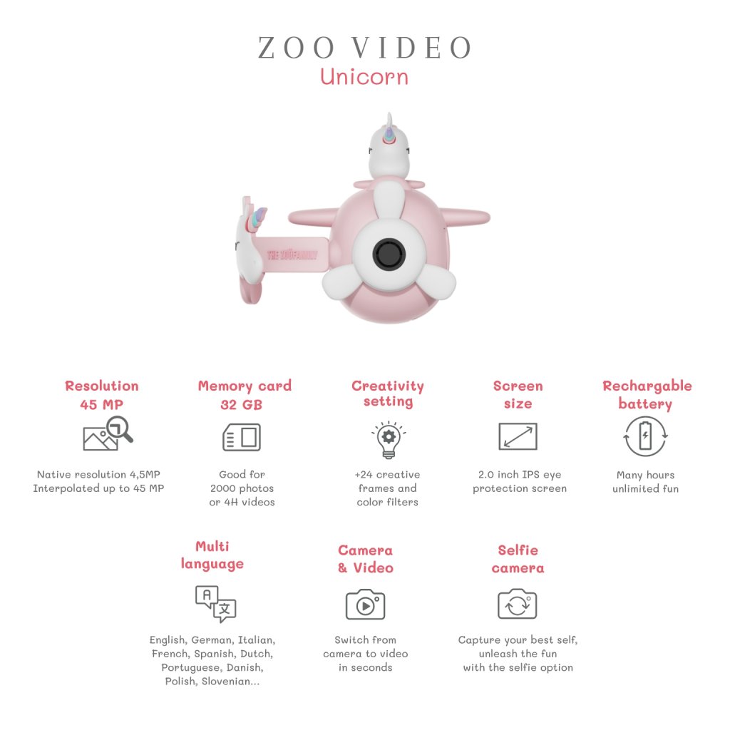 V hraní a fantázii sa medze nekladú...máme pre vaše deti Digitálny fotoaparát a kamera v jednom s motívom Jednorožca od značky Zoofamily, ktorý prebudí prieskumníka vo vašom dieťati! Tento kompaktný a odolný fotoaparát je navrhnutý špeciálne pre deti vo veku od 5 rokov, aby dokonale sedel do ich malých rúk. S interpolovaným rozlíšením 45 MP (natívne 4,5 MP) dokáže zachytiť ostré fotografie a vytvárať epické videá, ktoré uchovajú každý dobrodružný moment. Fotoaparát má intuitívny 2-palcový IPS displej, ktorý chráni oči a umožňuje pohodlné prezeranie. S 32GB pamäťovou kartou, ktorá je súčasťou balenia, môžu deti ukladať až 2000 fotografií alebo 4 hodiny videí. Kamera s fotoaparátom má režim selfie, zábavné rámčeky a farebné filtre dodajú ich dielom kreatívny nádych. Vďaka dobíjacej batérii s kapacitou 1000 mAh si deti užijú až 2 hodiny nepretržitej zábavy. Technické parametre: Rozlíšenie: 45 MP (interpolované) pre ostré fotografie a videá. Displej: 2-palcový IPS displej pre pohodlné prezeranie. Vlastnosti: Fotoaparát a videokamera v jednom, s režimom selfie. Obsah balenia: 32 GB pamäťová karta, 2v1 náhrdelník a nabíjací kábel. Kreatívne prvky: 24 zábavných rámčekov a farebných filtrov pre jedinečné snímky a videá. Batéria: 1000 mAh nabíjacia batéria pre 2 hodiny nepretržitého používania.Dodatočné parametre
