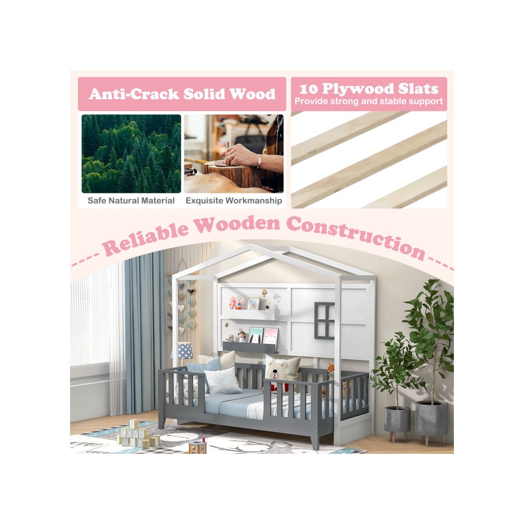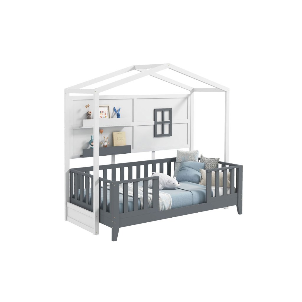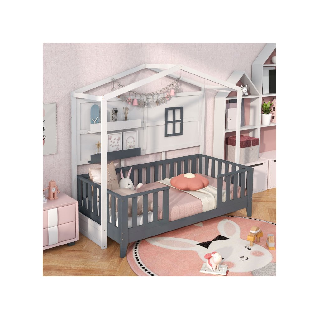 Posteľový rám, ktorý má zadnú stenu, ako domček a pôsobí tak ako skutočný domček na spanie. Pre deti tak vznikne ich vlastný jedinečný priestor Pridaním matraca a vankúšikov vytvoríte pohodlnú posteľ alebo pohovku na odpočívanie. Hornú časť postele môžete ozdobiť svetielkami, obrázkami alebo najrôznejšou dekoráciou. Cez horný posteľový rám v tvare domčeka, môžete prehodiť látku a vytvoríte deťom útulné prostredie, v ktorom budú radi zaspávať. Rošt je súčasťou postele. Matrac nie je súčasťou postele. Vhodné pre matrac o veľkosti 90 x 200 cm Drevený rám v tvare domčeka patrí medzi najobľúbenejšie prvky do detskej izbičky. Parametre: Rozmery: dĺžka: 208 x šírka 105,5 x výška 195 cm Materiál: borovicové drevo/MDFDodatočné parametre