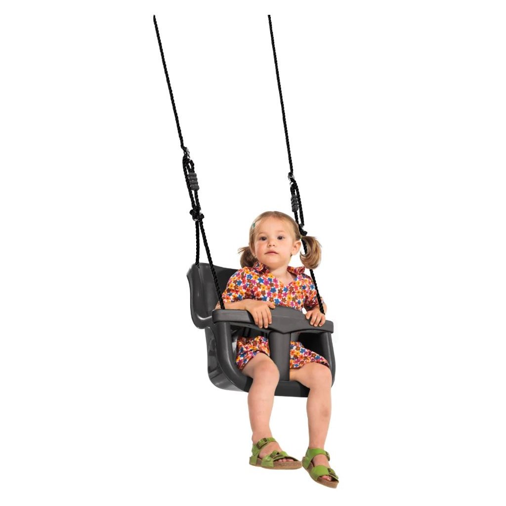 Detská závesná hojdačka pre deti. Vysoká chrbtová opierka a prepážka medzi nožičkami zabránia vypadnutiu dieťaťa zo sedáku.