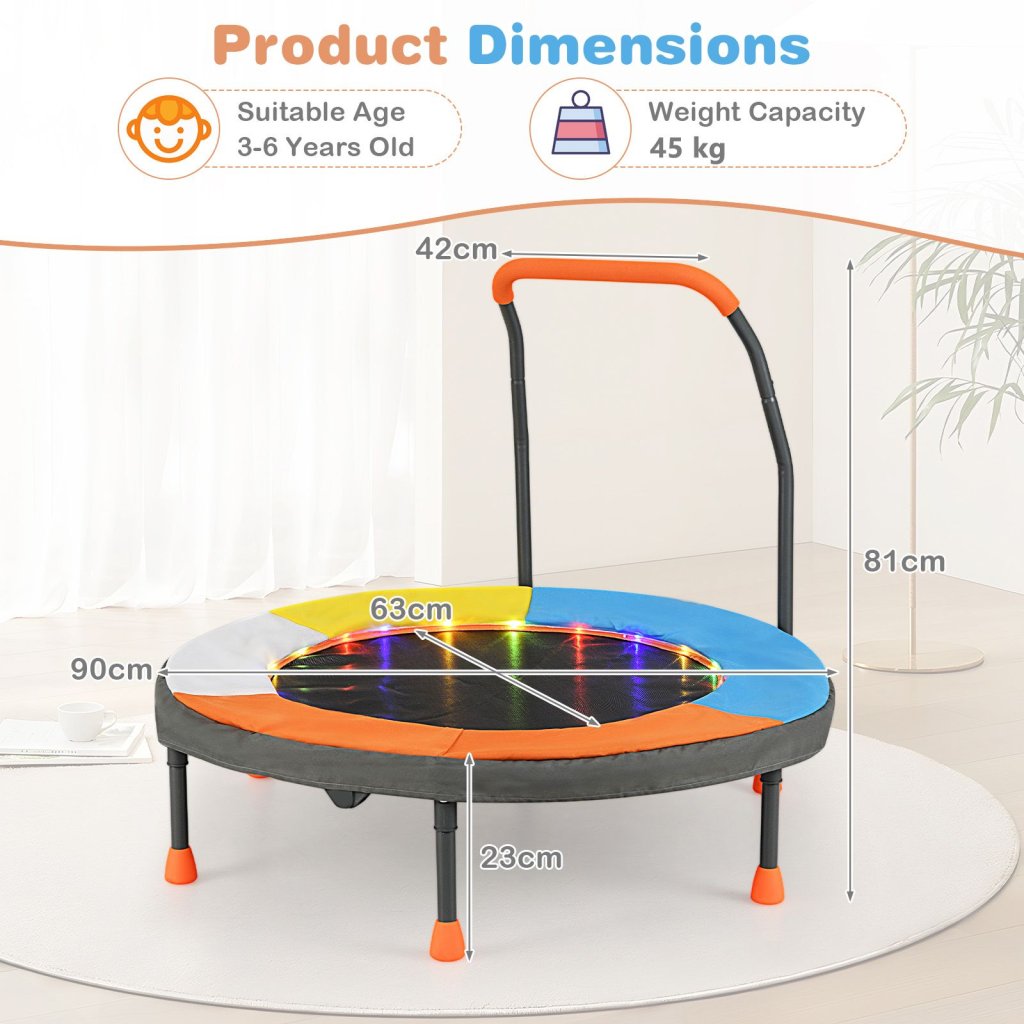 Detská trampolína s motívom jednorožca pre deti s bezpečnostným madlom je skvelým pomocníkom v rozvoji fyzickej zdatnosti Vašich detí. Kvalitná detská trampolína s bezpečnostným madlom, je vhodná pre deti vo veku od 3 rokov. Trampolína má nosnosť 45 kg, je opatrená bezpečnostným golierom, ktorý chráni malé nôžky pred zranením v prípade doskoku do miest, kde sú umiestnené pružiny. Trampolína bude skvelým pomocníkom v rozvoji fyzickej zdatnosti Vašich detí. Skákanie na trampolíne podporuje predovšetkým rozvoj koordinácie a pohybových schopností detí. Veľkosti: rám s priemerom 90 cm, výška k držadlu 58 cm Parametre: Farba: oranžová + modrá/žltá Materiál: kov + oxfordská tkanina + pena Celkové rozmery: 90 cm x 90 cm x 81 cm (D x Š x V) Rozmery v zloženom stave: 65 cm x 36 cm x 10 cm (D x Š x V) priemer skákacej plochy: 63 cm Vhodný vek: 3+ rokov Nosnosť: 45 kg Požiadavky na batérie: 2 batérie AA (nie sú súčasťou balenia) Čistá hmotnosť: 5 kg Obsah balenia: 1 x mini trampolína 1 x návod na použitieDodatočné parametre
