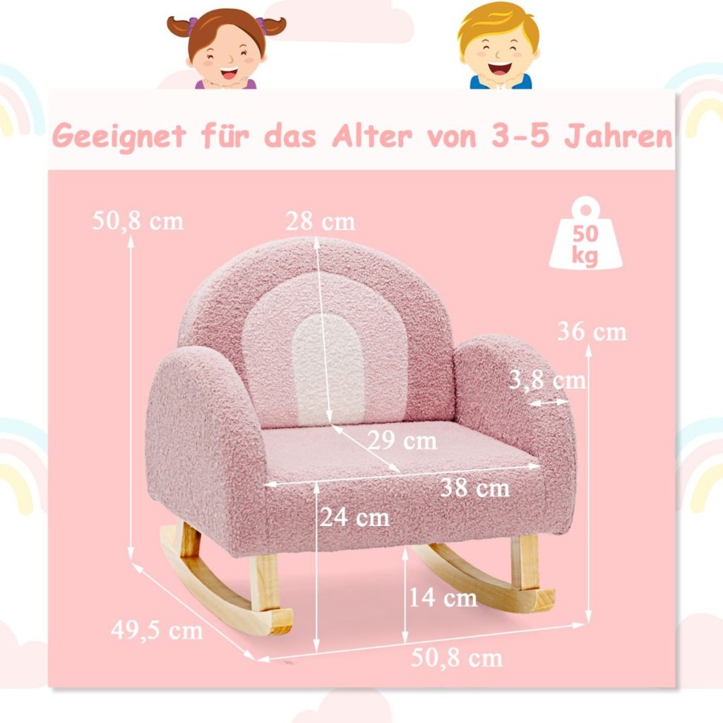 Jedinečný kúsok, ktorý vytvorí z každej detskej izby jedinečné miesto na oddych! Detské hojdacie kreslo v ružovom prevedení, usadené na drevených nôžkach, bude krásnym doplnkom každej detskej izbičky. Hojdacie kresielko bude deti neskutočne baviť. Zakrivené operadlo poskytuje dobrú oporu pre chrbát, zatiaľ čo ergonomické podrúčky perfektne držia paže. Nohy z masívneho dreva navyše zaisťujú stabilitu na podlahe. Parametre: Rozmery: 50,8 x 49,5 x 50,8 cm Materiál: látka Teddy Velvet, masívne drevo, preglejka, pena Nosnosť: do 50 kgDodatočné parametre
