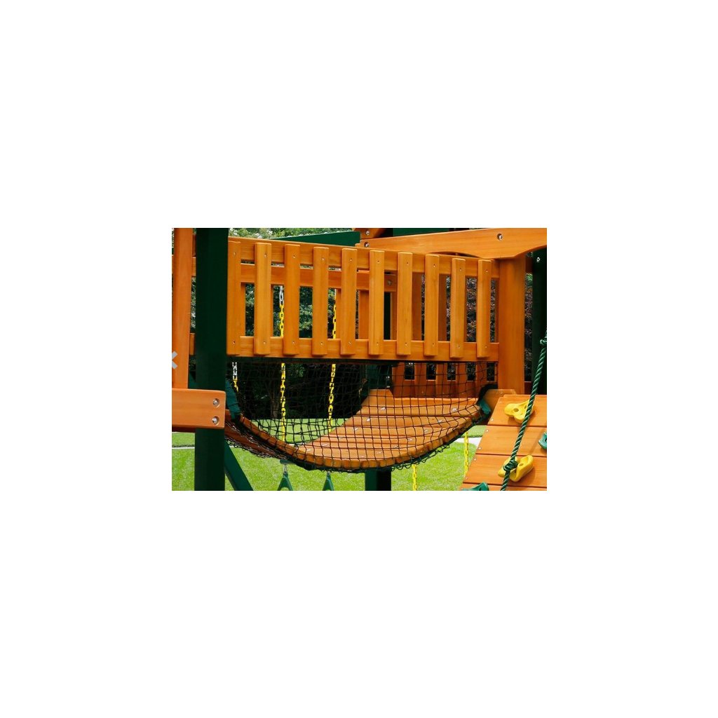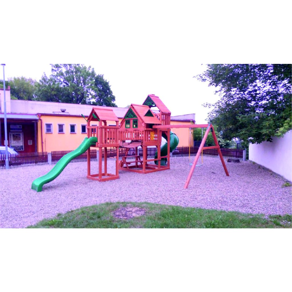 Herná zostava je rozšírená masívnym houpačkovým modulom (rozmer nosného rahna 10 x 15 cm!) Na ktorom je zavesená certifikovaná hojdačka. Klasická rovná na reťaziach, na vyžiadanie je možné za príplatok hojdačku zameniť za iný typ z našej ponuky, napr. Baby sedák pre najmenšie deti, atď.