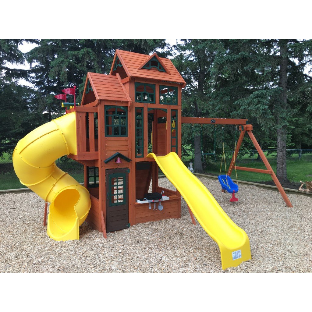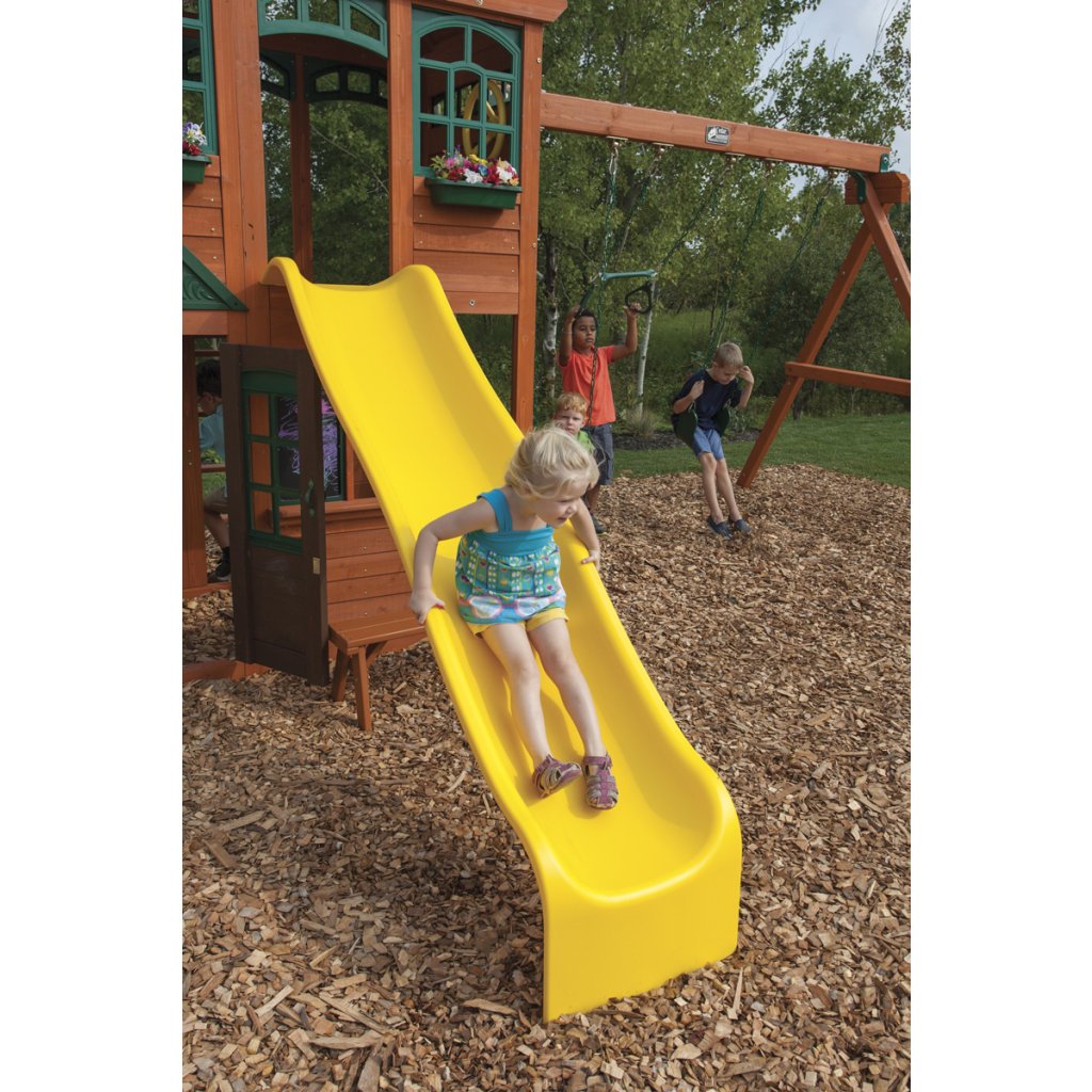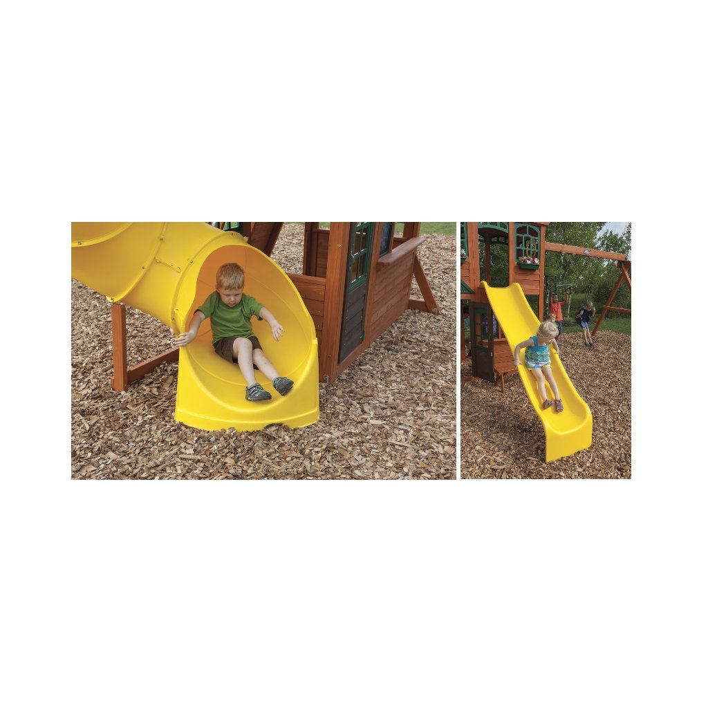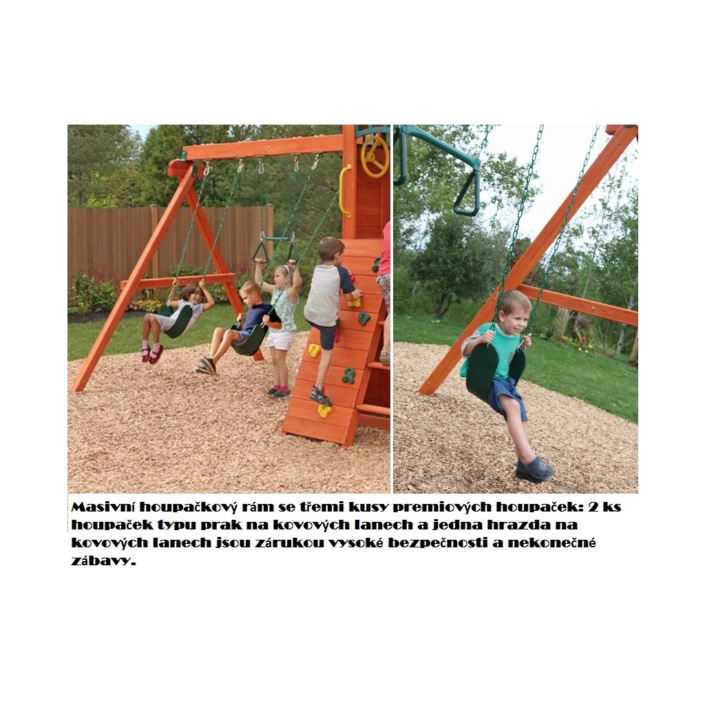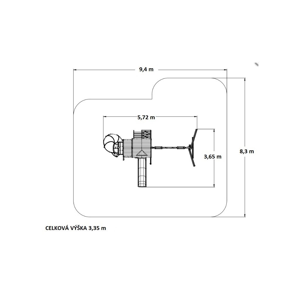 Zostava veľmi komfortných rozmerov je jednopodlažná, s turbo tobogánom v dĺžke 365 cm, ďalšou šmykľavkou v dĺžke 300 cm, rozšírená o masívny hojdačkový modul, s tromi kusmi závesných hojdačiek.