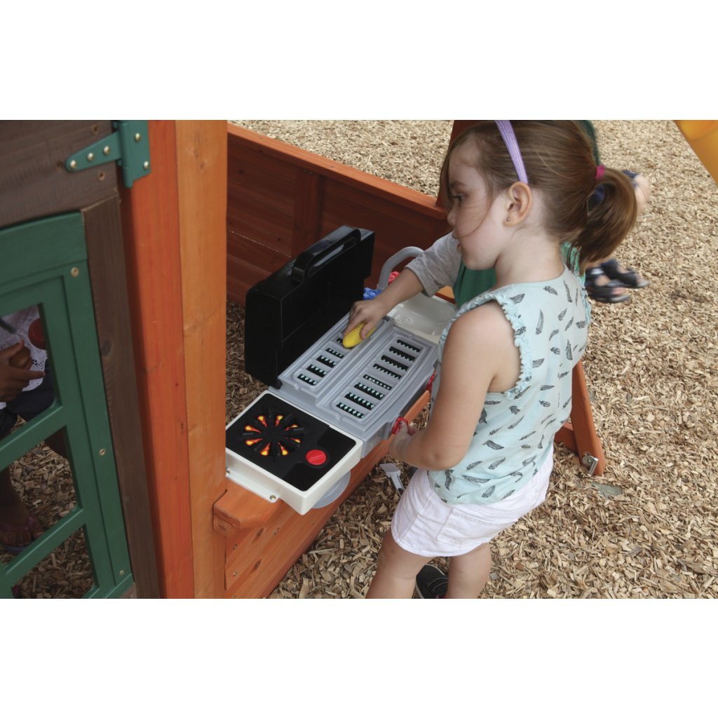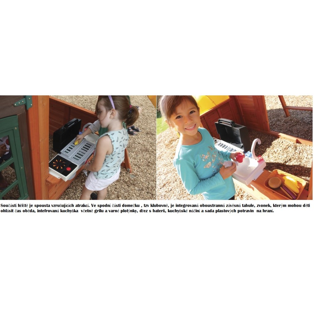 V spodnej časti hernej veže, ktorá je koncipovaná ako domček, je z prednej strany umiestnený pultík s integrovanou kuchynkou, obsahujúcou gril, varnú dosku a drez. Súčasťou vybavenia kuchynky je aj kuchynské náčinie a plastové potraviny.Nad pultíkom je umiestnená obojstranná tabuľa, na ktorú si deti môžu napísať napríklad denné menu. Vstup do spodného domčeka zaisťujú drevené dvere s oknom, nad ktorými je zavesený ozdobný zvonček. Herná veža je zastrešená masívnou drevenou dvojúrovňovou strechou s netradičným vykýrom.Podesta vo výške 135 cm, je prístupná atypickou kombi ležiacou stenou (kombinácia šprušlí a steny s masívnymi lezacími kameňmi). Na zvýšenie bezpečnosti detí je leziaca stena v mieste vstupu na podestu doplnená masívnymi kovovými madlami.
