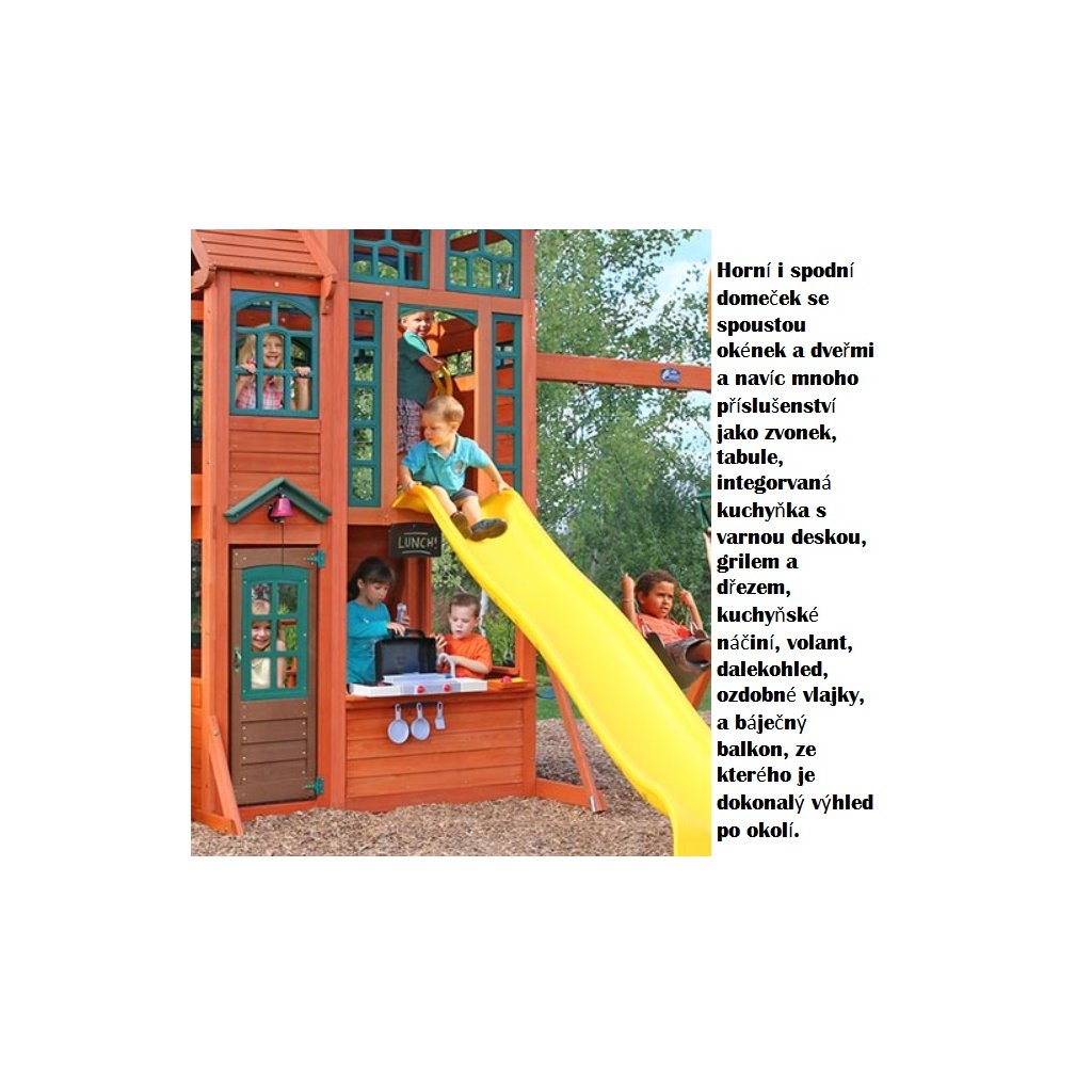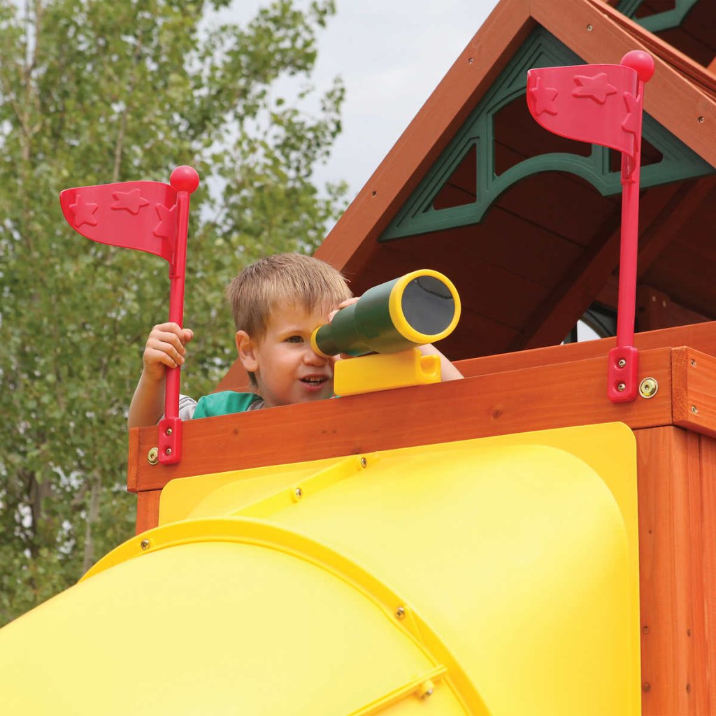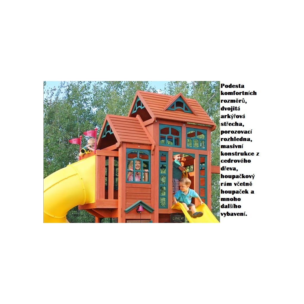 Luxusná herná veža je koncipovaná ako maxi domček a je z prednej aj zadnej strany tvorená z panelov s mnohými integrovanými oknami.Herná veža je vybavená priestrannou pozorovateľňou s ďalekohľadom pri nástupnej plošine tobogánu, z ktorej majú deti báječný výhľad do okolia.Veža je vybavená aj volantom, ktorý je možné umiestniť podľa Vašich potrieb.Pozorovateľňa je dekorovaná červenými vlajočkami.