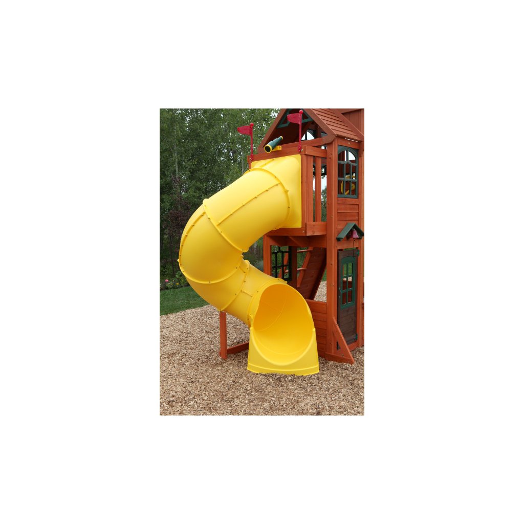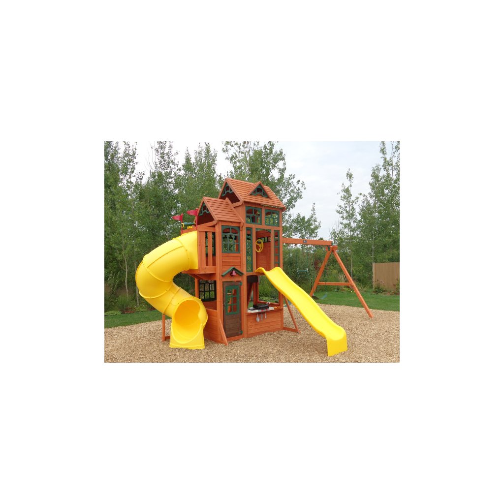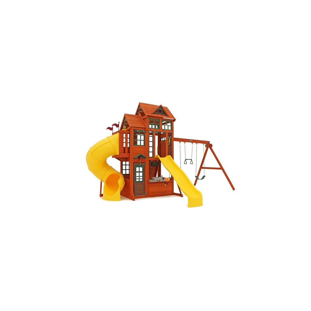 Luxusná herná veža je koncipovaná ako maxi domček a je z prednej aj zadnej strany tvorená z panelov s mnohými integrovanými oknami.Herná veža je vybavená priestrannou pozorovateľňou s ďalekohľadom pri nástupnej plošine tobogánu, z ktorej majú deti báječný výhľad do okolia.Veža je vybavená aj volantom, ktorý je možné umiestniť podľa Vašich potrieb.Pozorovateľňa je dekorovaná červenými vlajočkami.