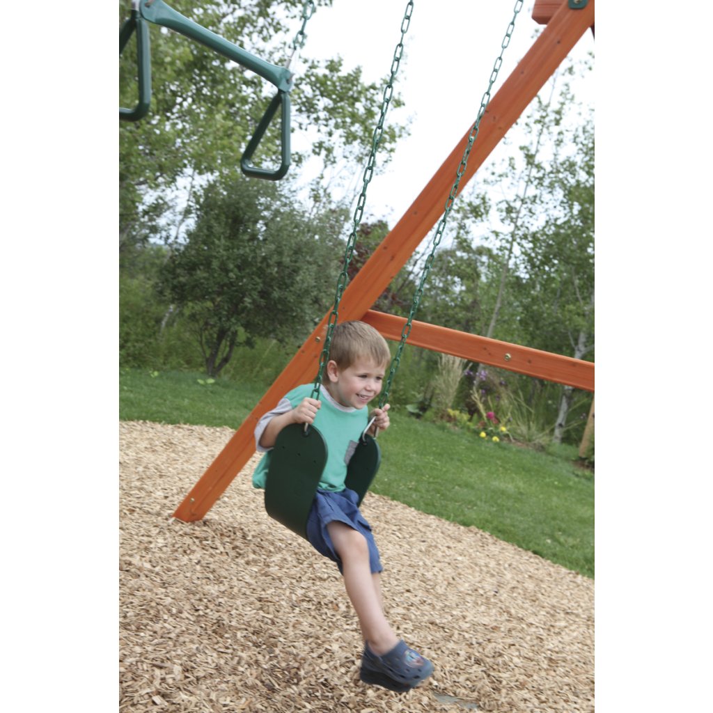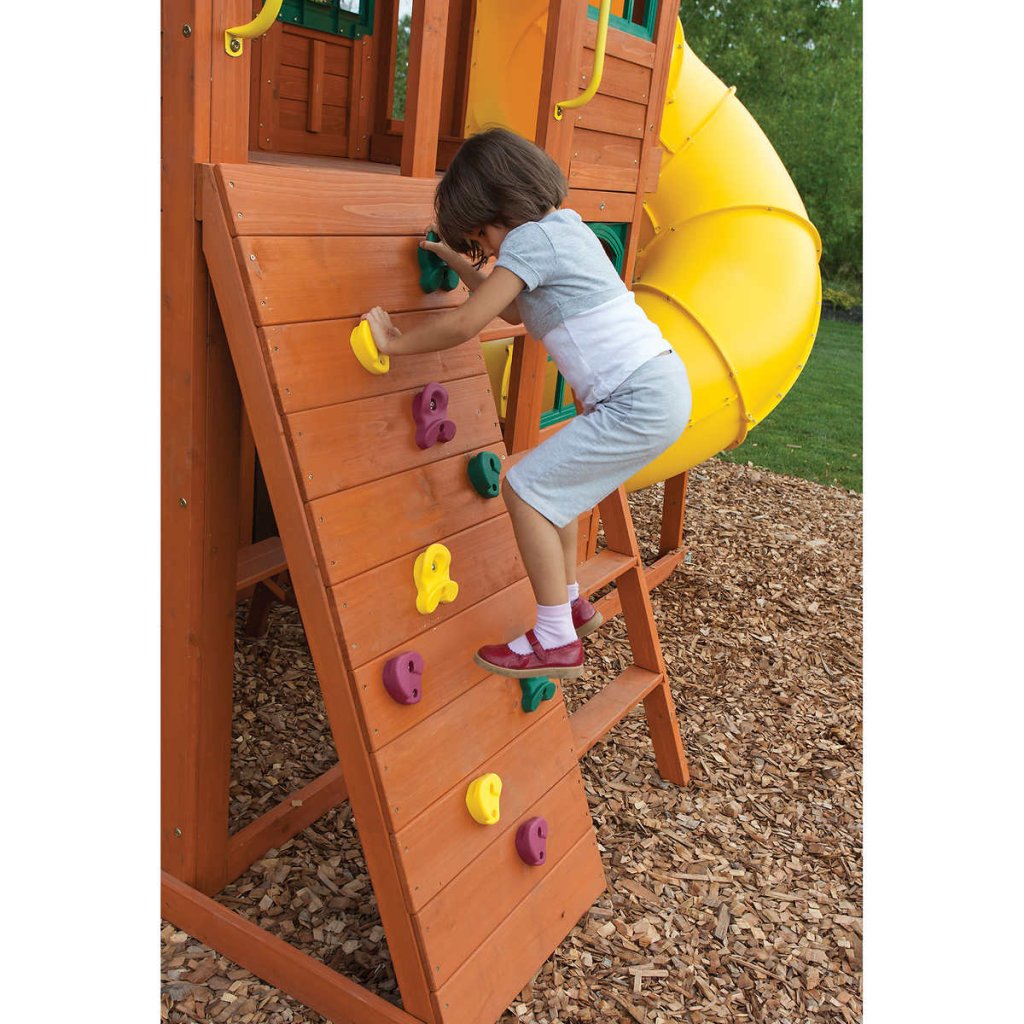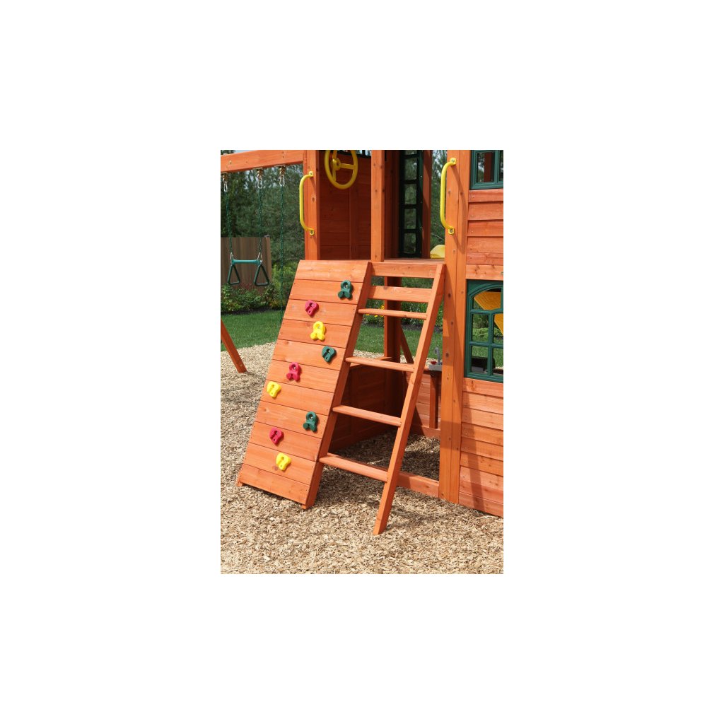 Herná veža je rozšírená hojdačkovým modulom, na ktorom sú zavesené dva flexibilné hojdačkové sedáky zavesené na kovových závesných lanách a hrazda Monkey Bar. Všetky plastové časti sú vyrobené z celoprefarbeného, ??stálofarebného, ??UV odolného plastu a sú určené na celoročné užívanie vonku. Súčasťou dodávky sú aj drevené zemné kotvy, na bezpečné uchytenie zostavy do terénu.