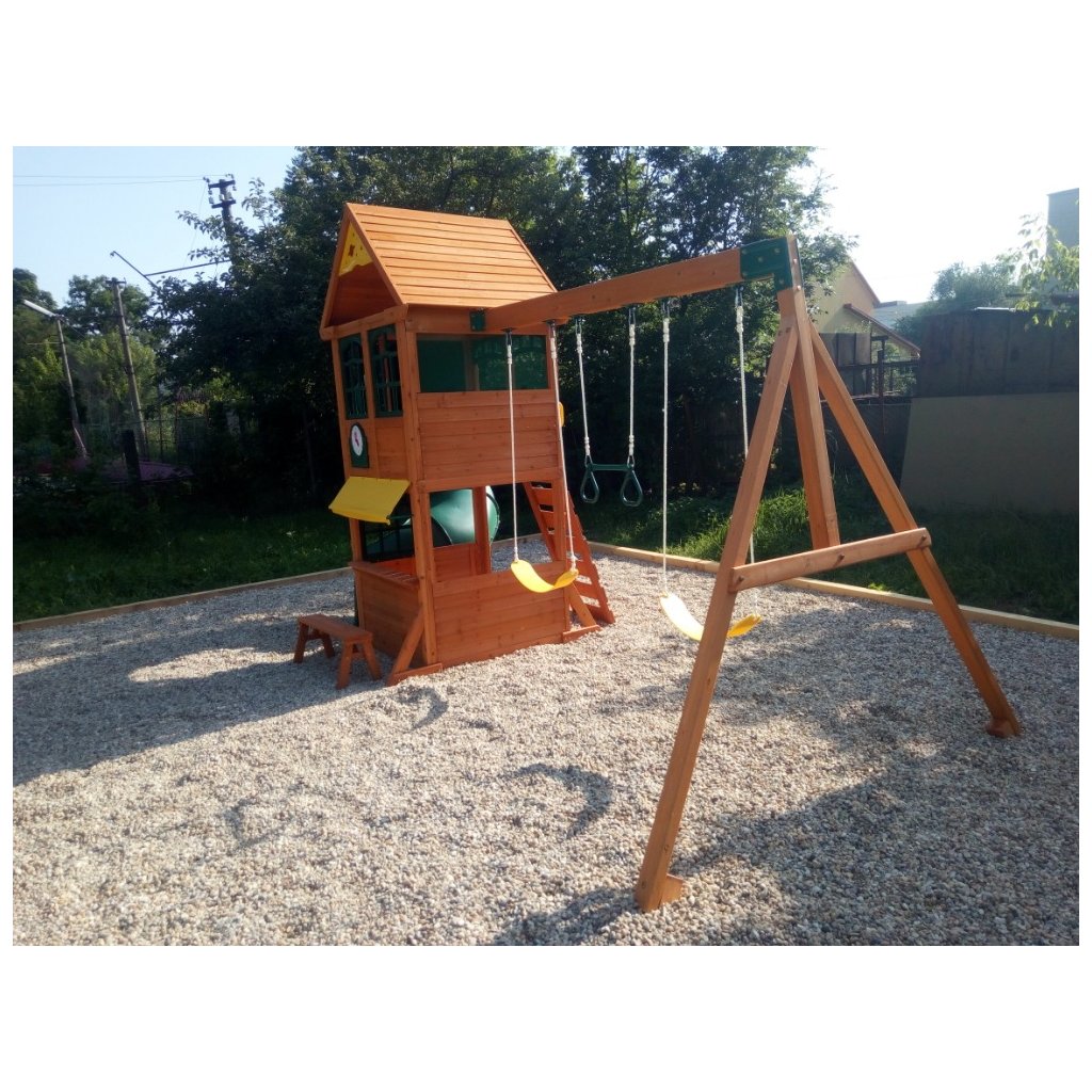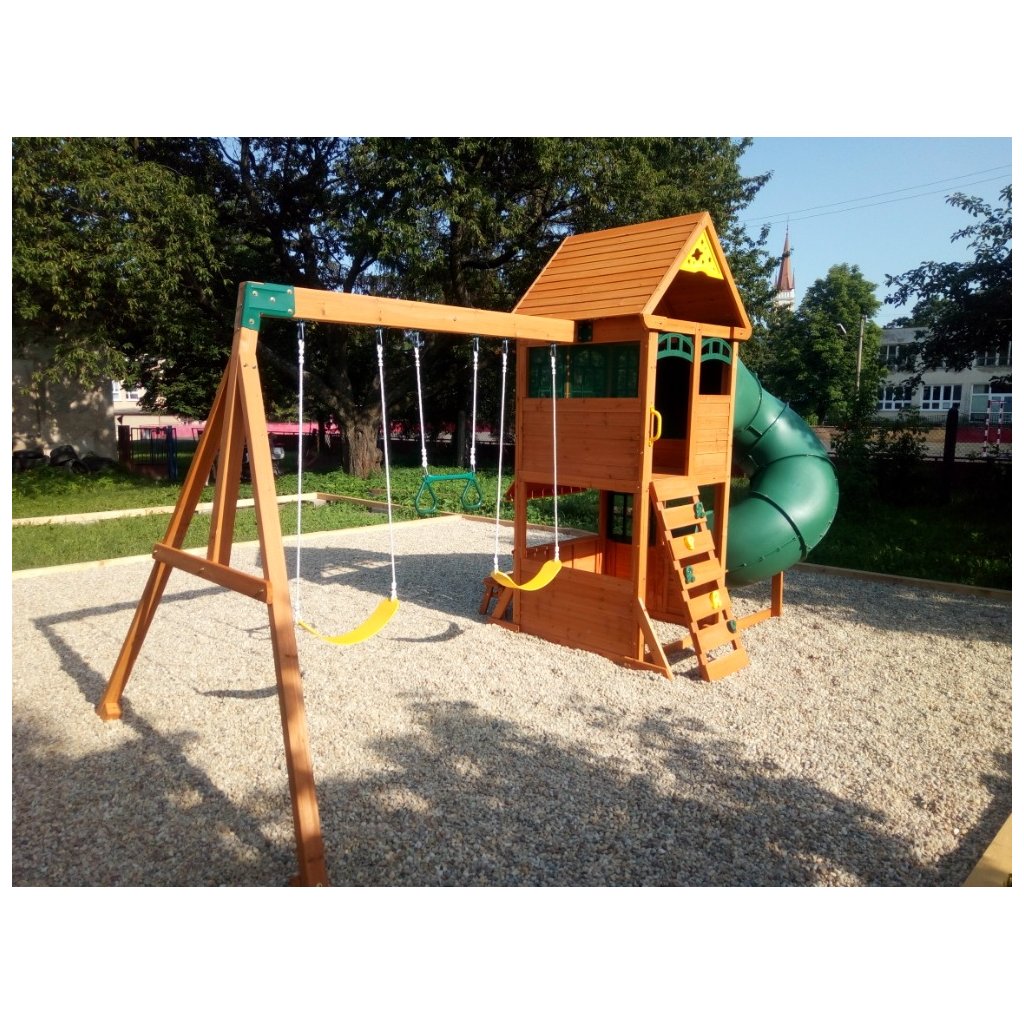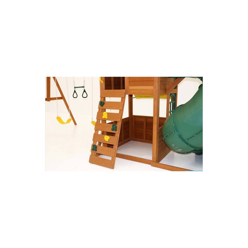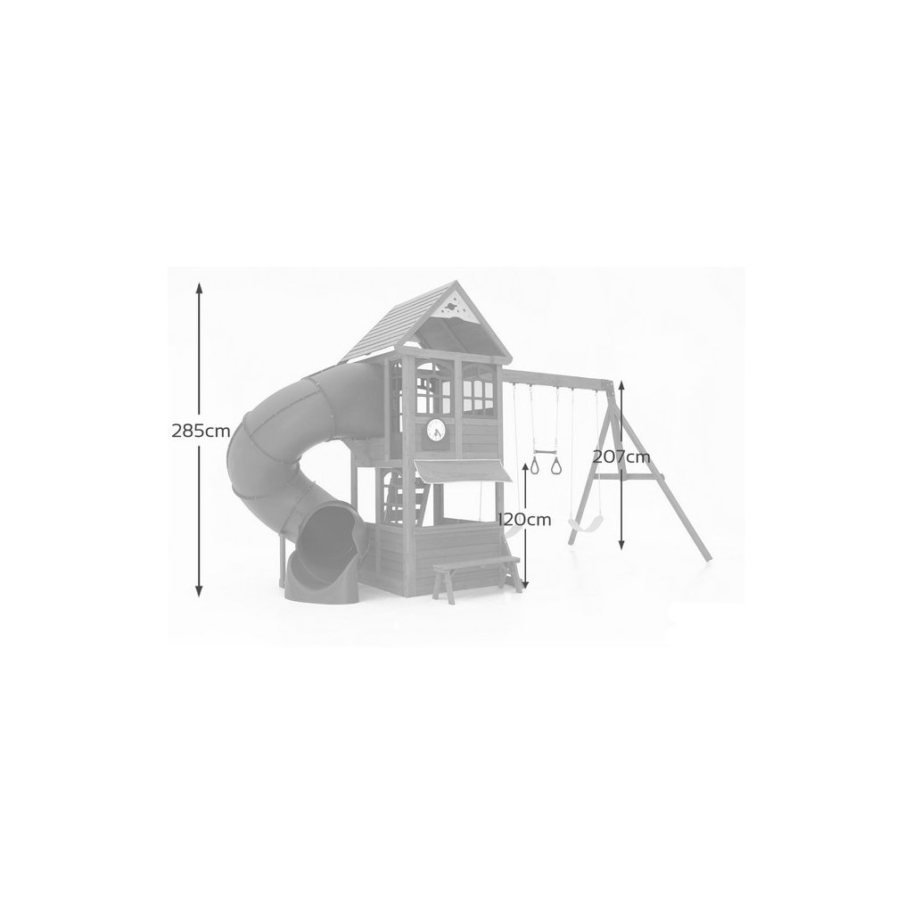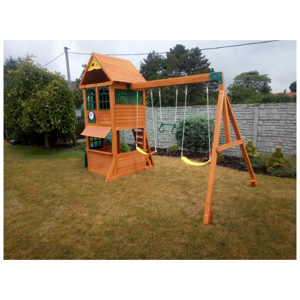Herná veža je rozšírená hojdačkovým modulom, na ktorom sú zavesené dva flexibilné hojdačkové sedáky zavesené na závesných lanách a hrazda Monkey Bar. Všetky plastové časti sú vyrobené z celoprefarbeného, ??stálofarebného, ??UV odolného plastu a sú určené na celoročné užívanie vonku. Súčasťou dodávky sú aj drevené zemné kotvy, na bezpečné uchytenie zostavy do terénu.