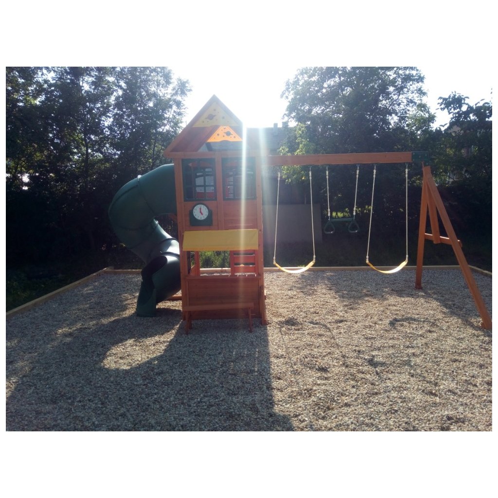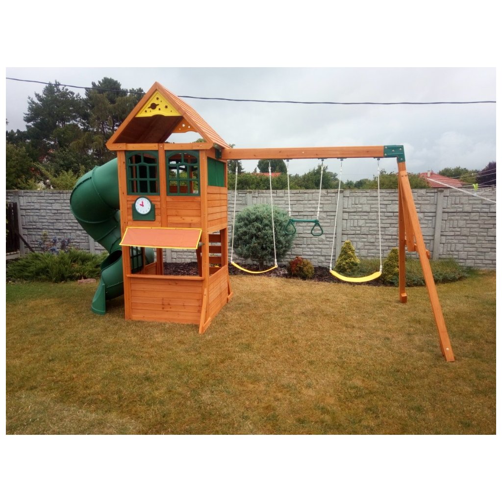 Najpredávanejšia zostava z cédrového dreva v dizajnovom zelenom prevedení s turbo tobogánom v dĺžke 365 cm, je rozšírená o masívny hojdačkový modul, s tromi kusmi závesných hojdačiek.