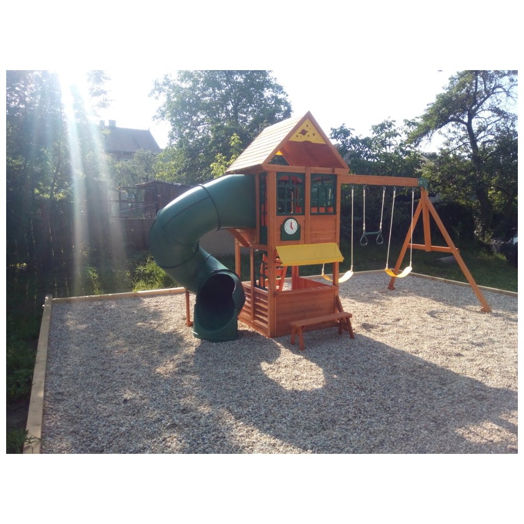 V spodnej časti hernej veže, ktorá je koncipovaná ako domček, je z prednej strany priestranný vchod do domčeka. Naproti je umiestnený pultík s drevenou lavicou, kde si deti môžu vychutnať popoludňajšiu desiatu.Herná veža je zastrešená masívnou drevenou strechou s netradičným vykýrom.Podesta vo výške 120 cm, je prístupná atypickou kombi ležiacou stenou (kombinácia drevených stupní s lezúcimi kameňmi). Z podesty vedie turbo tobogán s dĺžkou 365 cm, ktorý deťom poskytne neopakovateľný zážitok z jazdy.