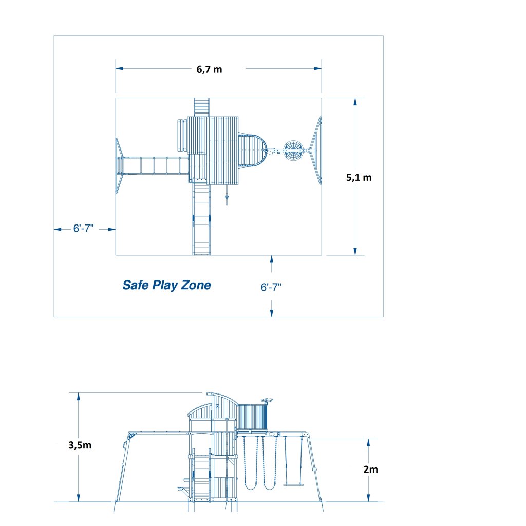 Luxusná herná veža je zastrešená dvojitou modernou oblúkovitou drevenou strechou, a je doplnená o vyvýšenú pozorovateľňu s ďalekohľadom, z ktorej budú mať deti báječný výhľad do okolia. Podesta vo výške 160 cm, je prístupná dreveným ležacím rebríkom. Pre zvýšenie bezpečnosti detí je rebrík vybavený masívnymi madlami, ďalšie madlá sú umiestnené aj pri vstupe do horného domčeka. Z protiľahlej strany je veža tiež prístupná po šplhacej kovovej špirálovej tyči, kde deti precvičia svoju fyzickú zdatnosť. Z podesty vedie šmykľavka v dĺžke 300cm, ktorá deťom poskytne neopakovateľný zážitok z jazdy. Horná časť veže je riešená ako domček, ktorý má vnútorný panel s oknom a rozdeľuje domček na dve časti na hranie az každej steny je okno pre krásny výhľad do okolia. Nachádza sa tu nástupná plošina na šmýkačku a výstup z rebríka a šplhacie kovové tyče. Zároveň môžu deti z domčeka prejsť cez rebrík s kovovými nástupmi na hornú pozorovateľňu, kde môžu ďalekohľadom pozorovať, čo sa v ich okolí deje. Spodnú časť domčeka tvorí priestor pre pieskovisko, nachádza sa tu aj pult s integrovanou lavicou, na ktorom si deti môžu napríklad pohodlne maľovať, či desiatovať. Herná veža je rozšírená tak obľúbeným ručkovacím modulom, z protiľahlej stany je potom veža rozšírená hojdačkovým modulom, na ktorom sú zavesené dva hojdačkové sedáky typu Prak a obľúbená hojdačka Hniezdo.