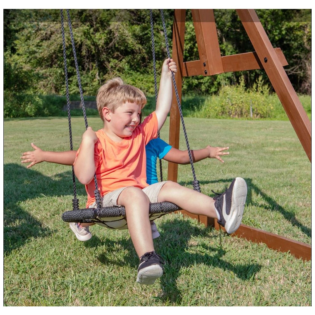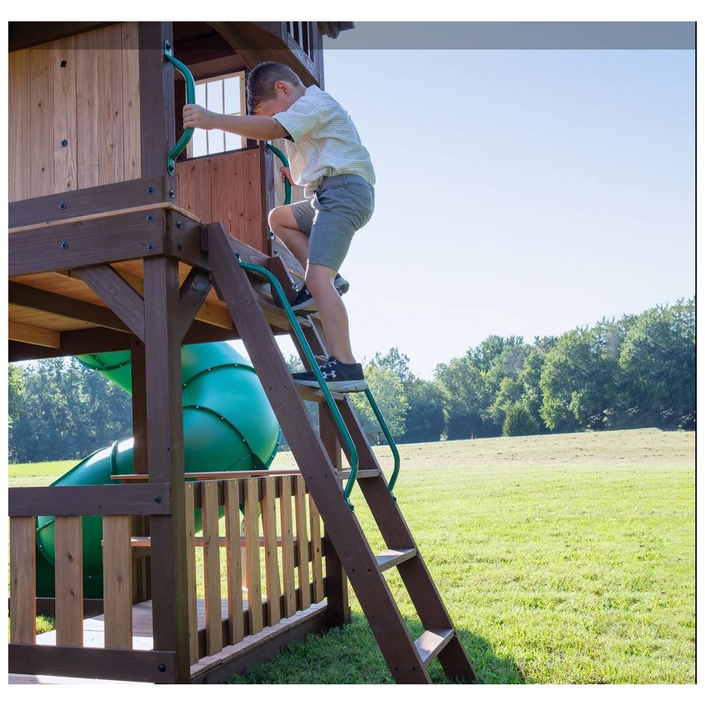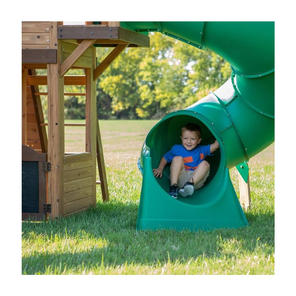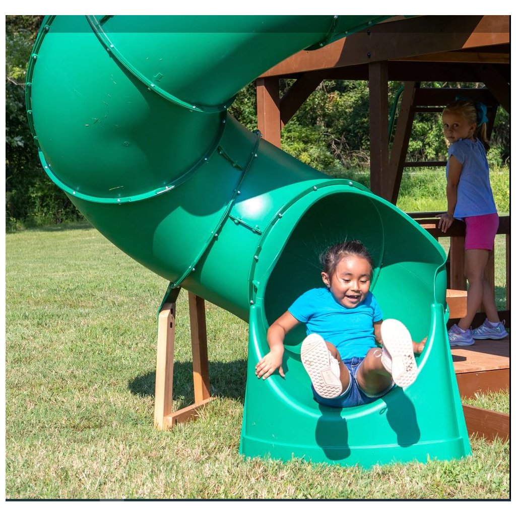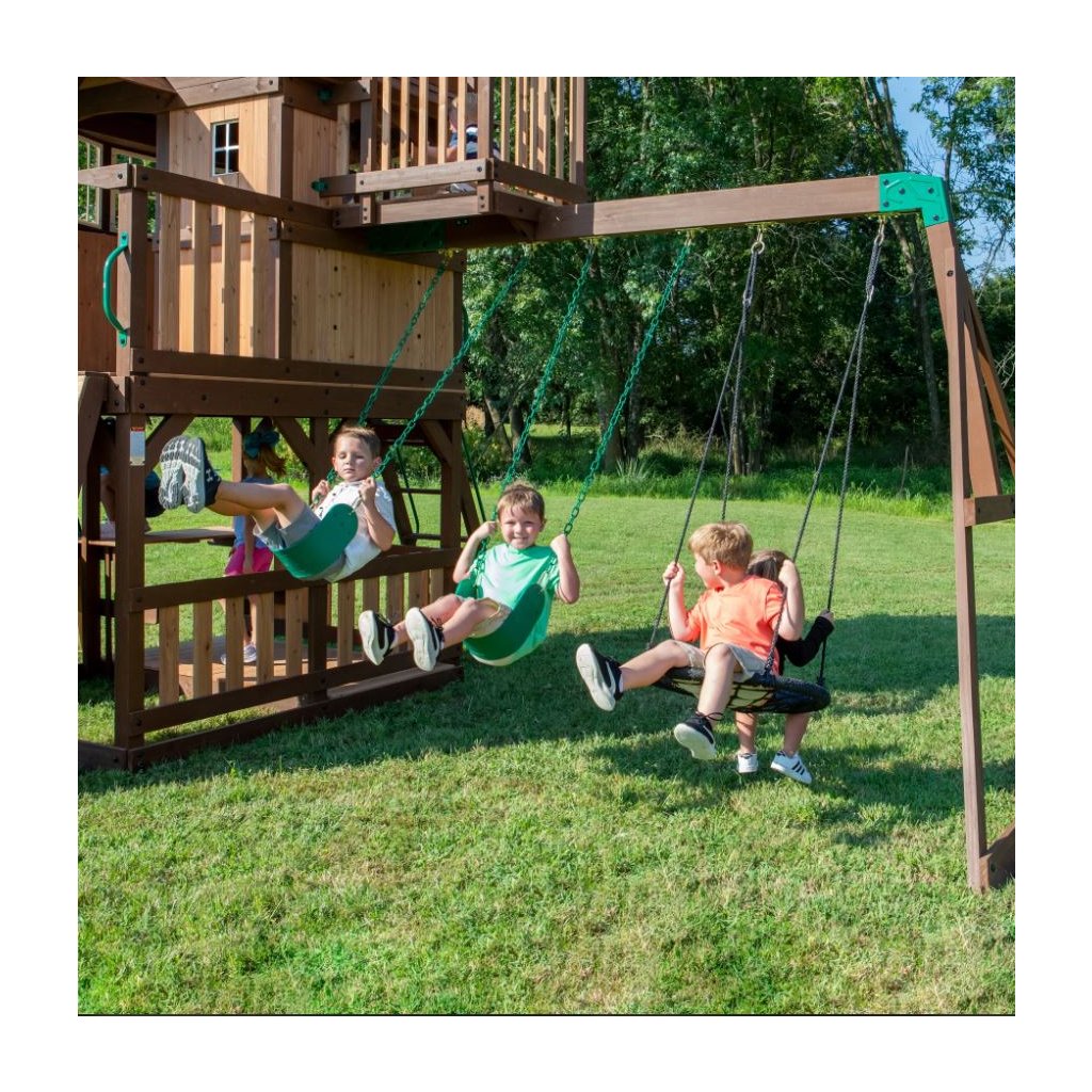 Zostava je jednopodlažná, s tobogánom o dĺžke 365cm a so šmykľavkou v dĺžke 300 cm, rozšírená o masívny hojdačkový modul s tromi kusmi závesných hojdačiek, a ručkovací modul.