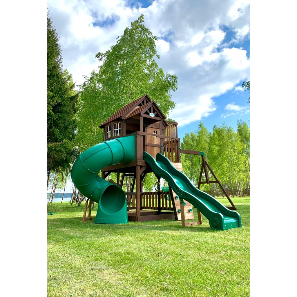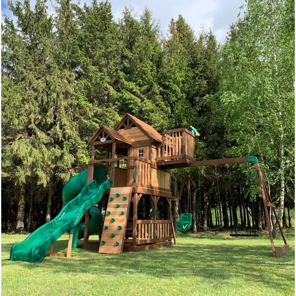 Luxusná herná veža je zastrešená dvojitou drevenou strechou, a je doplnená o vyvýšenú pozorovateľňu s ďalekohľadom, z ktorej budú mať deti báječný výhľad do okolia. Podesta vo výške 150 cm, je prístupná masívnou ležacou stenou doplnenou o plastové šplhacie body, z protiľahlej strany je podesta prístupná dreveným ležacím rebríkom. Pre zvýšenie bezpečnosti detí je rebrík vybavený masívnymi madlami, ďalšie madlá sú umiestnené aj pri vstupe do horného domčeka. Z podesty vedie šmykľavka v dĺžke 300cm, ktorá deťom poskytne neopakovateľný zážitok z jazdy. Najväčší zážitok bude pre deti jazda z TURBOTOBOGÁNU, ktorý vedie z podesty s dĺžkou 365cm. Horná časť veže je riešená ako domček, doplnená z dvoch strán vystupujúce okná rustikálneho typu, z protiľahlej stany je domček otvorený a nachádza sa tu nástupná plošina na šmýkačku, tobogán a výstup z leziacej steny. Spodnú časť domčeka tvorí priestor pre pieskovisko, nachádza sa tu aj pult s integrovanou lavicou, na ktorom si deti môžu napríklad pohodlne maľovať, či desiatovať. Herná veža je rozšírená tak obľúbeným ručkovacím modulom, z protiľahlej stany je potom veža rozšírená hojdačkovým modulom, na ktorom sú zavesené dva hojdačkové sedáky a obľúbená hojdačka hniezdo. Všetky plastové časti sú vyrobené z celoprefarbeného, ??stálofarebného, ??UV odolného plastu a sú určené na celoročné užívanie vonku. Súčasťou dodávky sú aj drevené zemné kotvy, na bezpečné uchytenie zostavy do terénu.