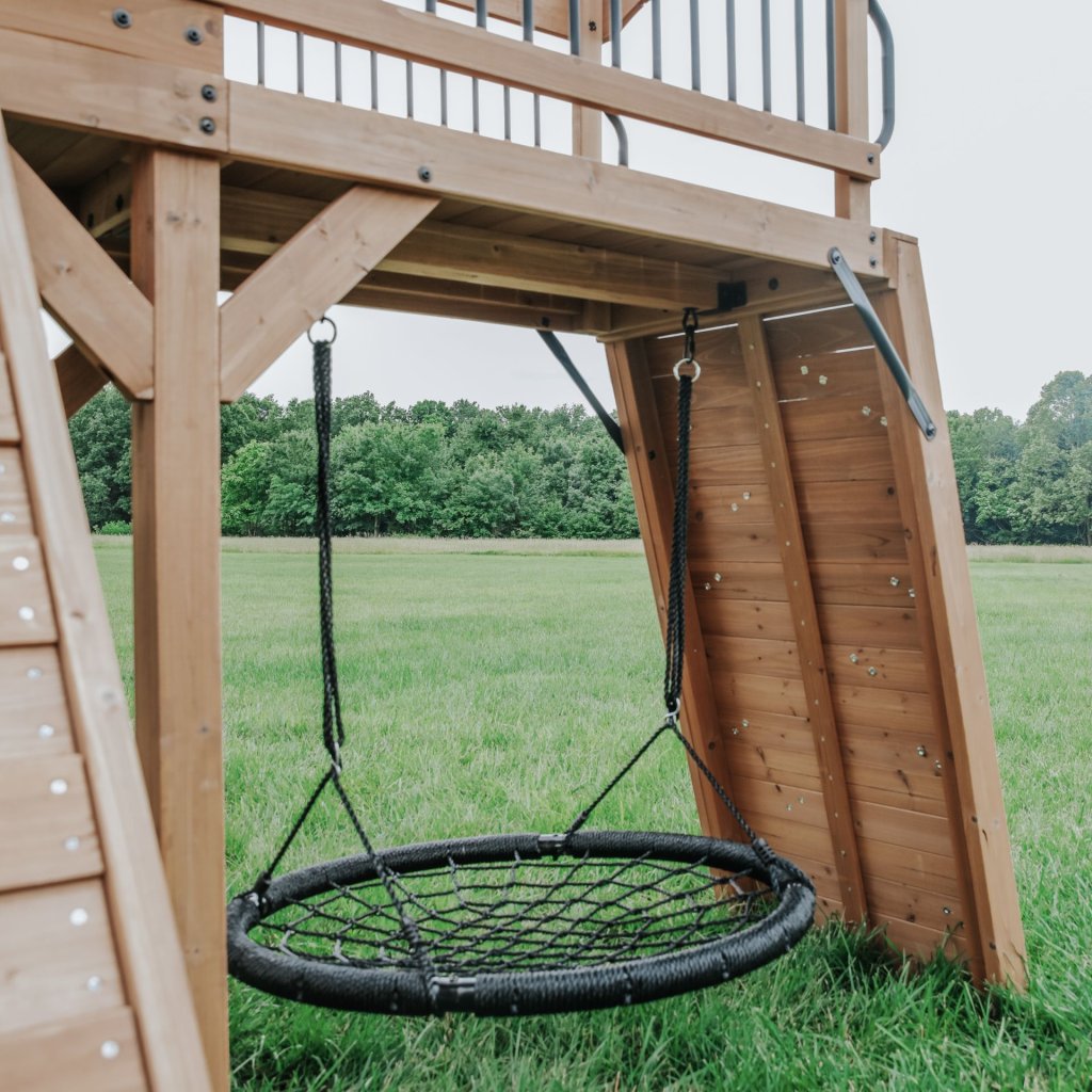 Pre zvýšenie bezpečnosti je zostava vybavená XXL kovovými madlami, plotmi terasy kovovými šprušľami, vďaka ktorým nielen, že pôsobí vzdušným dojmom, ale umožnuje výhľad deťom aj rodičom.