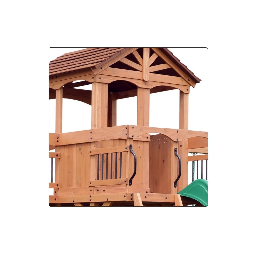 Zostava veľmi komfortných rozmerov je jednopodlažná, so šmykľavkou s dĺžkou 290cm. Horná veža je rozšírená o priestranný balkón a masívny hojdačkový modul, s tromi kusmi závesných hojdačiek.