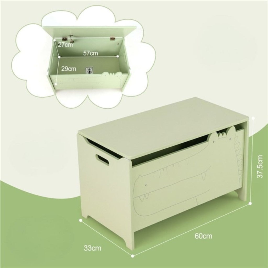 Detský úložný box na hračky v jemnej svetlo zelenej farbe s veselým motívom krokodíla je ideálnym riešením pre ukladanie hračiek, plyšákov, knižiek aj ďalších pokladov vašich najmenších. Vďaka svojmu hravému dizajnu si ho deti okamžite obľúbia a upratovanie pre nich prestane byť nudnou povinnosťou. Veselá kresba krokodíla na čelnej strane truhlice vytvára príjemnú a priateľskú atmosféru, ktorá skvele zapadne do každej detskej izby. Box je vyrobený z kvalitnej MDF dosky, ktorá zaručuje pevnosť, stabilitu a dlhú životnosť. Povrch je hladko lakovaný, čo uľahčuje údržbu - stačí utrieť vlhkou handričkou. Dômyselná konštrukcia veka je vybavená bezpečnostným pántom, ktorý zabraňuje náhlemu zatvoreniu a tým chráni detské prstíky pred privretím. Bočné výrezy slúžia ako praktické madlá pre ľahké prenášanie, takže box je možné jednoducho premiestniť kamkoľvek je potrebné – do izbičky, herne alebo obývacej izby. Vďaka svojmu priestrannému vnútrajšku poskytuje dostatok miesta na uloženie najrôznejších hračiek a pomáha udržať poriadok v detskom svete. Tento box nie je len praktickým úložným priestorom, ale aj štýlovým doplnkom, ktorý podporuje deti v samostatnosti a zábavnom prístupe k upratovaniu. Je vhodný pre deti od troch rokov a spĺňa bežné bezpečnostné štandardy. Či už hľadáte funkčné úložné riešenie alebo len chcete urobiť radosť svojmu dieťaťu originálnym kusom nábytku, tento detský box na hračky je skvelou voľbou, ktorá spája praktickosť, bezpečnosť a hravý design. Parametre: Materiál: MDF Rozmery: 60 x 33 x 37,5 cm Hmotnosť: 7,5 kg Farba: zelená Vnútorné rozmery: Rozmery 57 x 29 x 27 cmDodatočné parametre