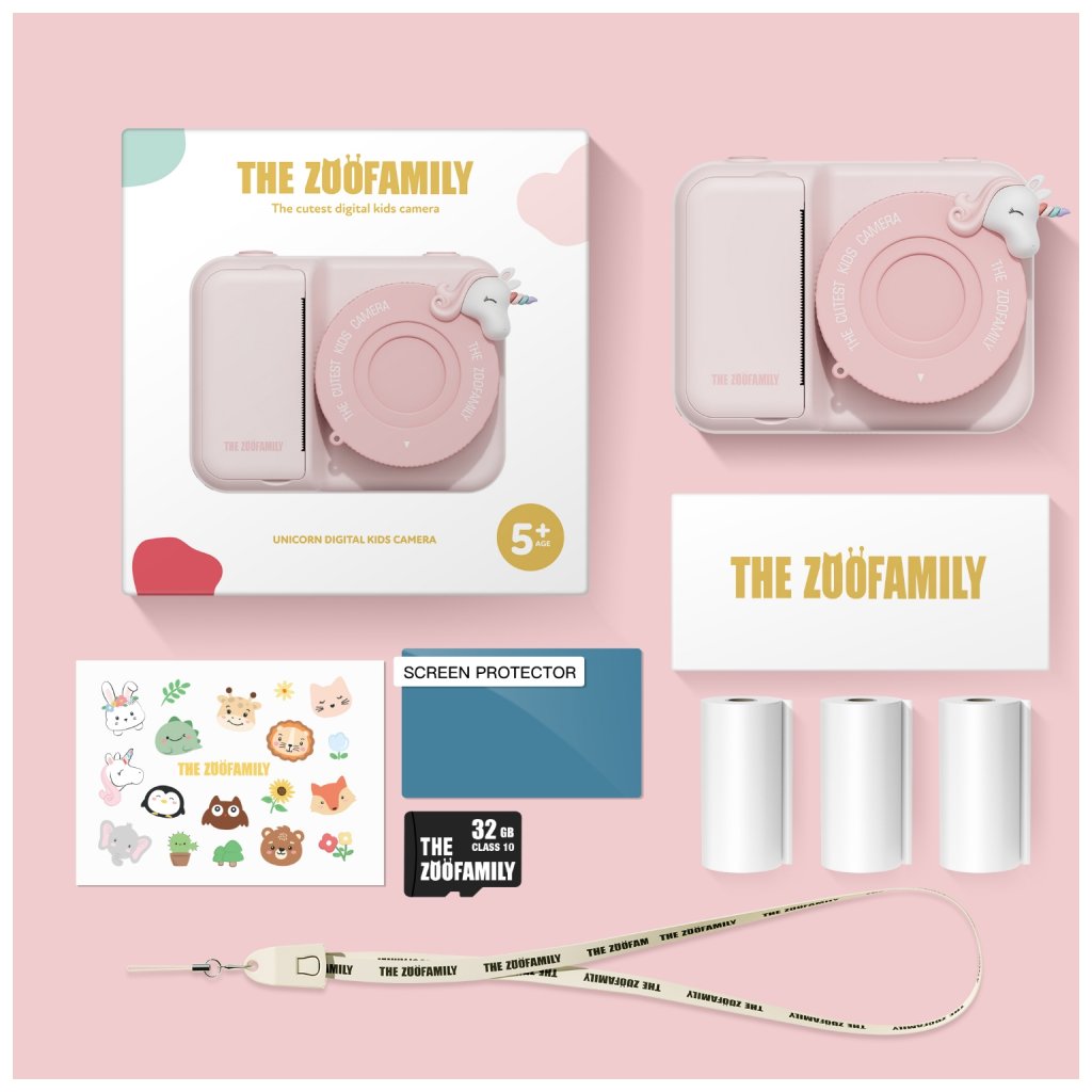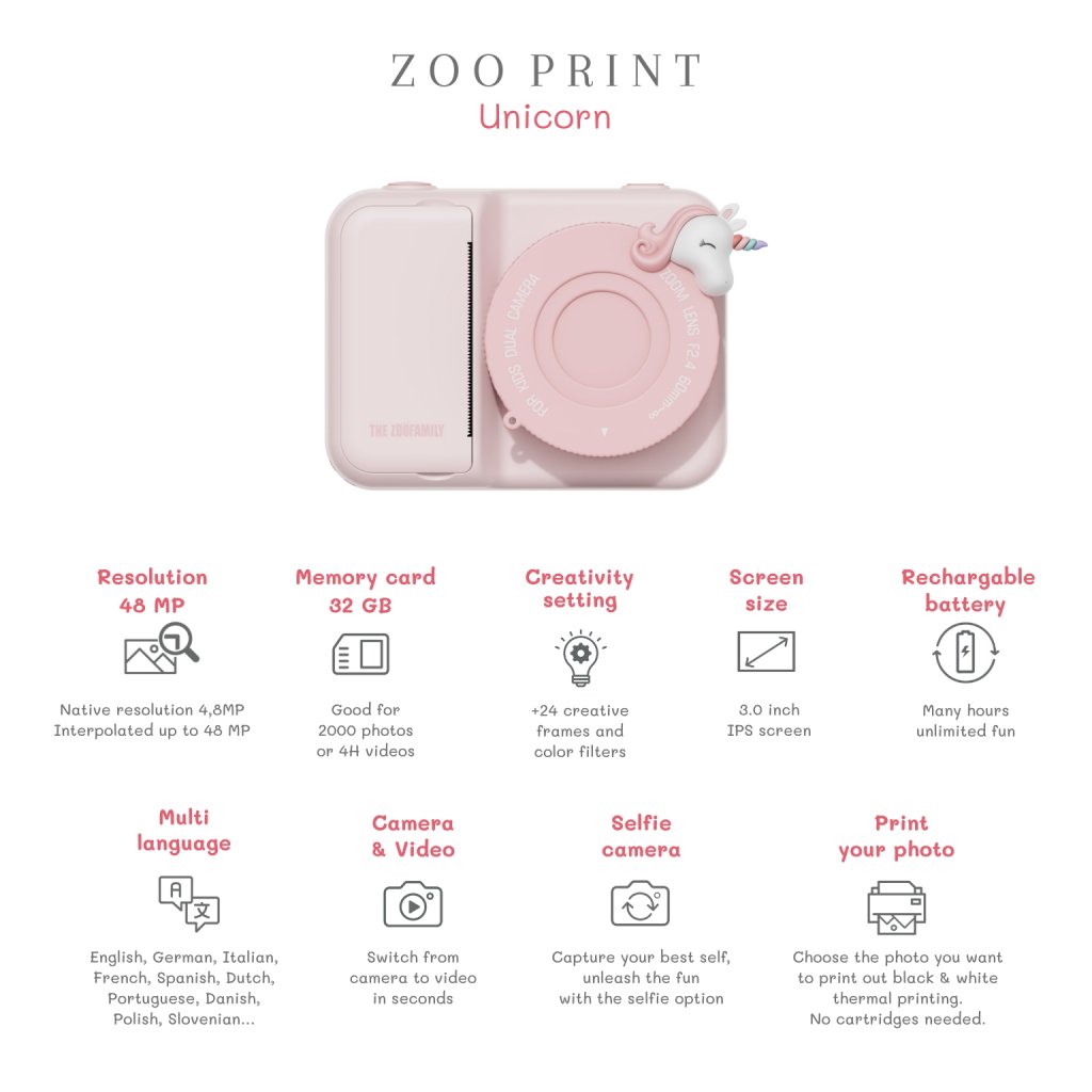 Detský 48-megapixelový digitálny fotoaparát Unicorn od Zoofamily, vďaka hravosti a inovatívnych funkcií, objavia vaši fotografi kúzlo fotiek, podporujeme kreativitu a fantáziu. Štýlový fotoaparát okamžite tlačí čiernobiele fotografie alebo ich ukladá pre neskoršiu tlač. S technológiou tepelný prenos nepotrebujete drahé atramentové kazety. Fotoaparát má jasný 3-palcový farebný displej, ochranu objektívu a vysoké rozlíšenie tlače. Fotoaparát je vhodný pre deti od 5 rokov a vďaka kompaktným rozmerom 12 × 9 × 5 cm je ľahký, odolný a ľahko ovládateľný. Balenie obsahuje 3 role pre tlač asi 225 fotografií., 32 GB pamäťová karta pre ukladanie 2000 fotografií alebo 4 hodiny videa a multifunkčný náhrdelník, ktorý slúži aj ako nabíjací kábel. Zábavné rámčeky a samolepky pridajú vašim fotografiám jedinečný štýl. Malí kreatívci určite ocenia možnosť zaobstarania selfie. Fotoaparát je vhodné doplniť sadou Náhradných papierov, ktoré môžete objednať v sekcii súvisiaci tovar, vďaka ktorej získate priestor na tlač až 225 fotografií. Využite možnosti vytlačiť si spomienku alebo dôležitý okamih len za 0,03€ - v prípade tlače na obyčajný fotopapier alebo 0,04€ - v prípade tlače na samolepiaci fotopapier (prepočítané na 1 fotografiu), hneď, z pohodlia vášho domova, vonku, na oslave, obdarujte krásnymi momentkami svojich najbližších. Parametre: Rozlíšenie: 48 MP (interpolované) s vysoko kvalitnou tlačou. Displej: Farebný 3-palcový displej pre jednoduché ovládanie. Vlastnosti: Fotoaparát, tlačiareň a videokamera v jednom, USB-C. Obsah balenia: 32GB pamäťová karta, 3 rolky papiera na 225 fotografií, multifunkčný náhrdelník/nabíjací kábel. Tlač: Nízke náklady na tlačDodatočné parametre