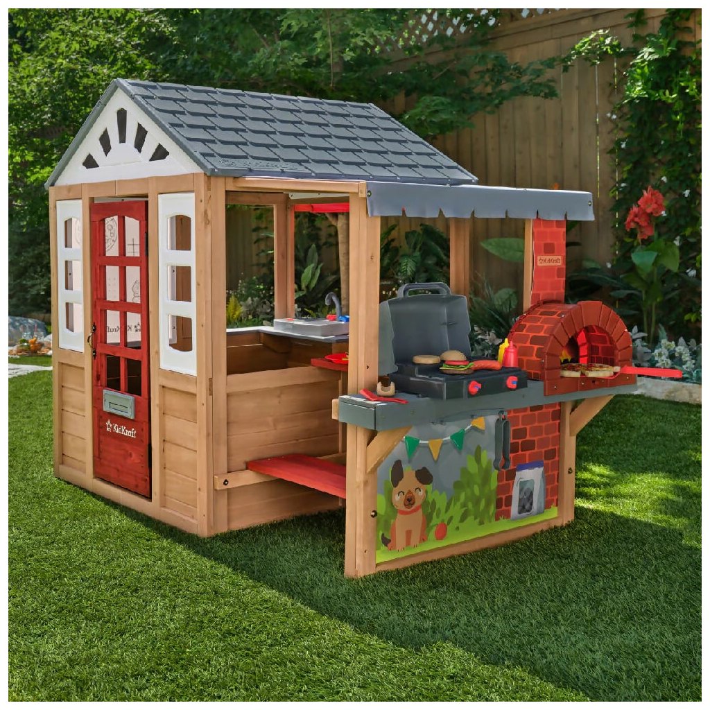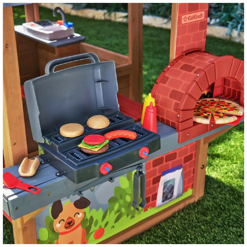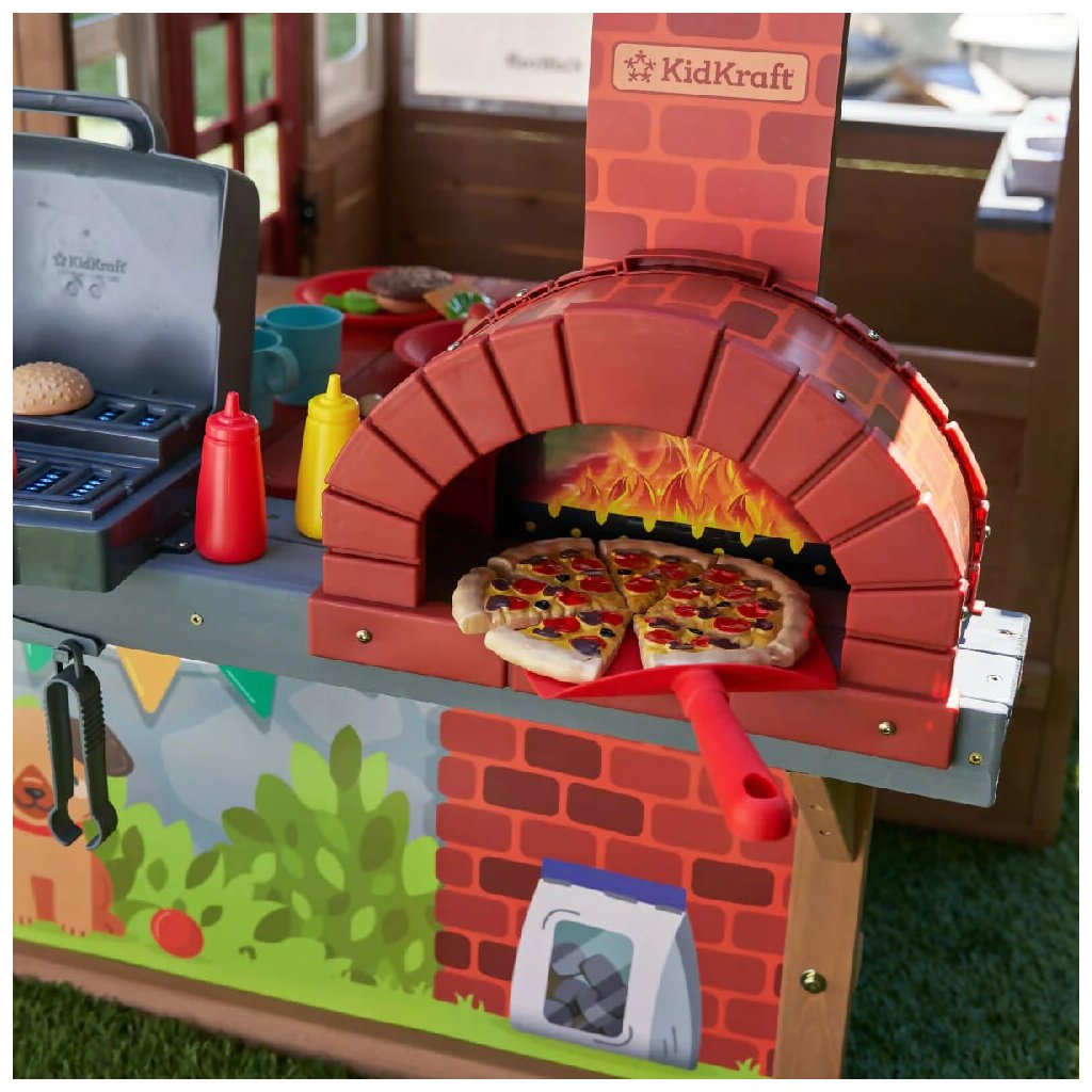 Detský domček Grill & Chill Pizza Party (186.99 x 122.0 x 138.99 cm) Detský domček Grill & Chill Pizza Party je rozprávkový sen všetkých detí. Vstúpte do sveta detskej fantázie s týmto nádherným záhradným domčekom, ktorý je navrhnutý tak, aby malým dobrodruhom ponúkol nielen útočisko na hranie, ale aj priestor pre kreativitu a zábavu na čerstvom vzduchu. Domček kombinuje klasický dizajn so zábavnými funkčnými prvkami, vďaka ktorým sa deti môžu hrať na kuchára, majiteľa reštaurácie, pekára alebo jednoducho len užívať vlastný útulný domček na dvore. Domček je vyrobený z kvalitného, odolného dreva, ktoré zaisťuje stabilitu a dlhú životnosť. Vďaka realistickému prevedeniu strechy, okien a dverí pôsobí ako skutočný malý domček. Farebné detaily, maľované múry so zvieratkami a tehlová dekorácia komína dodávajú celému setu osobitý a hravý vzhľad. Na jednej strane domčeka sa nachádza vonkajšia herná kuchynka s imitáciou grilu, pracovnou doskou a tehlovou pecou na pizzu. Súčasťou sú aj herné doplnky ako umelé hamburgery, pizze alebo grilovacie náčinie. Deti sa tak môžu hrať na kuchárov, ktorí pripravujú dobroty pre svojich kamarátov alebo rodinu. Domček je vyrobený z kvalitného cédrového dreva, ktoré je ešte ošetrené impregnačnou povrchovou lazúrou. Celá zostava je vyrobená z luxusného cédrového dreva, ktoré patrí k veľmi odolným drevinám, je nesmierne trvanlivé, odolné proti škodcom, plesniam a hnilobe. Cédrové drevo Vás však očarí aj nádhernou kresbou a neopakovateľnou vôňou. Dodávka obsahuje: cédrové drevo, nakrátené na potrebné dĺžky škatuľu obsahujúcu kompletný montážny materiál Montážny návod Zostavu zostavíte pomocou návodu Step by Step. Dovoľujeme si Vám odporučiť využitie služieb našich montážnych špecialistov za akčnú cenu. Domček si tiež môžete zatraktívniť radom doplnkov z kategórie: Príslušenstvo k domčekom POKYNY PRE MONTÁŽ Ihriská z cédra sú určené pre celoročné vonkajšie používanie výhradne v privátnom sektore. Cédrové drevo odporúčame 1x ročne ošetrovať olejovou emulziou, či emulziou na vodnej báze určenou na ochranu cédrového dreva, značkou Osmo. Zostavu je možné umiestniť na trávu, piesok, kačírok či mulčovaciu kôru, nikdy ihrisko neinštalujte na tvrdé podložie, ako je asfalt či betón. Šmykľavku a ostatné plastové časti stačí umyť mydlovou vodou. Môžu byť ponechané celoročne vonku. Doplňujúce informácie k parametrom Prečo si vybrať detské ihrisko z luxusného cédrového dreva?Dodatočné parametre