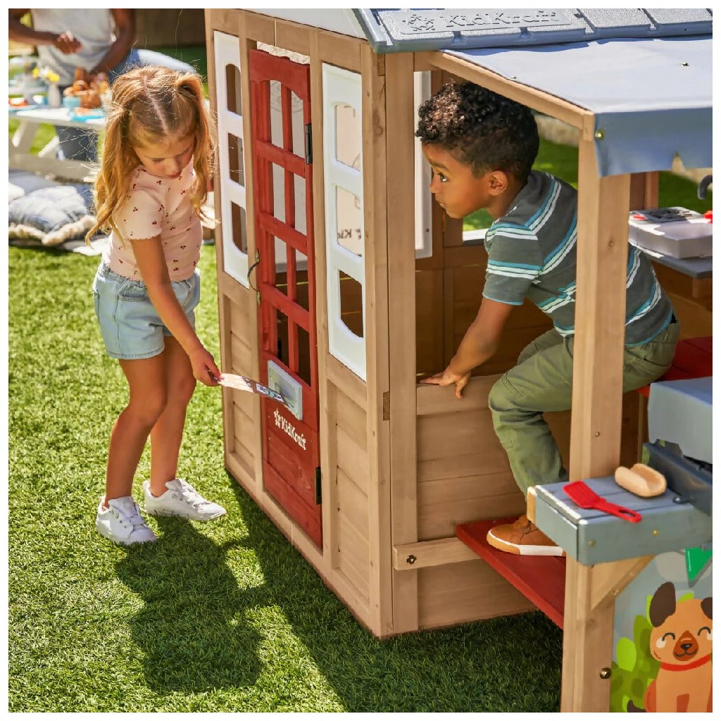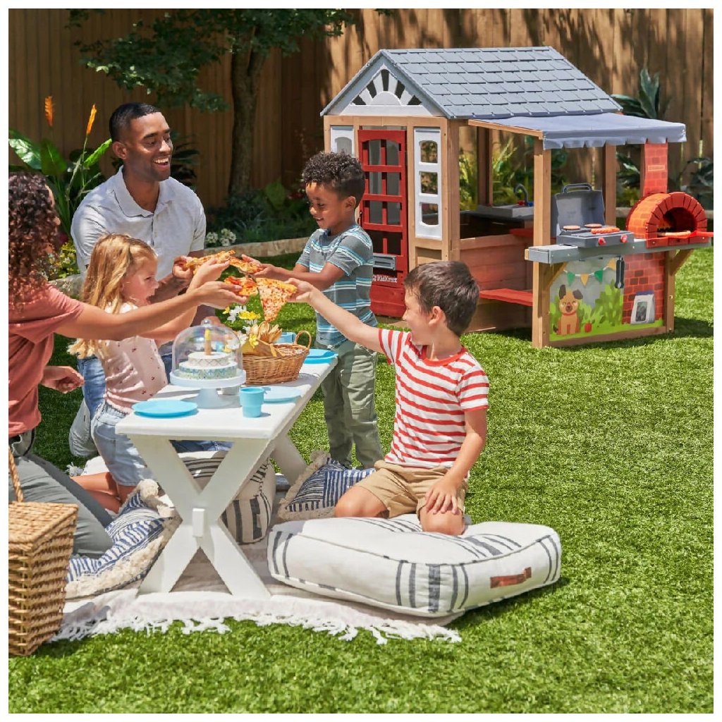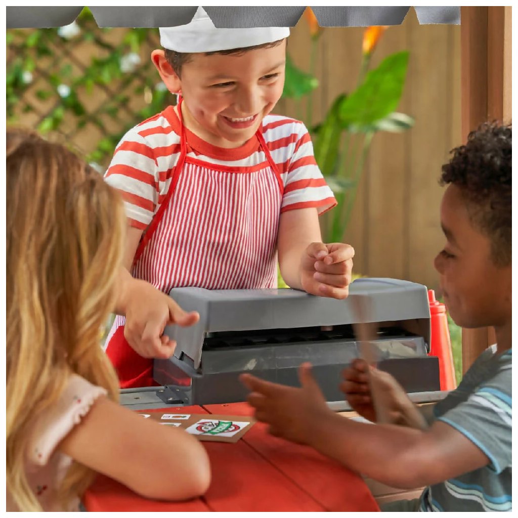Detský domček Grill & Chill Pizza Party (186.99 x 122.0 x 138.99 cm) Detský domček Grill & Chill Pizza Party je rozprávkový sen všetkých detí. Vstúpte do sveta detskej fantázie s týmto nádherným záhradným domčekom, ktorý je navrhnutý tak, aby malým dobrodruhom ponúkol nielen útočisko na hranie, ale aj priestor pre kreativitu a zábavu na čerstvom vzduchu. Domček kombinuje klasický dizajn so zábavnými funkčnými prvkami, vďaka ktorým sa deti môžu hrať na kuchára, majiteľa reštaurácie, pekára alebo jednoducho len užívať vlastný útulný domček na dvore. Domček je vyrobený z kvalitného, odolného dreva, ktoré zaisťuje stabilitu a dlhú životnosť. Vďaka realistickému prevedeniu strechy, okien a dverí pôsobí ako skutočný malý domček. Farebné detaily, maľované múry so zvieratkami a tehlová dekorácia komína dodávajú celému setu osobitý a hravý vzhľad. Na jednej strane domčeka sa nachádza vonkajšia herná kuchynka s imitáciou grilu, pracovnou doskou a tehlovou pecou na pizzu. Súčasťou sú aj herné doplnky ako umelé hamburgery, pizze alebo grilovacie náčinie. Deti sa tak môžu hrať na kuchárov, ktorí pripravujú dobroty pre svojich kamarátov alebo rodinu. Domček je vyrobený z kvalitného cédrového dreva, ktoré je ešte ošetrené impregnačnou povrchovou lazúrou. Celá zostava je vyrobená z luxusného cédrového dreva, ktoré patrí k veľmi odolným drevinám, je nesmierne trvanlivé, odolné proti škodcom, plesniam a hnilobe. Cédrové drevo Vás však očarí aj nádhernou kresbou a neopakovateľnou vôňou. Dodávka obsahuje: cédrové drevo, nakrátené na potrebné dĺžky škatuľu obsahujúcu kompletný montážny materiál Montážny návod Zostavu zostavíte pomocou návodu Step by Step. Dovoľujeme si Vám odporučiť využitie služieb našich montážnych špecialistov za akčnú cenu. Domček si tiež môžete zatraktívniť radom doplnkov z kategórie: Príslušenstvo k domčekom POKYNY PRE MONTÁŽ Ihriská z cédra sú určené pre celoročné vonkajšie používanie výhradne v privátnom sektore. Cédrové drevo odporúčame 1x ročne ošetrovať olejovou emulziou, či emulziou na vodnej báze určenou na ochranu cédrového dreva, značkou Osmo. Zostavu je možné umiestniť na trávu, piesok, kačírok či mulčovaciu kôru, nikdy ihrisko neinštalujte na tvrdé podložie, ako je asfalt či betón. Šmykľavku a ostatné plastové časti stačí umyť mydlovou vodou. Môžu byť ponechané celoročne vonku. Doplňujúce informácie k parametrom Prečo si vybrať detské ihrisko z luxusného cédrového dreva?Dodatočné parametre