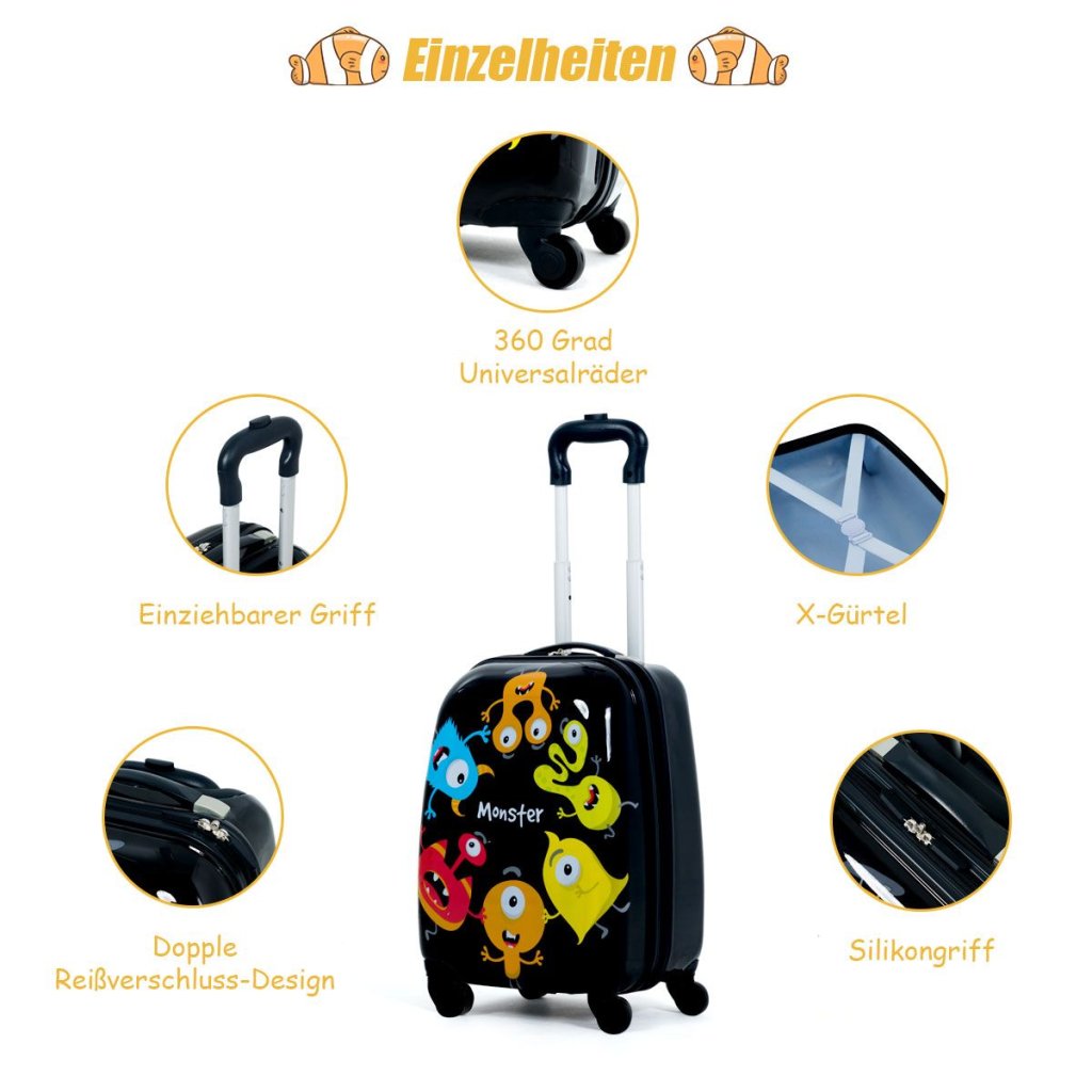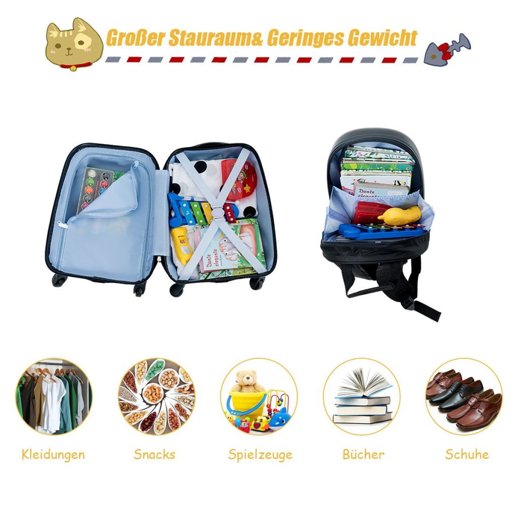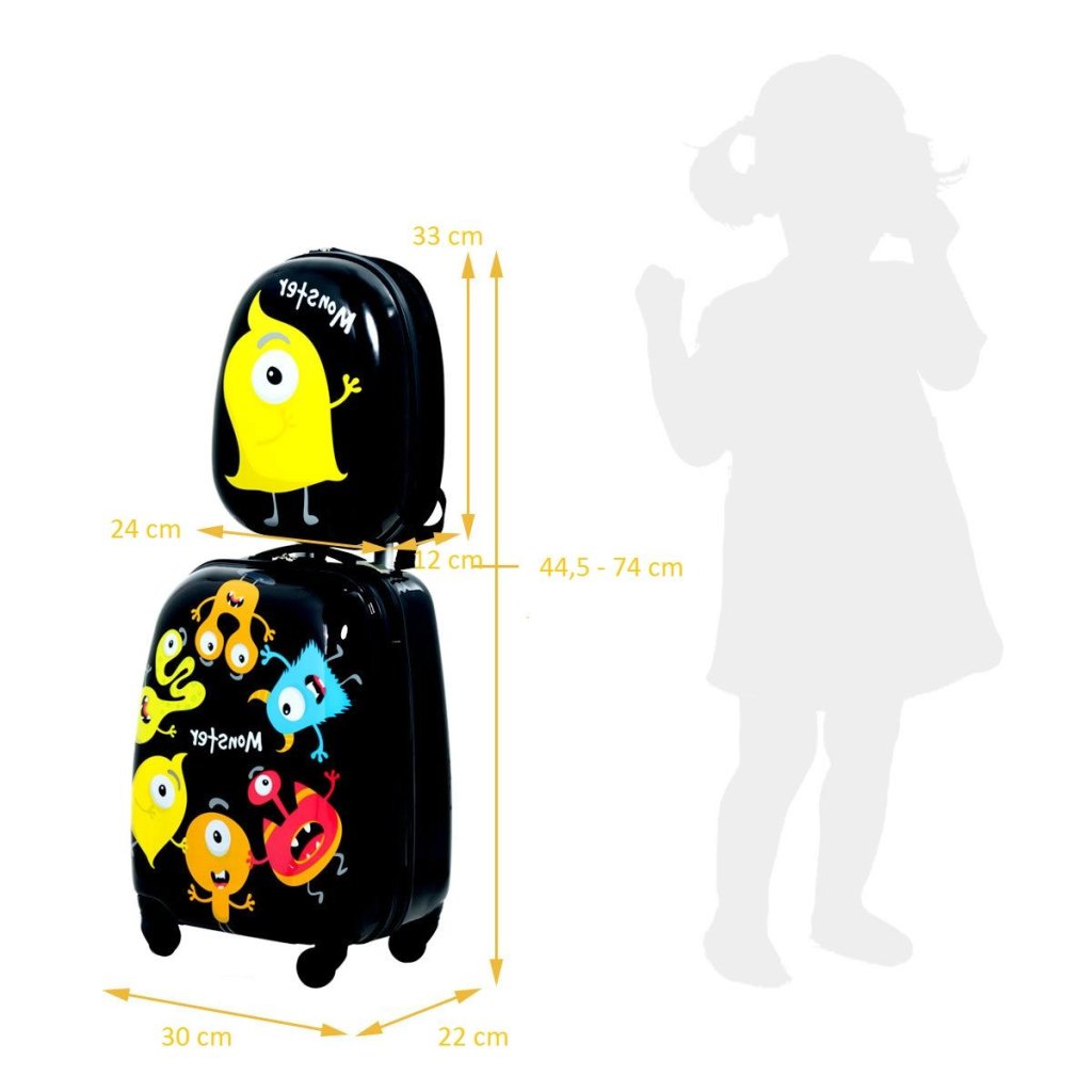 Táto sada obsahuje kufor na kolieskach a batoh, ktorá je vyrobená z vysoko kvalitných materiálov. Kufor aj batoh má krásne a farebné vzory, ktoré si Vaše deti zamilujú. Detský kufor má nízku hmotnosť a deti môžu kufor ľahko ťahať. Kufor má prehľadný úložný priestor, ktorý umožňuje deťom úhľadne zabaliť všetky veci. Súprava je vodotesná a ľahko sa čistí, má stabilnú konštrukciu a vysoko kvalitný materiál. Kufor má otočné kolieska a výškovo nastaviteľnú tyč. Detský kufor aj batoh má krásny vzhľad a táto sada je ideálnym darčekom pre deti. Farba: čierna Materiál: ABS, PC, hliník Rozmery kufra: 30 cm x 22 cm x 44,5 cm Rozmery plecniaka: 24 cm x 12 cm x 33 cm Odporúčaný vek: od 3 rokov Hmotnosť: 2,7 kgDodatočné parametre