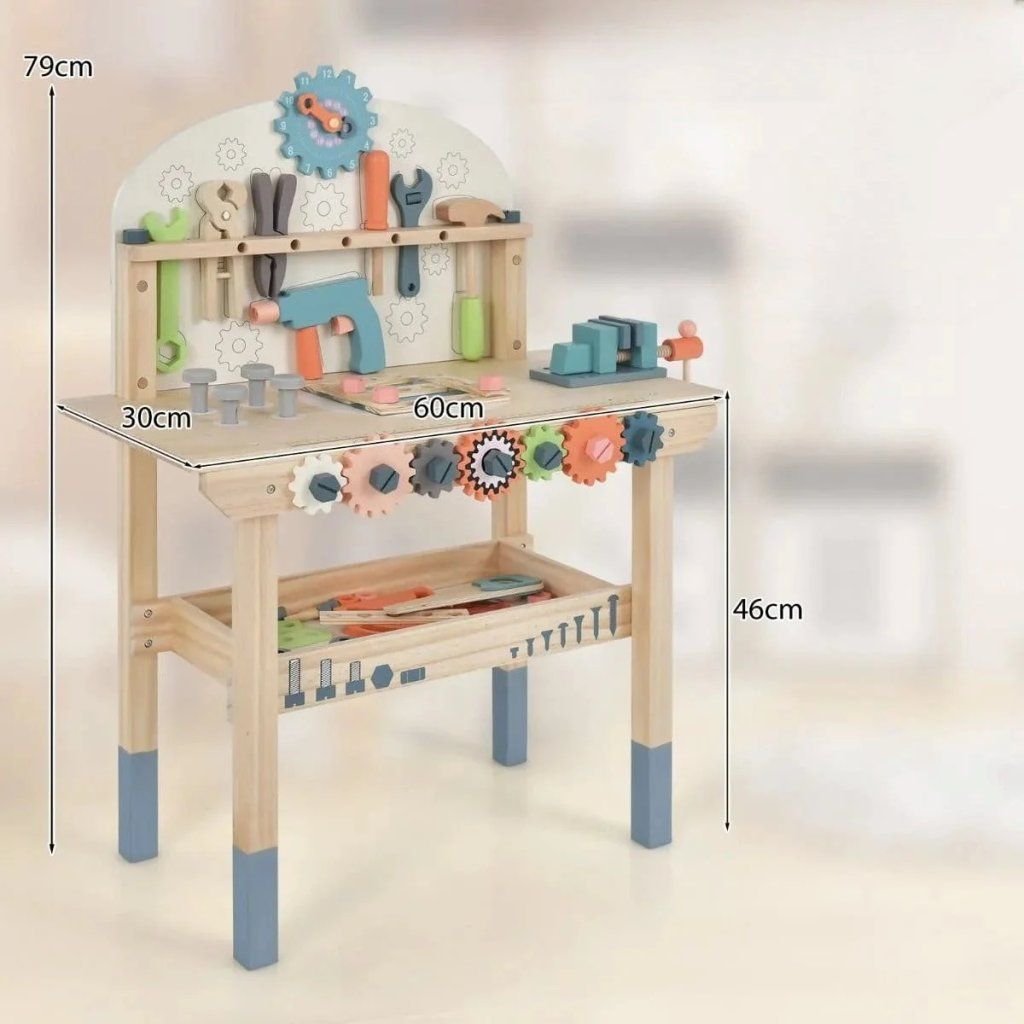 Na našom pracovnom stole môžu deti rezať drevo, skrutkovať, používať dielenské kľúče, zatloukat hřebíky alebo merať predmety ako dospelí kutilové. Okrem toho sú tu také hodiny, ktoré učia deti času. Po hraní môžu deti ukladať nástroje a príslušenstvo na hornú a spodnú policu. Pracovný stôl pre deti je podepren 4 robustnými drevenými nohami, ktoré zaisťujú najlepšiu možnou stabilitu. Detský pracovný stôl obsahuje 8 drevených nástrojov, vrátane pily, skrutkováku, kladiva, sveráku a dvoch kľúčov. Vďaka tomu sa vaše dieťa bude môcť naučiť používať základné pomôcky a zlepšiť svoju obratnosť a motorickú koordináciu. Děti popustit uzdu své fantazii a vytvořit si fotorámeček, nádrž, závodní auto mohou nebo jiné předměty. Náš drevený pracovný stôl je vybavený magnetickým prvkom pre usporiadanie vášho náradia a veľkej polície pre uloženie všetkého príslušenstva. Vďaka magnetickému designu mohou děti nářadí snadno uložit na své místo. Otvorený design spodná polícia deťom prístup ku všetkým ich nezbytnostem. Pracovní stôl je vyrobený z masívneho dreva, ktorý je odolný a bezpečný. Zaoblené rohy a hrany bez trisek zabraňujú náhodným nárazom alebo poškrabaniu. Drevené hodiny a otáčecí ozubená kola pomáhajú zlepšiť jemnú motoriku detí. Parametre: Rozmery: 60 x 30 x 79 cm, doska stola je vysoká 46 cm Materiál: masívne drevoDodatočné parametre