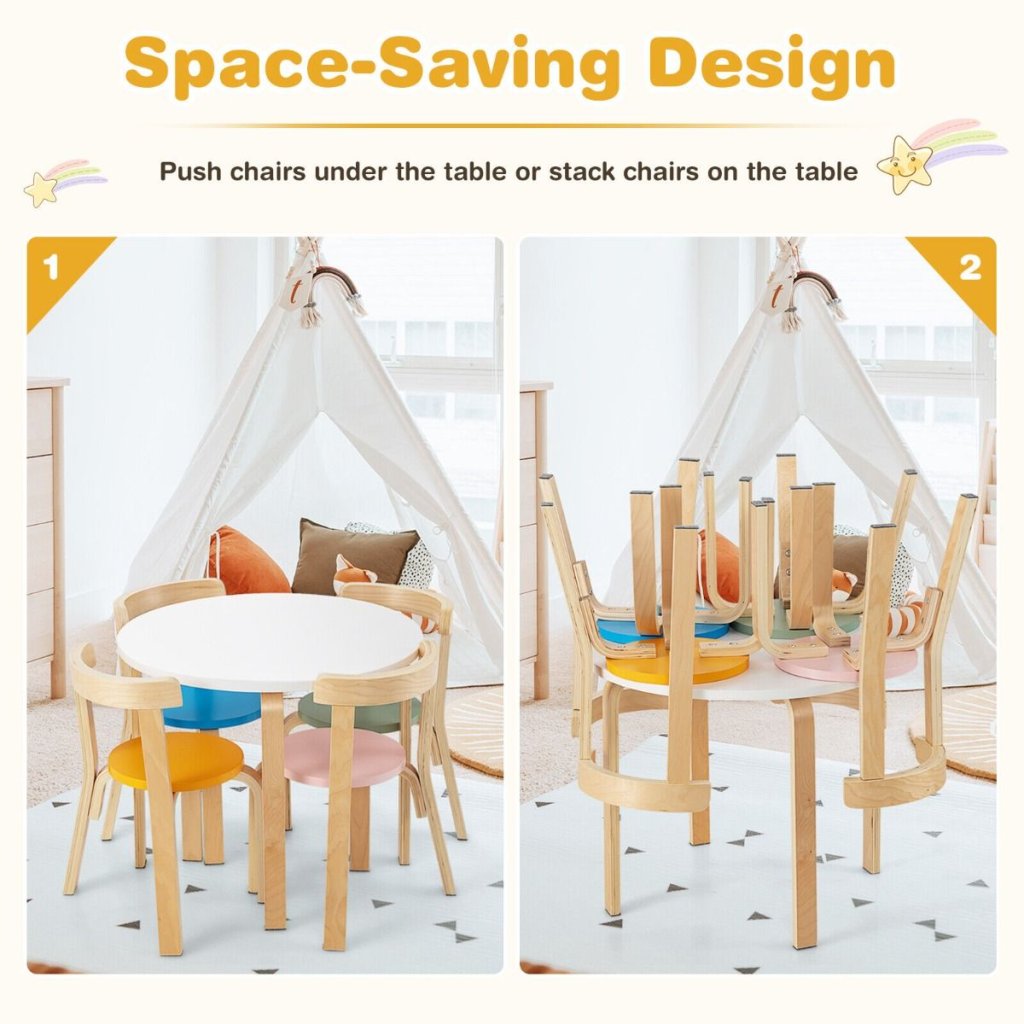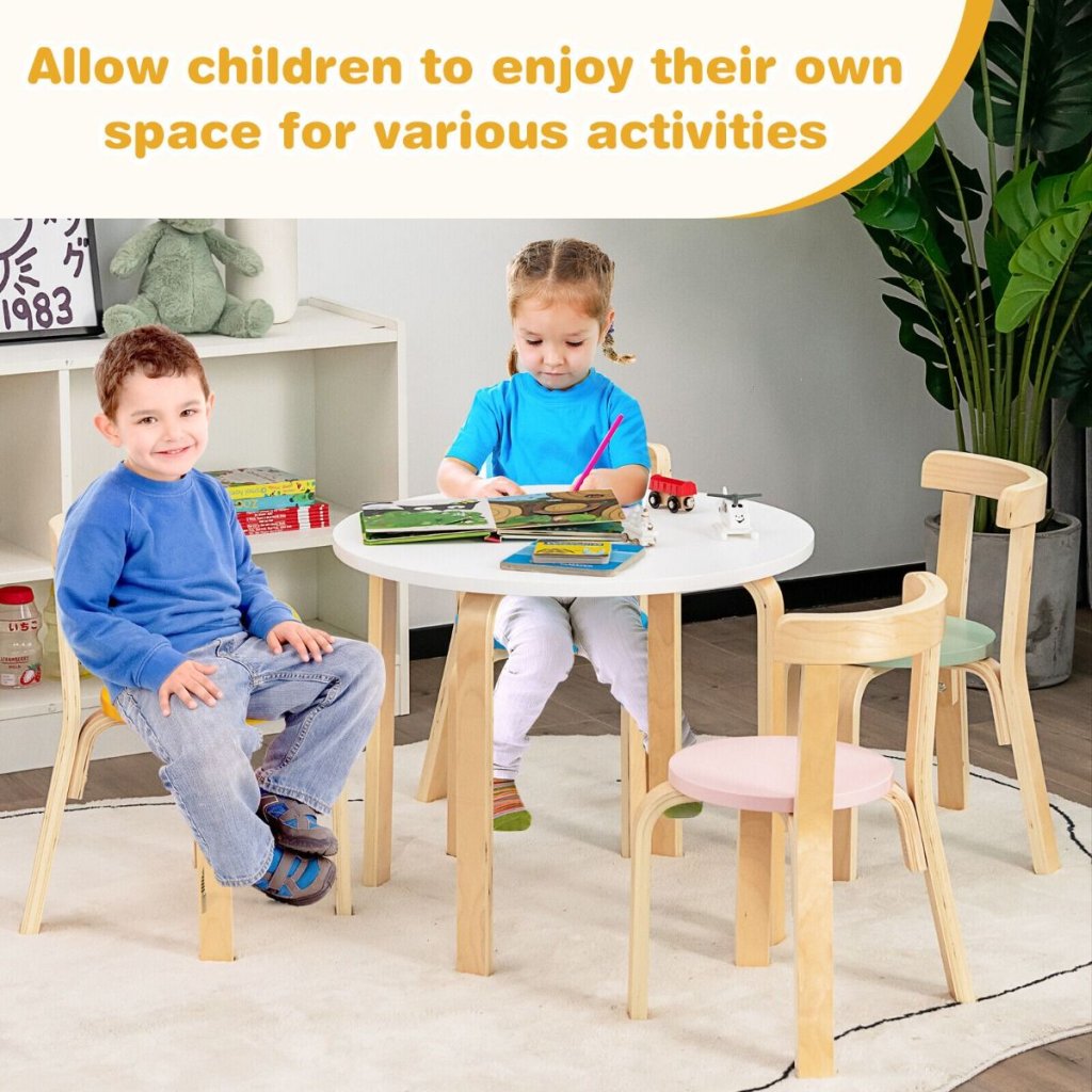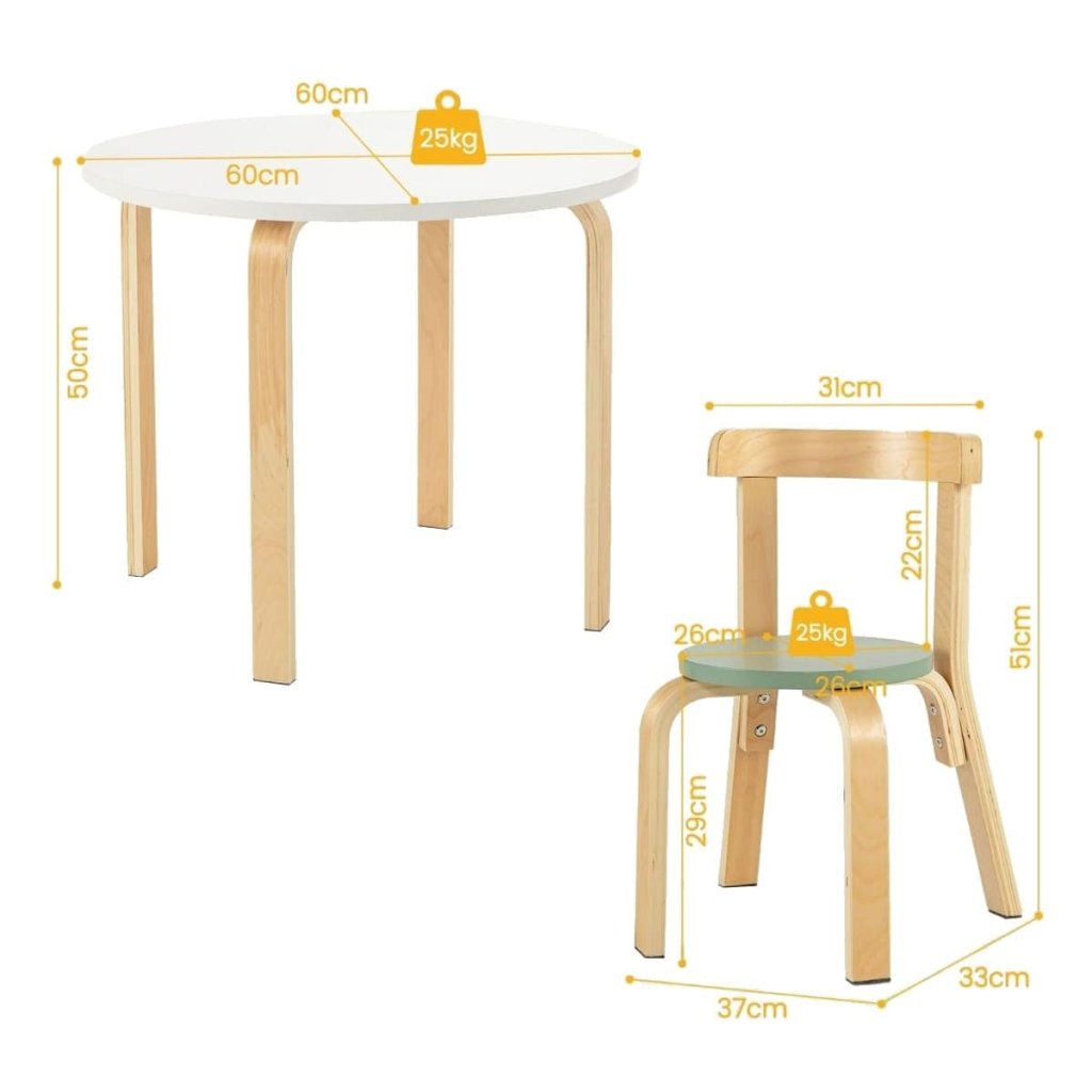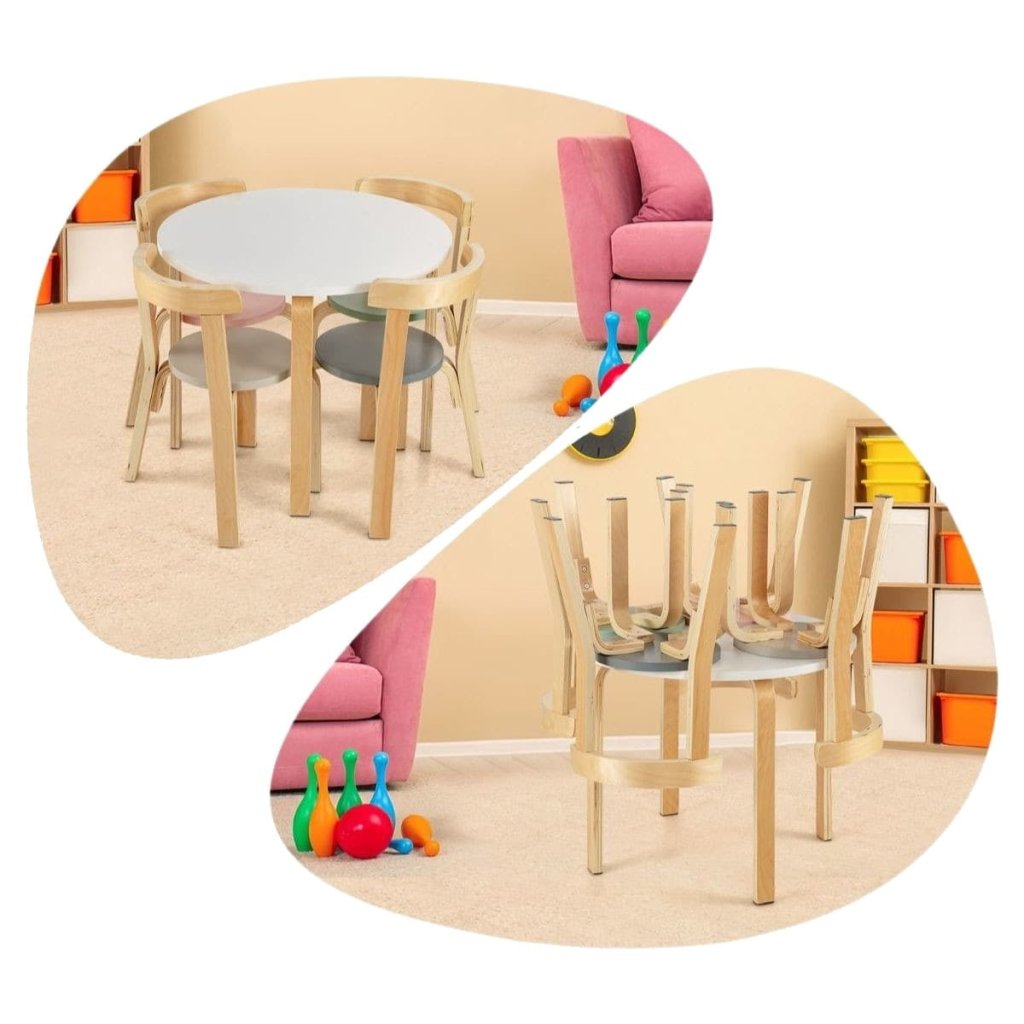 Vaše dieťa si zamiluje tento zábavný a praktický set so stolom a štyrmi stoličkami v natur a pastelovom prevedení, navrhnutý tak, aby vyzeral dokonale za každej situácie. Vďaka vedeckej výške môžu vaše deti pohodlne sedieť pri hraní, jedle, čítaní, kreslení. Stoličky sú navyše vybavené zakrivenými operadlami, ktoré pomáhajú deťom dosiahnuť zdravé držanie tela pri sedení. Perfektná veľkosť pre deti, ľahko čistiteľný a zostaviteľný, ideálna na písanie, kreslenie alebo stravovanie. Stôl: 60 x 60 x 50 cm Stolička: 37 x 33 x 51 cm Nosnosť dosky stola: 25 kg Nosnosť sedadla: 25 kg Čistá hmotnosť: 10 kg Vhodný vek: od 4 rokovDodatočné parametre