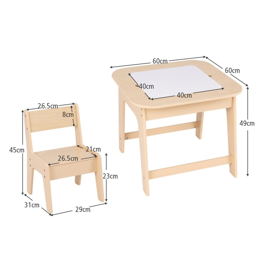 Vaše dieťa si zamiluje tento zábavný a praktický set so stolom a dvoma stoličkami v prírodnom prevedení, navrhnutý tak, aby bol praktický a pekný za každej situácie. V hornej doske stola je skrytý úložný priestor pre kreatívne sady na maľovanie, pracovné zošity alebo hračky, ktoré majú pri stolčeku hneď po ruke. Doska je obojstranná a z jednej strany majú deti kresliacu tabuľu. Vďaka vedeckej výške môžu vaše deti pohodlne sedieť pri hraní, jedle, čítaní, kreslení. Perfektná veľkosť pre deti, ľahko čistiteľný a zostaviteľný, ideálna na písanie, kreslenie alebo stravovanie. Stôl: 60 x 60 x 49 cm Stolička: 45 x 31 x 29 cm Nosnosť dosky stola: 20 kg Nosnosť sedadla: 30 kg Čistá hmotnosť: 11 kg Vhodný vek: od 4 rokovDodatočné parametre