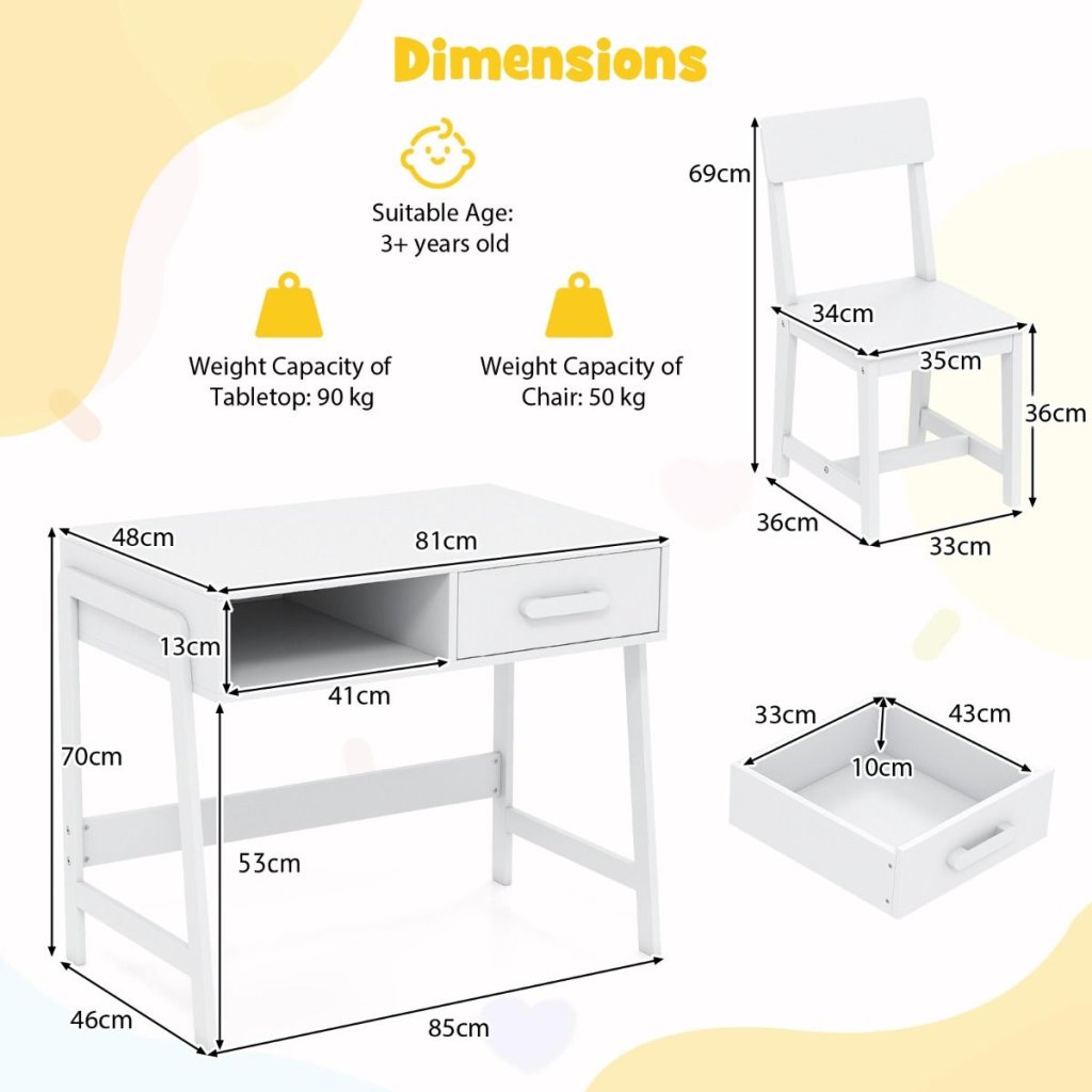 Tento detský písací stôl so stoličkou v elegantnom bielom prevedení je ideálnou voľbou pre malých školákov a predškolákov. Vďaka svojmu nadčasovému dizajnu ľahko zapadne do každej detskej izby a poskytne dieťaťu útulné a praktické miesto na kreslenie, učenie aj hranie. Stôl je vybavený priestrannou zásuvkou a otvorenou policou, ktoré ponúkajú dostatok úložného priestoru na knihy, pastelky alebo školské pomôcky. Súčasťou setu je tiež pevná a stabilná stolička prispôsobená detskej výške, ktorá zaisťuje pohodlné sedenie počas každodenných aktivít. Nábytok je vyrobený z kvalitného dreveného materiálu s dôrazom na bezpečnosť, stabilitu a jednoduchú údržbu. Tento set podporuje u detí samostatnosť a vytvára prirodzené prostredie pre rozvoj kreativity i školských zručností. Parametre: Farba: biela Materiály: MDF, borovicové drevo Rozmery stola: 85 x 48 x 70 cm (D x Š x V) Rozmery stoličky: 33 x 36 x 69 cm (D x Š x V) Nosnosť dosky stola: 90 kg Nosnosť stoličky: 50 kg Odporúčaný vek: od 3 rokovDodatočné parametre