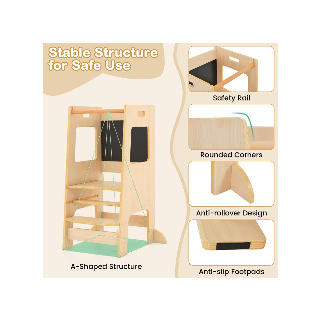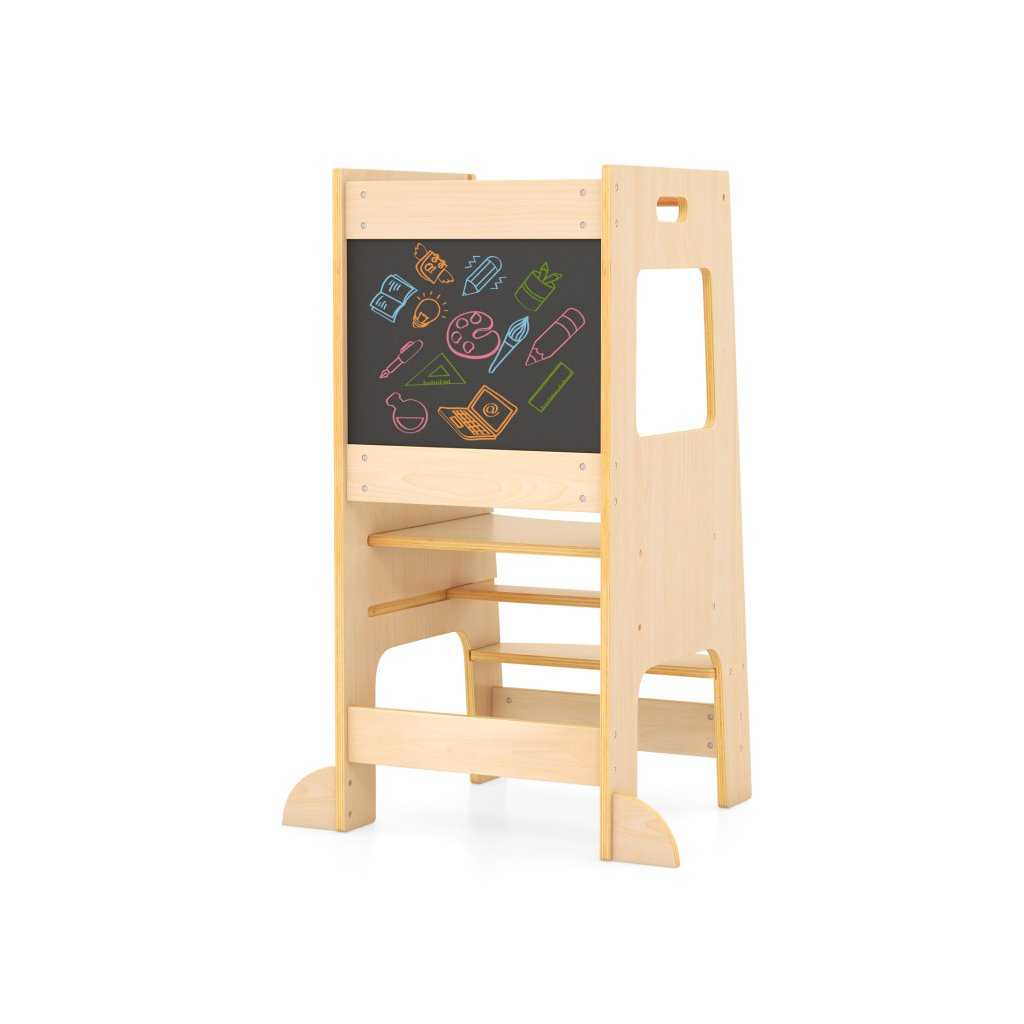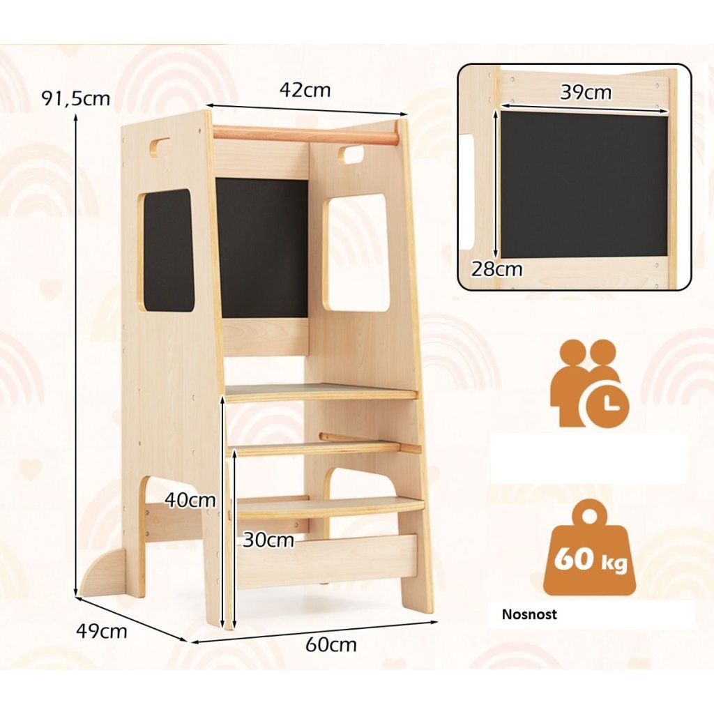 Učiaca veža v minimalistickom drevenom masívnom prevedení sa stane nepostrádateľným pomocníkom každej domácnosti s malými deťmi. Rozvíja a podporuje samostatnosť a schopnosti detí v bežných každodenných činnostiach, ako je čistenie zúbkov, asistencia rodičom v kuchyni, v dielni, umožní dosiahnuť deťom na ich obľúbené hračky a pod. Skvelým bonusom je obojstranná kresliaca tabuľa na kriedy, kde deti môžu rozvíjať svoju kreatívnu fantáziu. Veža sa veľmi ľahko prenáša. Severský dizajn skvele zapadne aj do moderne ladeného interiéru, drevené masívne prevedenie odkazuje k tradničnému materiálu, a farebne neutrálne prevedenie je vhodné pre chlapcov aj dievčatká. *Stabilná konštrukcia sa postará o bezpečnosť Vašich detí *Vysoké bočnice zadná prepážka chránia deti pred pádom *Moderný dizajn v naturálnom prevedení *Kresliaca tabuľa súčasťou veže Parametre: Farba: Prírodné Materiál: Drevo Celkové rozmery veže: 60 x 49 x 91,5 cm (D x Š x V) Nosnosť: 60 kg Vhodný vek: 1 rok Čistá hmotnosť: 8 kgDodatočné parametre