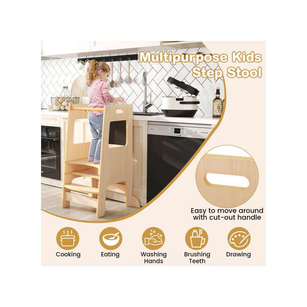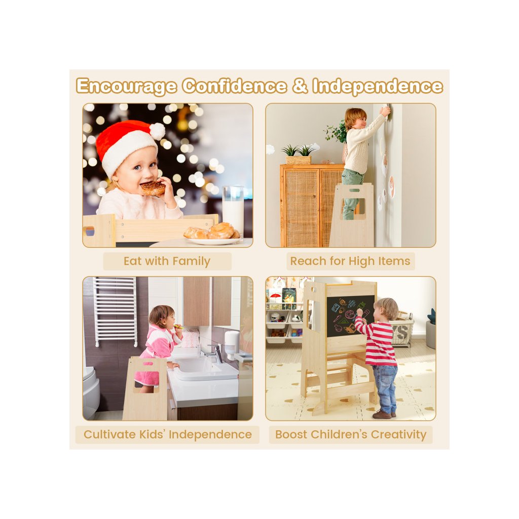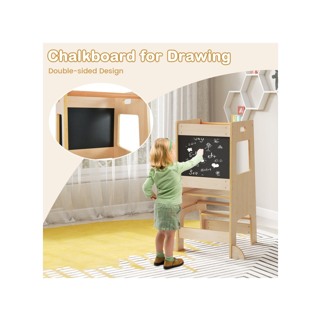Učiaca veža v minimalistickom drevenom masívnom prevedení sa stane nepostrádateľným pomocníkom každej domácnosti s malými deťmi. Rozvíja a podporuje samostatnosť a schopnosti detí v bežných každodenných činnostiach, ako je čistenie zúbkov, asistencia rodičom v kuchyni, v dielni, umožní dosiahnuť deťom na ich obľúbené hračky a pod. Skvelým bonusom je obojstranná kresliaca tabuľa na kriedy, kde deti môžu rozvíjať svoju kreatívnu fantáziu. Veža sa veľmi ľahko prenáša. Severský dizajn skvele zapadne aj do moderne ladeného interiéru, drevené masívne prevedenie odkazuje k tradničnému materiálu, a farebne neutrálne prevedenie je vhodné pre chlapcov aj dievčatká. *Stabilná konštrukcia sa postará o bezpečnosť Vašich detí *Vysoké bočnice zadná prepážka chránia deti pred pádom *Moderný dizajn v naturálnom prevedení *Kresliaca tabuľa súčasťou veže Parametre: Farba: Prírodné Materiál: Drevo Celkové rozmery veže: 60 x 49 x 91,5 cm (D x Š x V) Nosnosť: 60 kg Vhodný vek: 1 rok Čistá hmotnosť: 8 kgDodatočné parametre