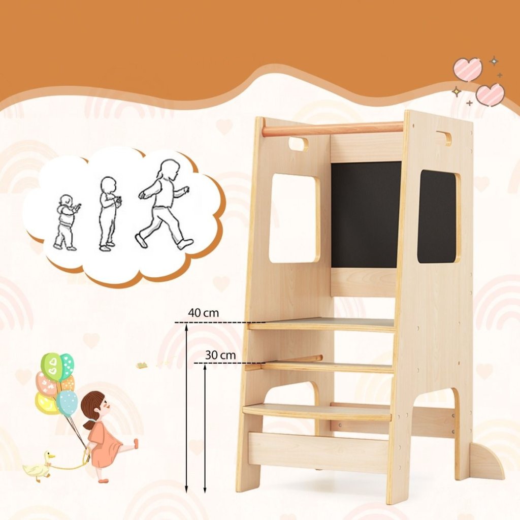 Drevená masívna učiaca veža Montessori s tabuľou