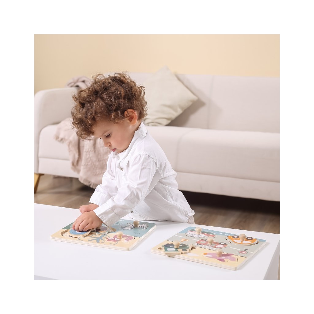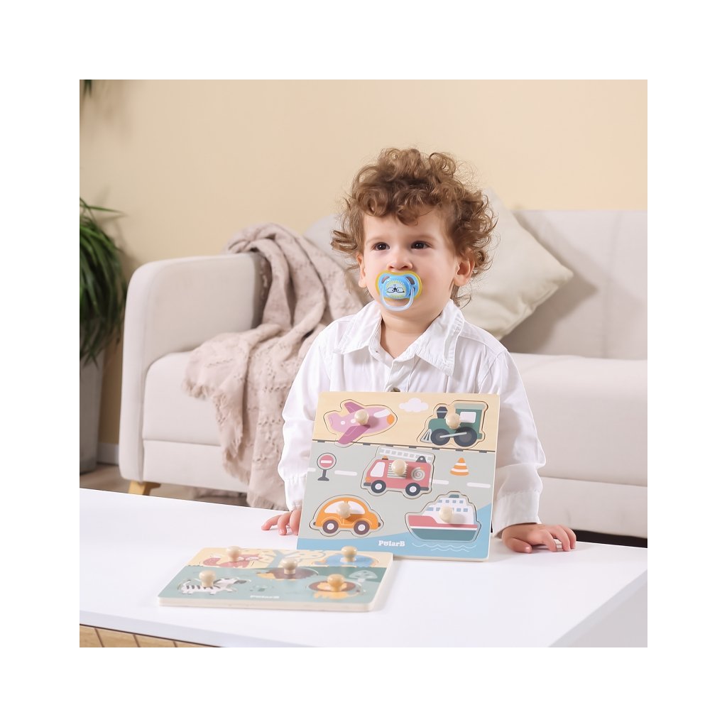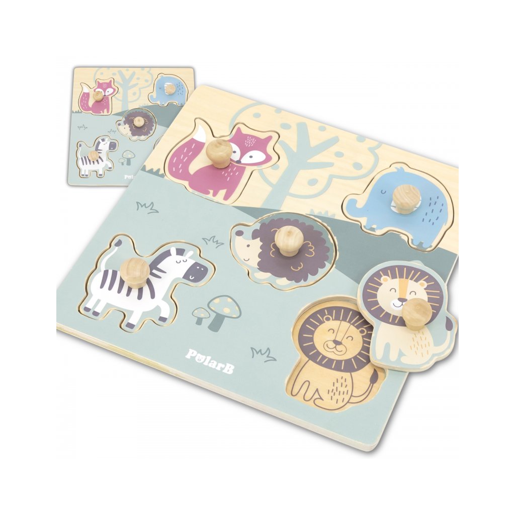 Drevené puzzle s kolíčkami pre deti je ideálne na doma aj do škôlky. Skladá sa z dosky a 5 tematických dielikov, ktoré sa na ňu nasadia. Na drevenom podklade sa nachádzajú jamky, ktoré tvarom zodpovedajú farebným puzzle. Celá súprava je vyrobená z dreva a natretá farbami bezpečnými pre deti v žiarivých farbách, ktoré potešia každého používateľa a poskytnú mu veľa zábavy. Rozmery: š.22 x v.22 x h.2,7 cm Materiál: drevoDodatočné parametre