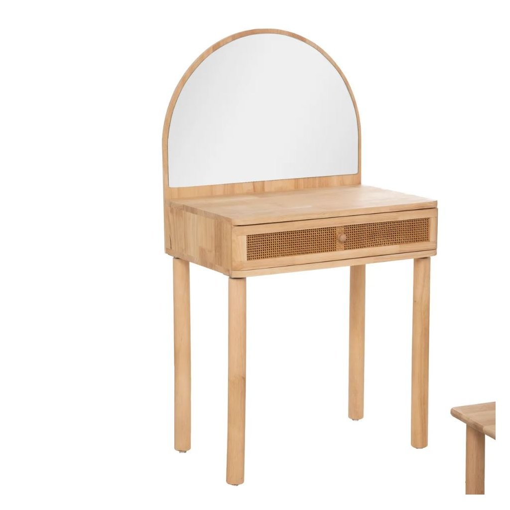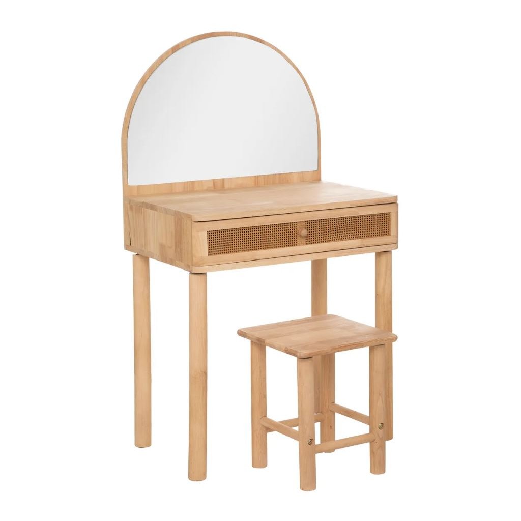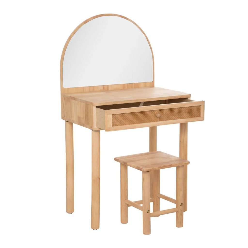 Prekrásny toaletný stolček so stoličkou je ideálnym miestom pre malé princezné, ktoré sa rady parádia. Stolček je v prírodnom drevenom dizajne a dodá dievčenskej izbičke dotyk kráľovskej elegancie. Každá malá princezná potrebuje vlastný kútik na odkladanie šperkov či kozmetiky. Detský toaletný stolček so stoličkou sa perfektne hodí do každej dievčenskej izbičky. Má unikátny, luxusný dizajn, zrkadlo z bezpečného plexiskla a otvárateľnú zásuvku na odkladanie kozmetiky. Kvalitou produktu sme si istí, a to vďaka značke Atmosphera, ktorá má dlhoročnú históriu. Rozmer: 55 x 35 x 100 cm Veľkosť zrkadla: 53 x 35 cm Veľkosť zásuvky: 55 x 31 x H 9,8 cmDodatočné parametre
