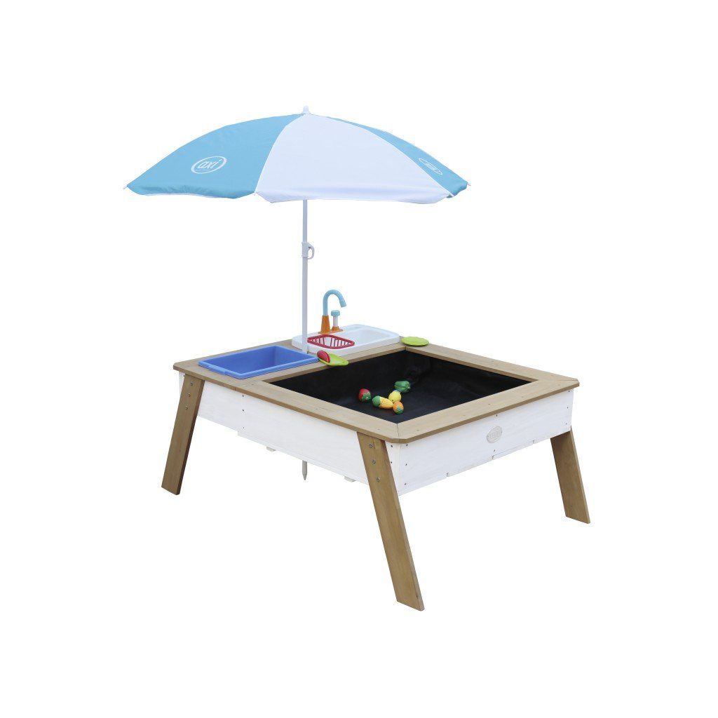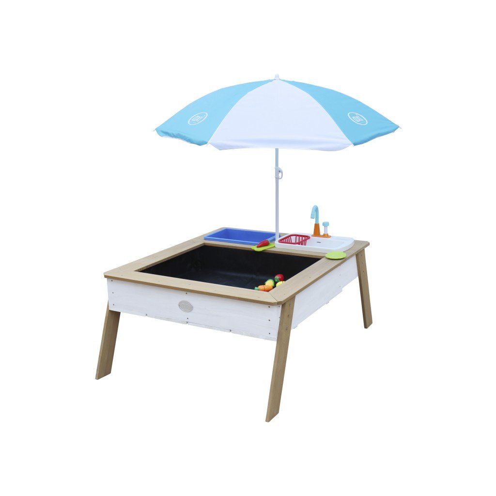Multifunkčný hrací stolík s kuchynským drezom v hnedo-bielom prevedení. Vďaka tomuto stolíku sa deti môžu baviť hodiny vďaka priloženým doplnkom, ako sú taniere, doštička, ovocie a zelenina, môžu vytvárať "dobroty" z piesku a vody. Ovocie a zelenina sú spojené suchým zipsom a dajú sa tak krájať nožom. Aby vaše deti boli pri hre chránené pred slnkom, je stôl dodávaný so slnečníkom v bielo - modrej farbe. Vodnú nádržku drezu môžete naplniť koľkokrát chcete, pretože vodovodný kohútik používa vodu v dreze, ktorá ním pretečie, stačí len stlačiť gombík – vďaka tomu je táto sada šetrná k životnému prostrediu a bezpečná pre vaše dieťa. Keď si vaše deti dohrajú, vyberateľné koše sa dajú ľahko vyčistiť. Pieskový stôl je dodávaný vrátane geotextílie. Rozmery stolíka: 93,5 x 110 x 50 cm Nádoba pojme max 80 kg piesku/65 l vodyDodatočné parametre