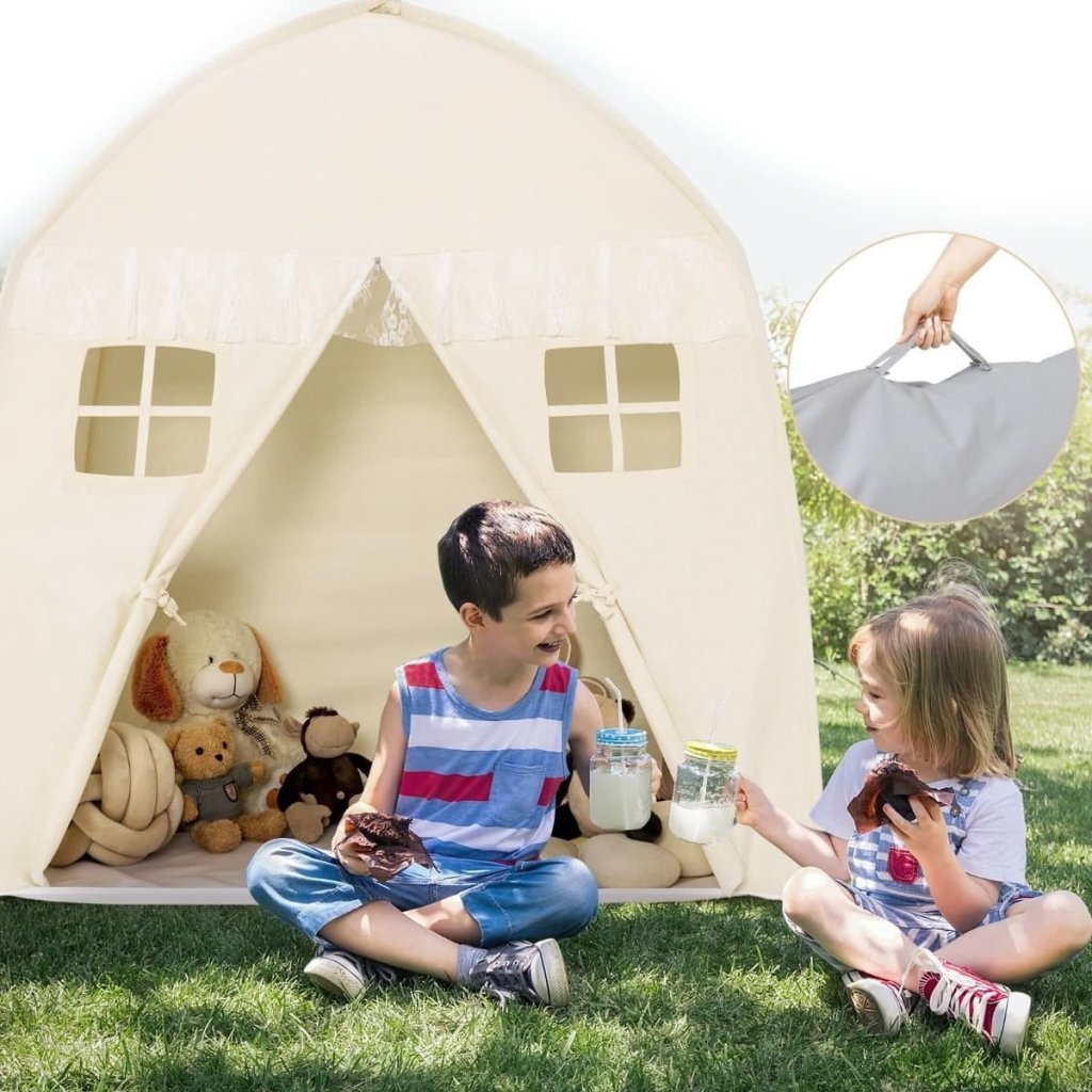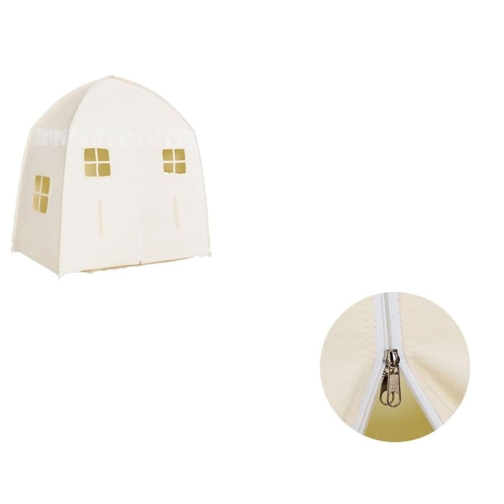 Dizajnový domček v tvare stanu v béžovom prevedení, nadchne všetky deti. Domček bude dominantou detskej izby! Domček si môžete zariadiť podľa vašej fantázie, môžete dať do domčeka deku s vankúšom a hneď tam deťom vytvoríte pohodlné a komfortné miesto na odpočívanie, k tomu ešte lampičku a môžu si čítať svoje obľúbené knižné príbehy zo svojho domčeka. Tento priestor je dostatočne veľký, aby sa v ňom mohli voľne pohybovať deti aj rodičia. Domček zdobený svetelnou girlandou a farebnými vlajkami dodá kúzlo každej miestnosti, záhrade alebo škôlke. Tento domček na hranie vďaka svojmu elegantnému a očarujúcemu exteriéru ľahko upúta pozornosť detí a bude nepochybne dokonalým darčekom pre vašu princeznú. Každé dieťa by malo mať svoju vlastnú tajnú základňu, aby mohlo rozvíjať svoju vlastnú inováciu a nezávislé myslenie. Domček je vyzdobený závesmi, očarujúcimi oknami, svetlami a farebnými vlajkami. Tento dizajn robí zo stanu kúzelné miesto cez deň aj v noci, ktoré pozýva deti k nekonečnej zábave a organizovaniu večierkov alebo filmových večerov. Parametre: Rozmery: 143 cm x 100 cm x 155 cm Materiál: bavlnené plátno, sklolaminátDodatočné parametre