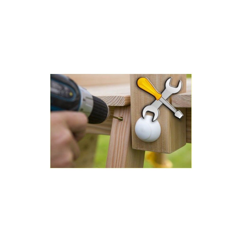 Montáž nezahrnuje "vícepráce" např. úprava terénu, nátěr sestavy apod., a bude prováděna ze standardního zboží dodaného naší firmou. Instalace herní sestavy: Herní sestavy pro veřejný sektor je nutné je instalovat výhradně na vhodný povrch. Možnosti instalace: •Nejlepším podkladem pro instalaci herních sestav obecně, je rovná plocha krytá tzv: dopadovými pryžovými dlaždicemi. •Herní sestavy které mají pádovou výšku 1 m mohou být umístěny na udržovaný trávník. Plocha pro umístění sestavy musí být rovinná, případně je zde třeba počítat s vícepracemi. •V případě, že je odchylka povrchu větší než 5 cm na 100 cm délky je nutné provést stavební přípravu před samotným započetím montáže. Stavební příprava zahrnuje upravení terénu tak, aby vykazoval odchylku menší než 10 cm na 60 cm délky, například odkopáním zeminy, vysypáním prostoru nutným pro umístění herní sestavy kačírem, pískem, mulčovací kůrou apod. Stavební příprava není součástí montáže, a její realizaci si zákazník provádí sám, na svůj účet. Případně lze provést stavební přípravu našimi montážními pracovníky za úplatu, cena stavební přípravy je pak stanovena individuálně, dle náročností prací a spotřeby materiálu. •Pokud zákazník nechce realizovat přípravu terénu, lze herní sestavy umístit i na mírně svažitý terén, zemní kotvy umožní sestavu vyrovnat do roviny, části kotev nebudou skryté v zemině. Z důvodu bezpečnosti je nutné, aby si zákazník obnažené části kotvy následně zahrnul zeminou, či obsypal ( např. kačírkem). •Z důvodu bezpečnosti nelze herní sestavy instalovat na tvrdé podloží jako je asfalt, či beton.