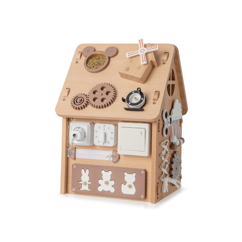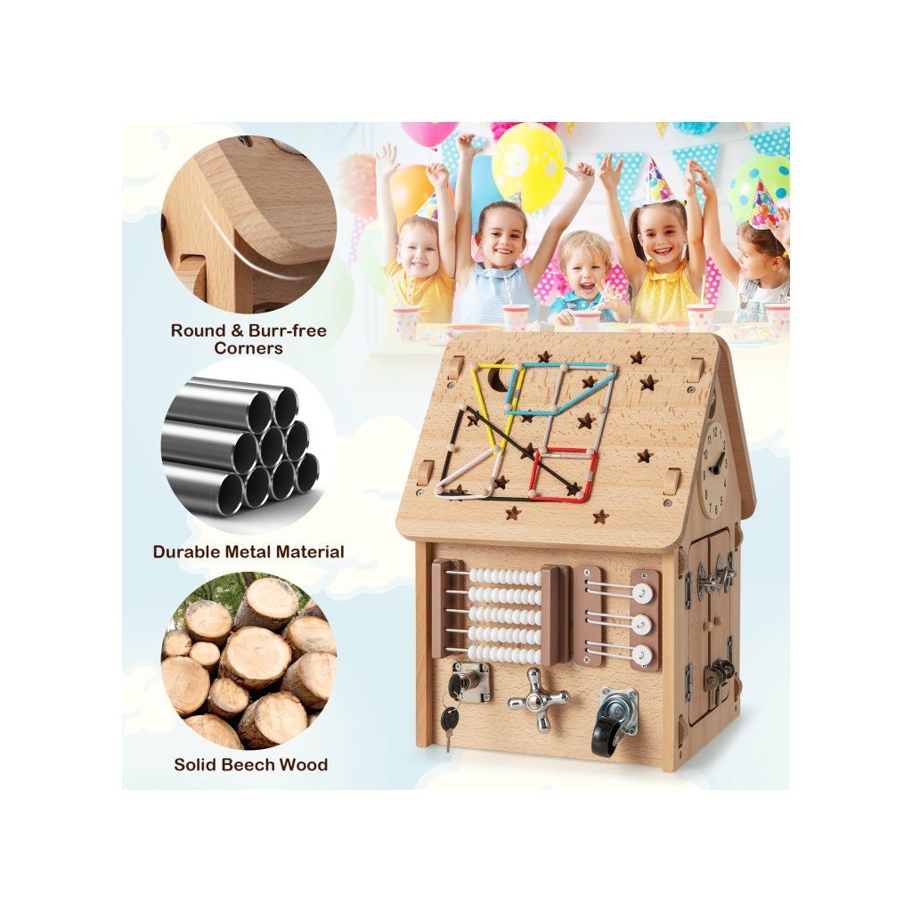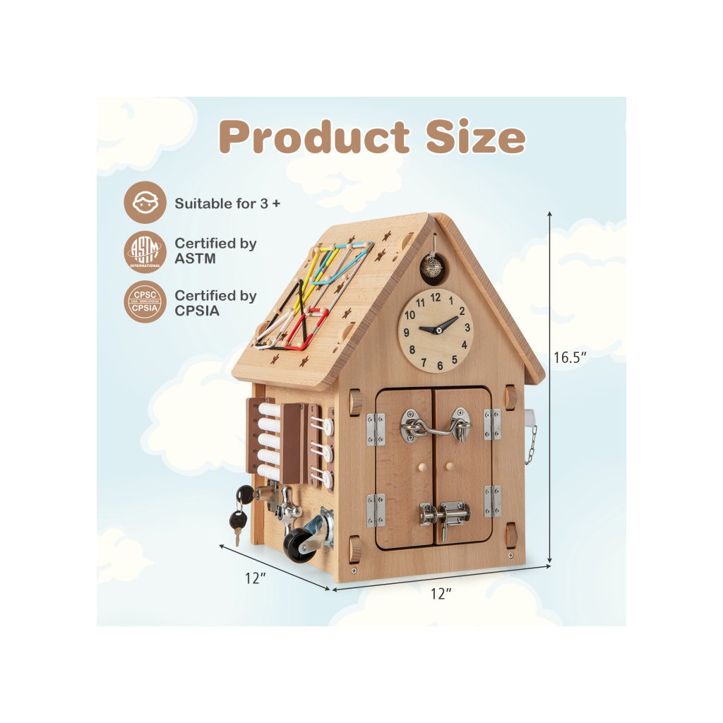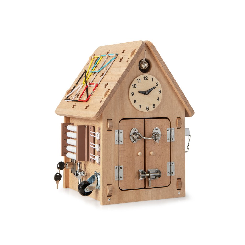 Multifunkčný domček má mnoho častí pre extra zábavu. Táto vzdelávacia hračka je vybavená mnohými hracími plochami, ako je Velcro, spínač, zásuvka, hodiny a západka, kde sa deti môžu naučiť viac zručností. Táto hračka v tvare domčeka je vybavená vo vnútri a má dostatok úložného priestoru pre detské hračky. Deti si tak vypestujú dobrý návyk ukladať a triediť svoje veci. Domček je vyrobený z odolných panelov a vysoko kvalitného kovového materiálu, čo zaisťuje dlhú životnosť. Zaoblené rohy navyše zabraňujú náhodnému nárazu. Pomáha trénovať jemnú motoriku detí a zlepšovať ich každodenné zručnosti Okrúhle rohy bez otrepov chránia citlivú detskú pokožku Farba: Prírodné Materiál: bukové drevo + kov Celkové rozmery: 31 x 30 x 42 cm (D x Š x V) Vnútorný úložný priestor: 25 x 19,5 x 39 cm (D x Š x V) Čistá hmotnosť: 5 kg Obsah balenia: 1 x domček na hranie 1 x návodDodatočné parametre