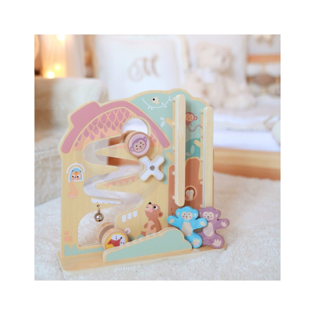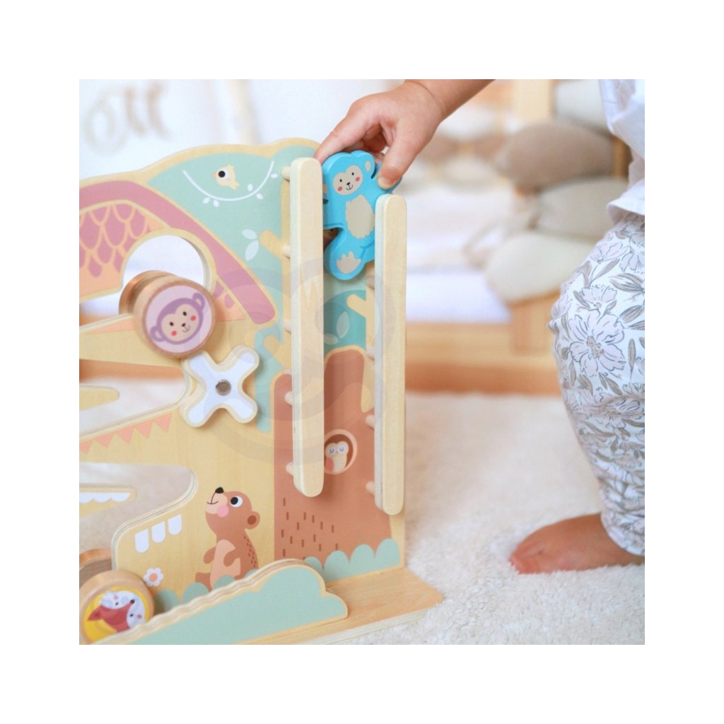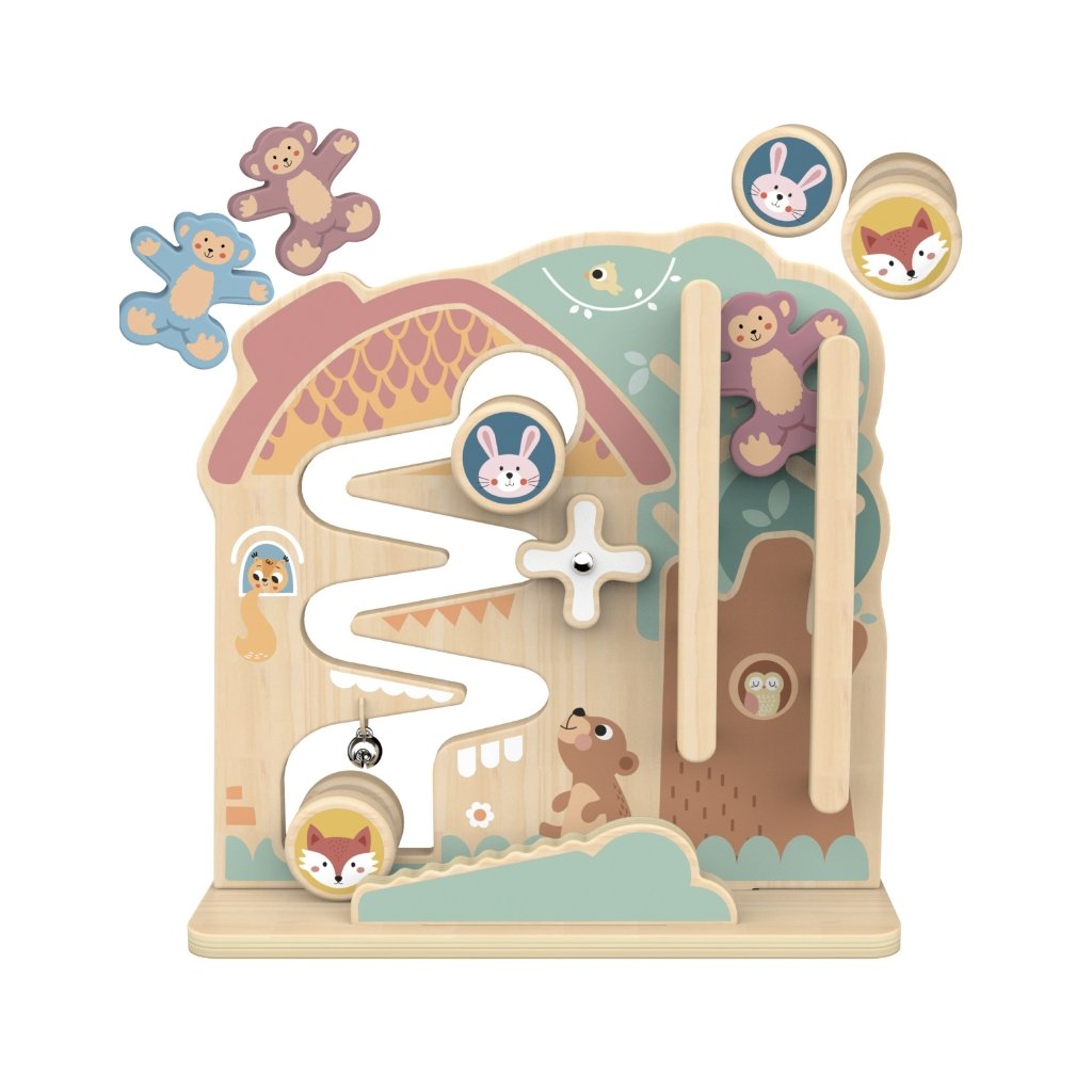Dobrodružstvo začína s touto drevenou tabuľou 2v1, ktorá kombinuje klasický labyrint a edukačnú tabuľu. Deti posúvajú farebné figúrky po zakrútenej dráhe, prekonávajú mosty a oblúky, až nakoniec zazvonia na zvonček, čo rozvíja jemnú motoriku, koordináciu ruky a oka aj logické myslenie. Roztomilé motívy lesa s líškou, opičkami a králikom prinášajú do hry zábavu a inšpiráciu, zatiaľ čo kvalitné drevo a bezpečné farby zaisťujú dlhú životnosť a bezpečnosť. Parametre: Rozmery: 29.6 x 9 x 30.5 cm Materiál: drevo s certifikátom FSC Vhodné pre deti: od 18 mesiacovDodatočné parametre