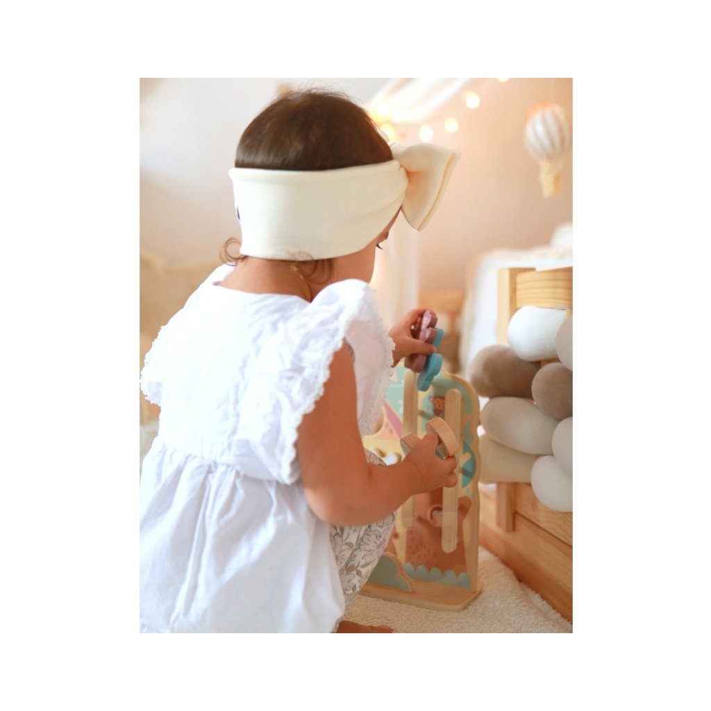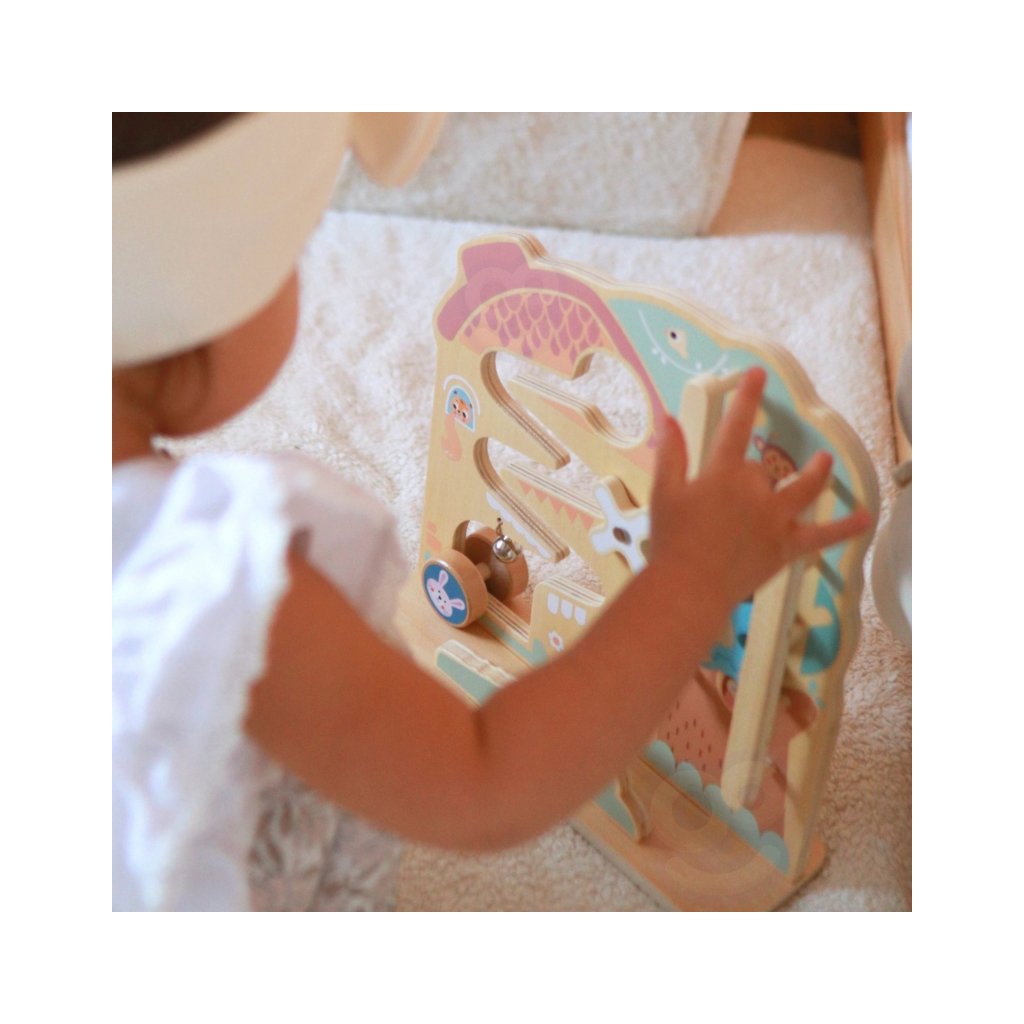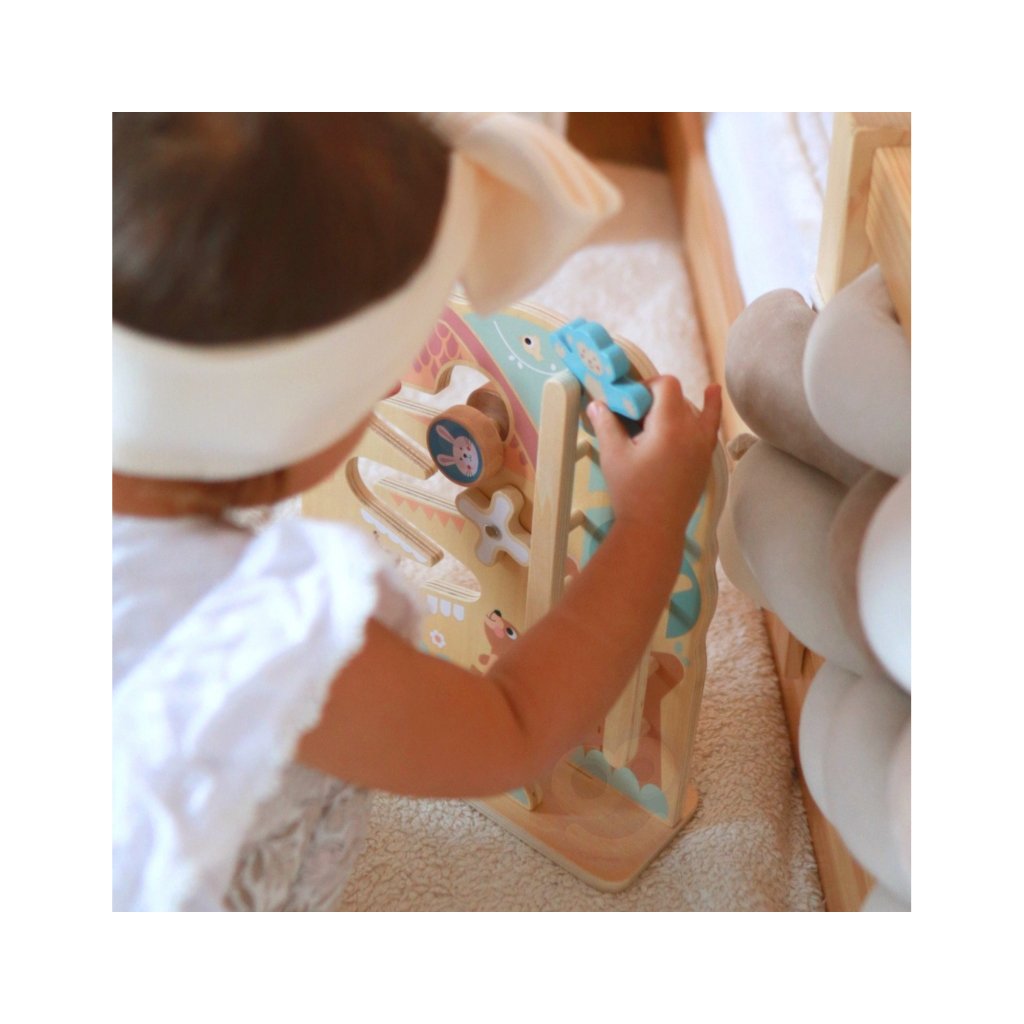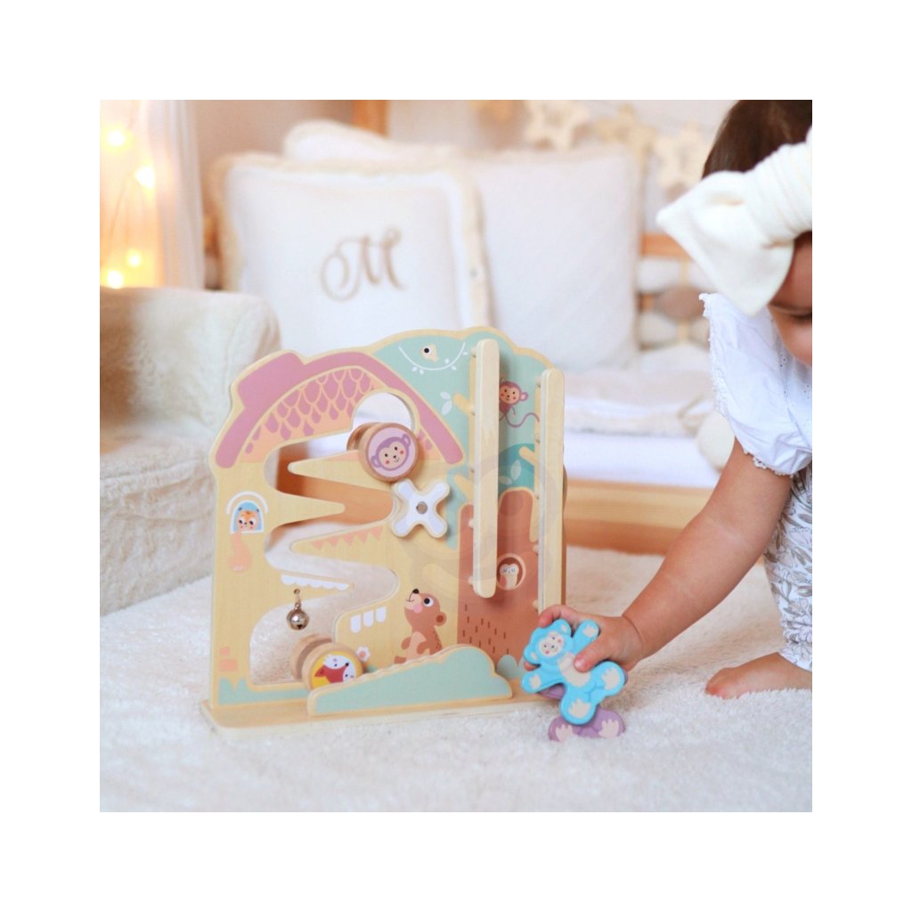 Dobrodružstvo začína s touto drevenou tabuľou 2v1, ktorá kombinuje klasický labyrint a edukačnú tabuľu. Deti posúvajú farebné figúrky po zakrútenej dráhe, prekonávajú mosty a oblúky, až nakoniec zazvonia na zvonček, čo rozvíja jemnú motoriku, koordináciu ruky a oka aj logické myslenie. Roztomilé motívy lesa s líškou, opičkami a králikom prinášajú do hry zábavu a inšpiráciu, zatiaľ čo kvalitné drevo a bezpečné farby zaisťujú dlhú životnosť a bezpečnosť. Parametre: Rozmery: 29.6 x 9 x 30.5 cm Materiál: drevo s certifikátom FSC Vhodné pre deti: od 18 mesiacovDodatočné parametre