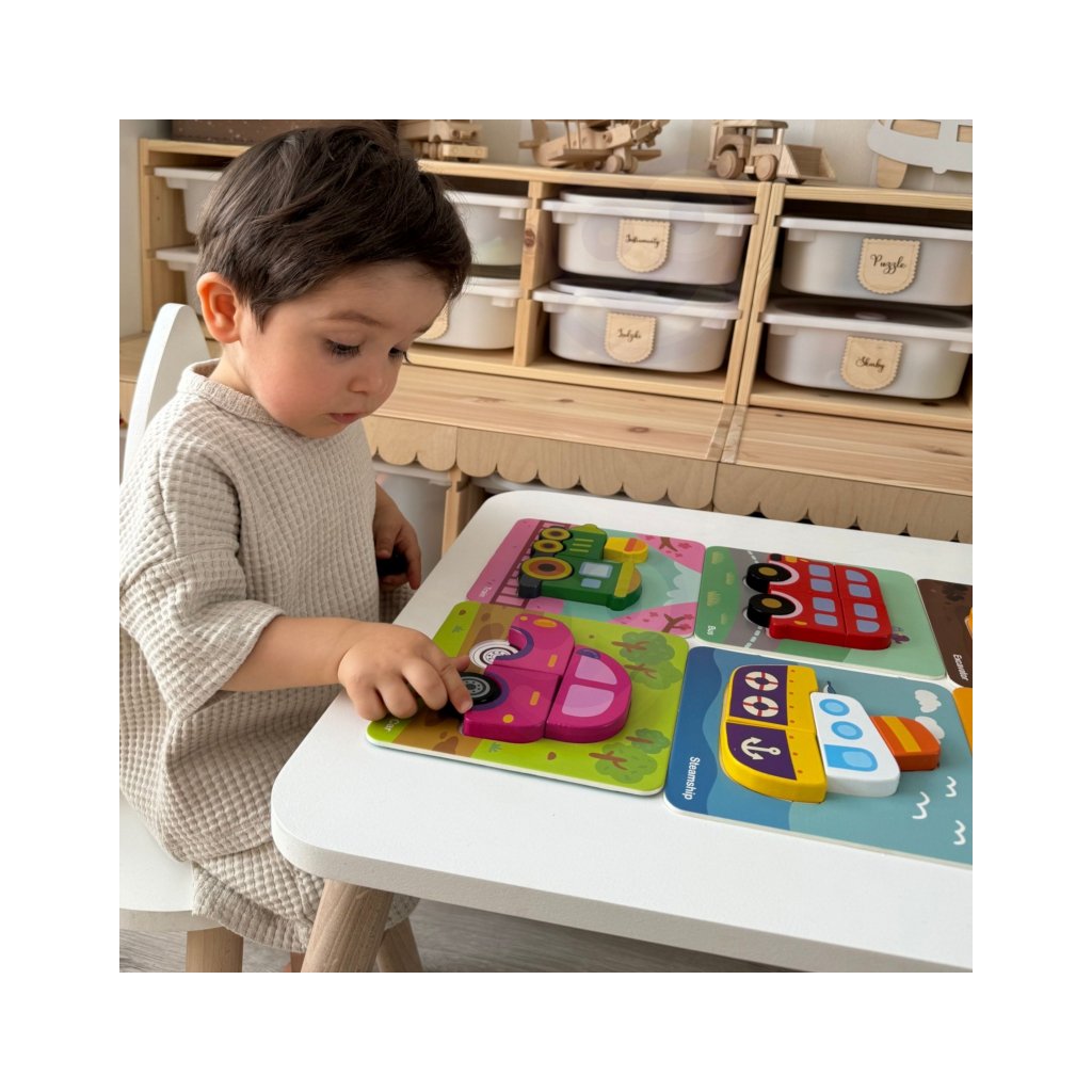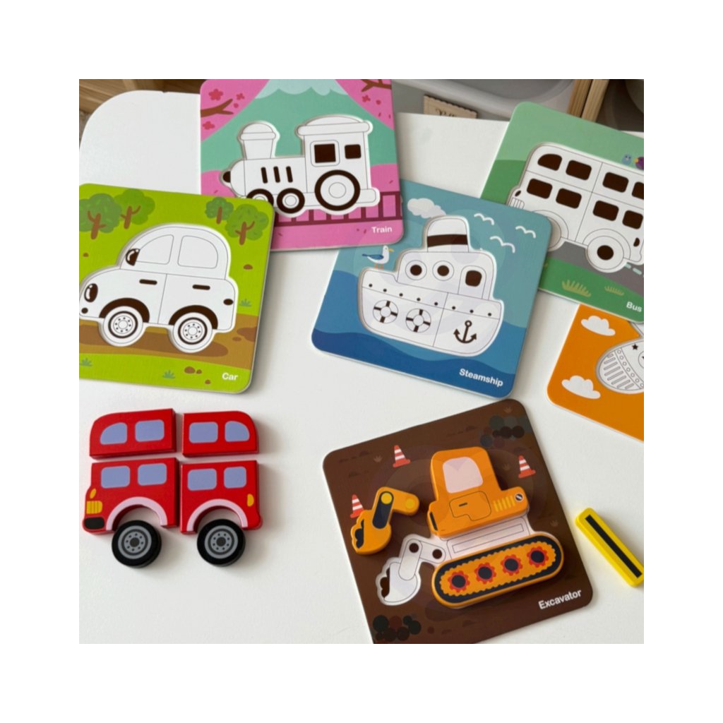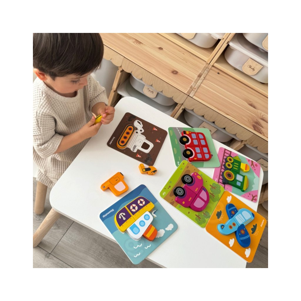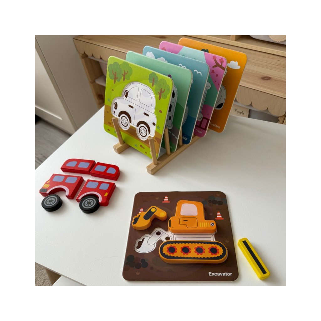 Montessori drevená skladačka je sada skladajúca sa z 33 kusov, vrátane 6 permanentných farebných kariet. Úlohou detí je spojiť veľké drevené prvky a usporiadať ich podľa vzoru tak, aby vytvorili farebnú skladačku. Špeciálne navrhnuté priehlbiny účinne zabraňujú pohybu drevených prvkov, čo uľahčuje rozvoj motorických zručností pre malé ručičky. Parametre: Vhodné pre deti: od 12 mesiacov Sada obsahuje: 33 prvkov, 6 kariet Rozmery produktu: 22 × 22 × 4 cmDodatočné parametre