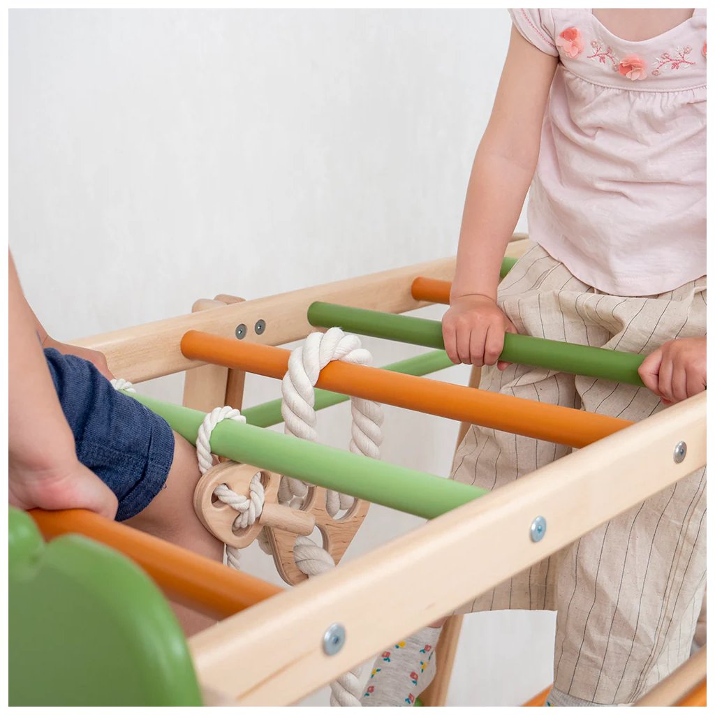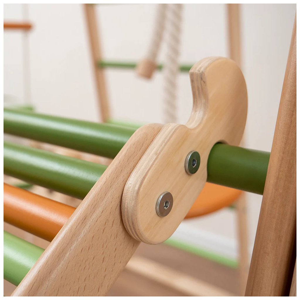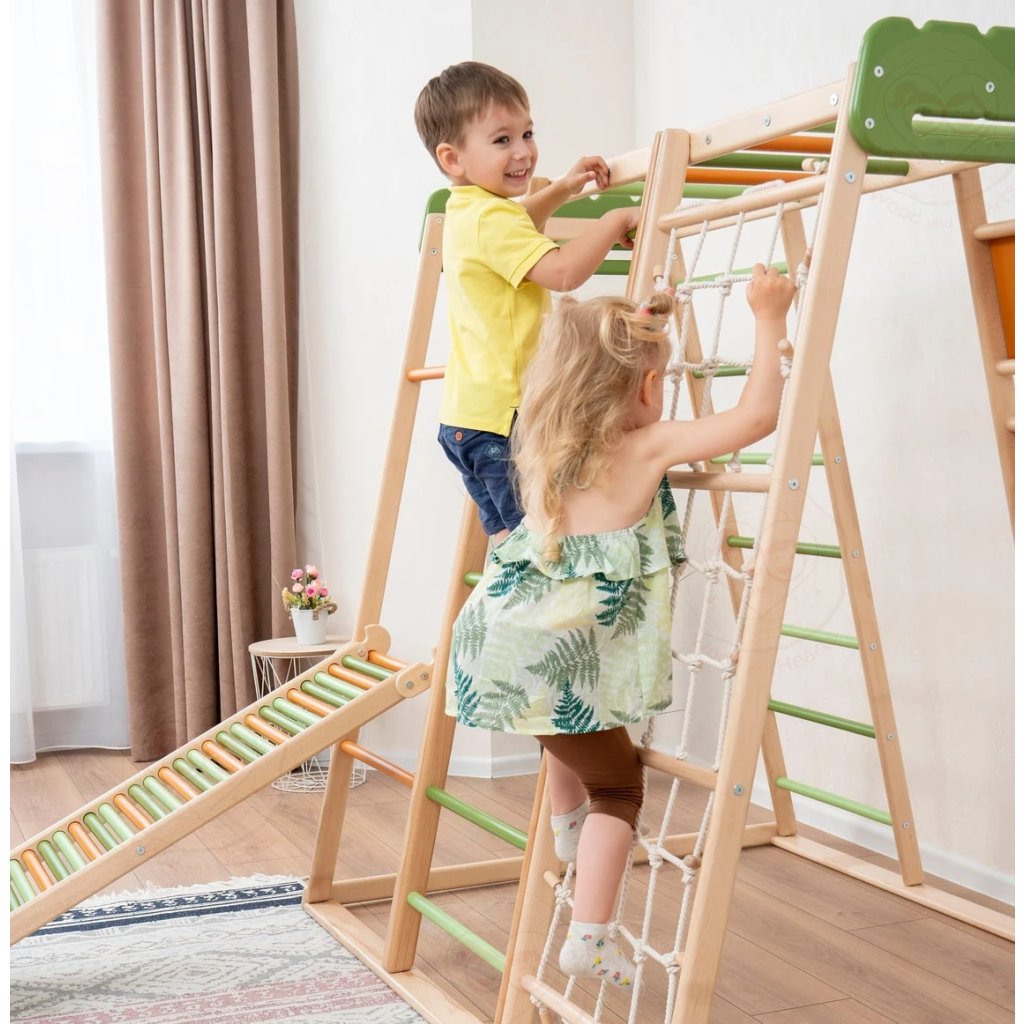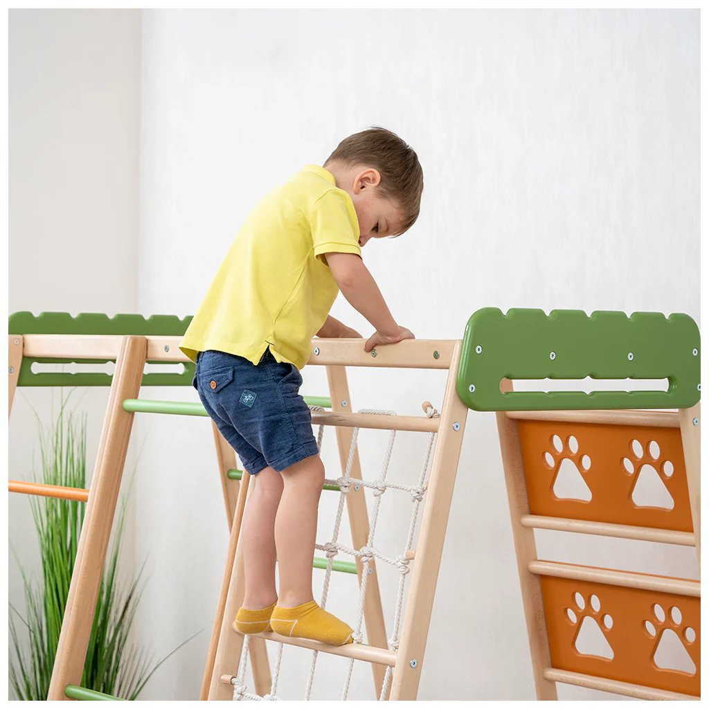 Detské ihrisko 6v1 Montessori s farebnou vyzerajúcou priečnou rampou je všestranné interiérové ihrisko navrhnuté tak, aby pri hre zapojilo motorické zručnosti detí, kontrolu rovnováhy, koordináciu pohybov a nespútanú predstavivosť. Vďaka svojej príťažlivej štruktúre poskytuje rôzne príležitosti na lezenie, šplhanie a zlepšovanie fyzickej kondície vďaka herným prvkom, ktoré sú súčasťou prvku. Deti si ihrisko 6v1 Montessori okamžite zamilujú, je to nekonečné lezenie, plazenie a ihrisko má aj obojstrannú masážnu rampu z drevených priečok, ktoré sa po otočení dajú použiť aj ako šmykľavka, ktorú môžete bezpečne pripevniť k ihrisku. Deti môžu liezť na ihrisko z dvoch protiľahlých strán, jedna strana je z drevených priečok, lanovej steny a v hornej časti je dlhá hrazda na ľahšie lezenie na vrchol zostavy, ktorá je tiež z priečok a deti si môžu zlepšiť svoju fyzickú kondíciu vo vnútri ihriska. Z druhej strany môžu liezť po drevených priečkach alebo použiť lezeckú stenu, kde je otvor v tvare labky na lezenie. Súpravu môžete doplniť o hojdačku, gymnastické kruhy, hojdací disk ....a ďalšie prvky, ktoré nájdete v sekcii súvisiace prvky a môžete ich vylepšiť podľa fyzických potrieb vašich detí. Detské ihrisko je vyrobené z prvotriedneho masívneho bukového dreva, ktoré je známe svojou pevnosťou a pružnosťou, pričom prioritou je odolnosť a šetrnosť k životnému prostrediu.Použitie vysokokvalitného ekologického laku na vodnej báze zaručuje bezpečné a príjemné hranie a prirodzenú farbu dreva s pastelovými alebo prírodnými doplnkami. Vnútorné ihrisko Montessori s maximálnou nosnosťou 60 kg ponúka deťom bezpečné prostredie na skúmanie a rozvoj ich fyzických schopností. Parametre: Celková výška: 145 cm Celková šírka: 152,5 cm Hĺbka ihriska: 120 cm, s rampou: 210 cm Nosnosť: 60 kgDodatočné parametre