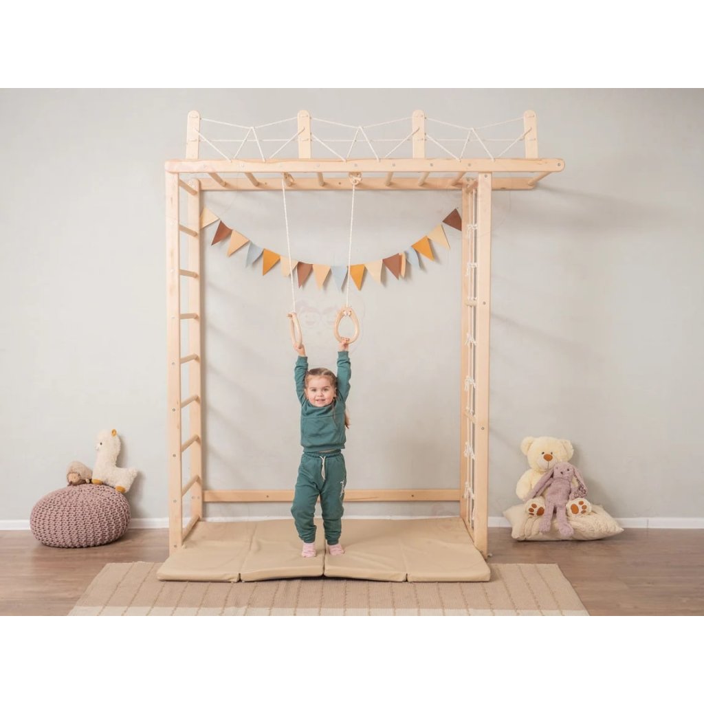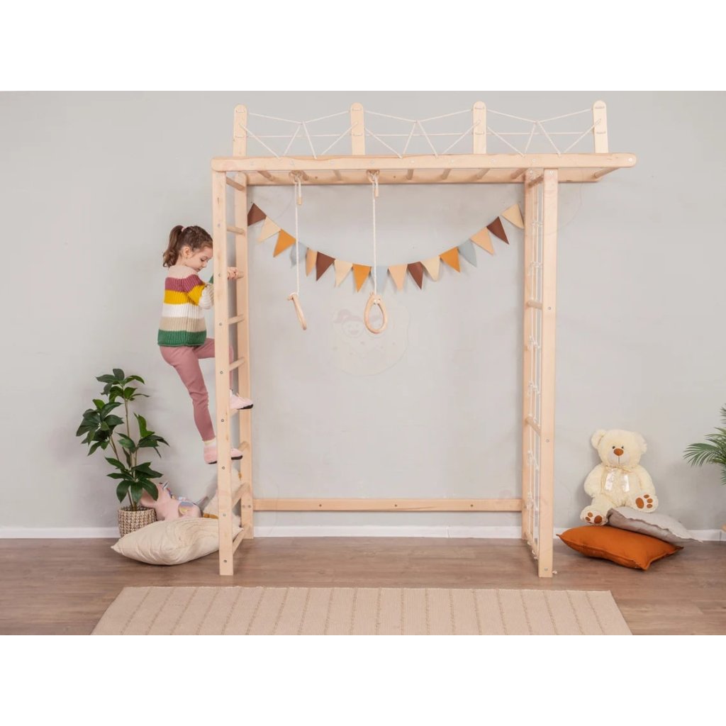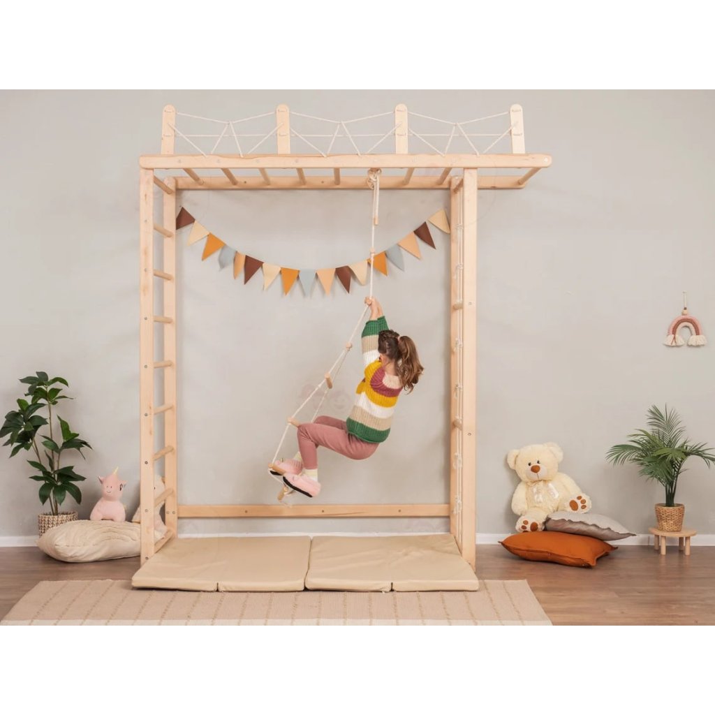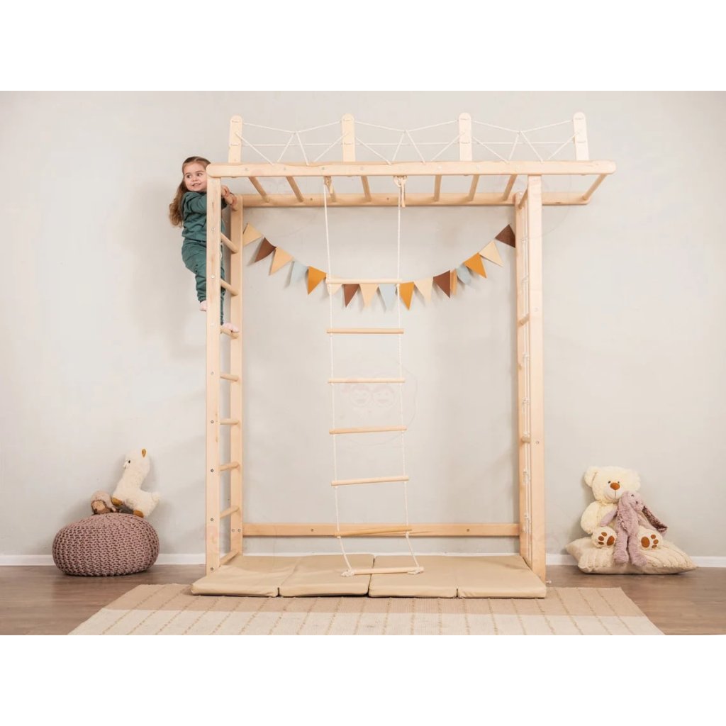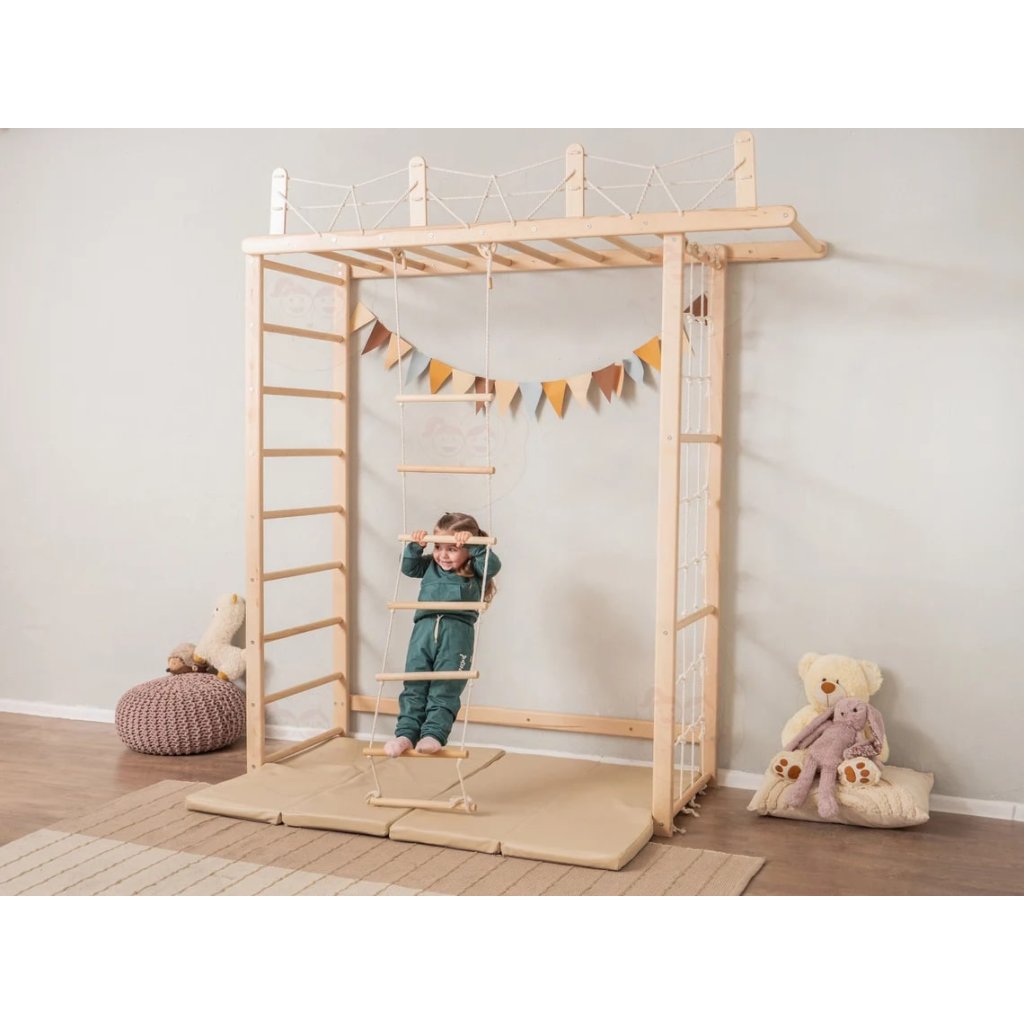 Detský švédsky rebrík Montessori v jednoduchom prírodnom designu. Je ideálny na zavesenie hojdačiek a gymnastických prvkov, je to všestranné interiérové ihrisko určené na zapojenie detskej motoriky, kontroly rovnováhy, koordinácie pohybu a nenútenej predstavivosti do hry. Vďaka svojej prívetivej konštrukcii poskytuje rôzne možnosti na lezenie, šplhanie a zlepšovanie fyzickej kondície, a to vďaka herným prvkom, ktoré možno do zostavy pridať. Deti si švédske Montessori ihrisko okamžite zamilujú, je to nekonečné lezenie, plazenie a preliezanie. Deti môžu liezť po drevených priečkach alebo na druhej strane po kombinácii lanovej steny a drevených priečok až na vrchol zostavy, kde je po celej dĺžke bočnej strany lanové zábradlie pre ich bezpečnosť. Vrchná časť je tvorená drevenými priečkami, po ktorých sa lezie z jednej strany na druhú. V spodnej časti sa nachádza rucková časť, kde si deti môžu zlepšiť svoju fyzickú zdatnosť, a to vo vnútri ihriska na ruckovom module. Vnútorná zostava je v základnom vybavení a môžete ju dovybaviť podľa pohybových schopností vašich detí. Na hádzanársky modul môžete zavesiť napríklad gymnastické kruhy, hojdací disk, päťramenný rebrík alebo závesné lano s drevenými schodíkmi, všetko príslušenstvo a mnoho ďalšieho môžete pridať v sekcii súvisiaci tovar. Prvky pre deti môžete zavesiť podľa toho, čo sa im páči a nepáči, podľa telesnej stavby detí. Detské ihrisko je vyrobené z prvotriedneho masívneho bukového dreva, známeho svojou pevnosťou a pružnosťou, pričom prioritou je odolnosť a šetrnosť k životnému prostrediu. Použitie vysokokvalitného ekologického laku na vodnej báze zaručuje bezpečnú a príjemnú hru a prirodzenú farbu dreva s pastelovými alebo prírodnými doplnkami. Vnútorné ihrisko Montessori s maximálnou nosnosťou 60 kg ponúka deťom bezpečné prostredie na skúmanie a rozvoj ich fyzických schopností. Parametre: Celková výška: 222,5 cm Celková šírka: 199 cm Hĺbka ihriska: 72,2 cm Nosnosť: 60 kgDodatočné parametre