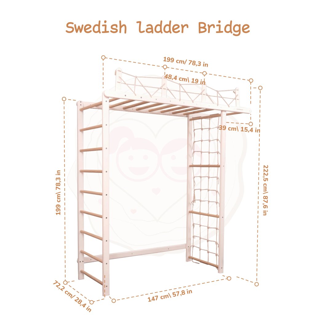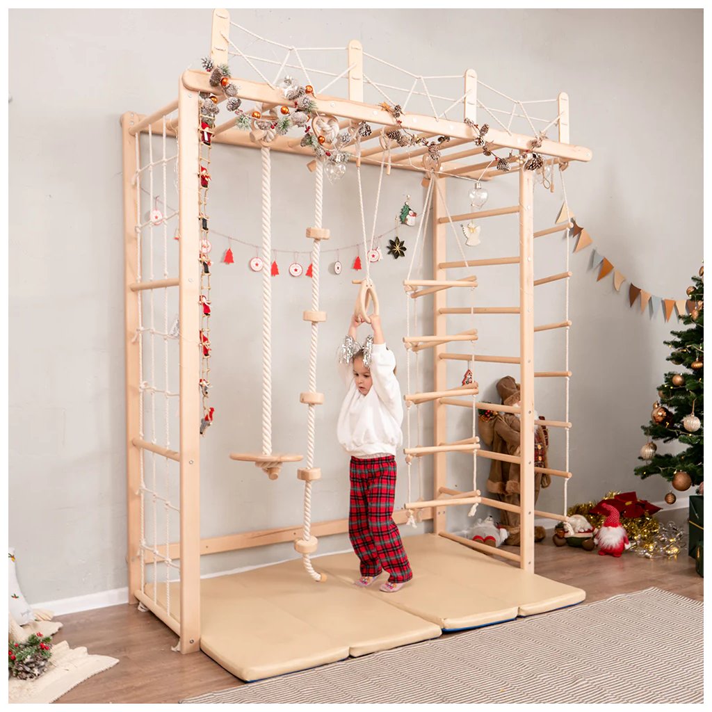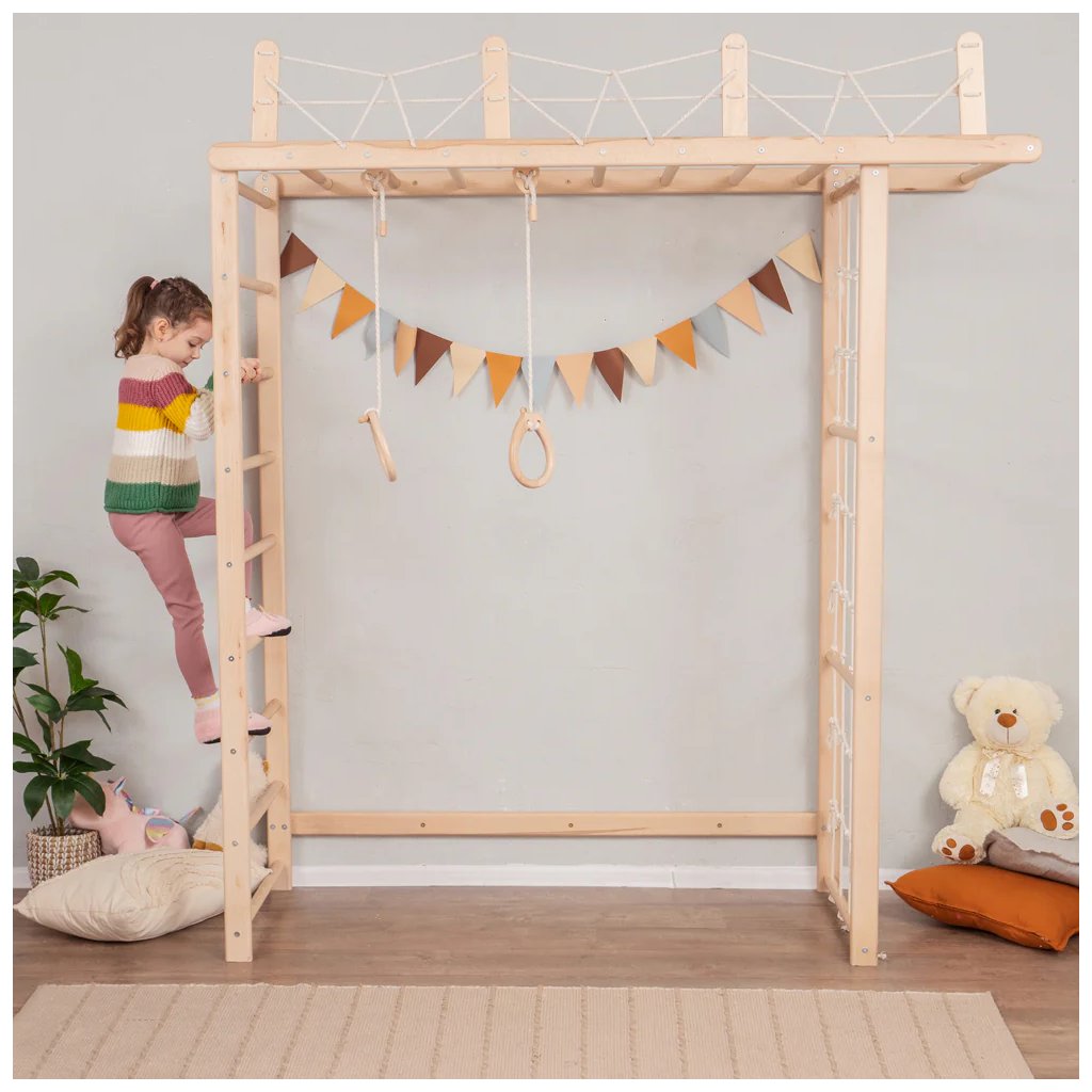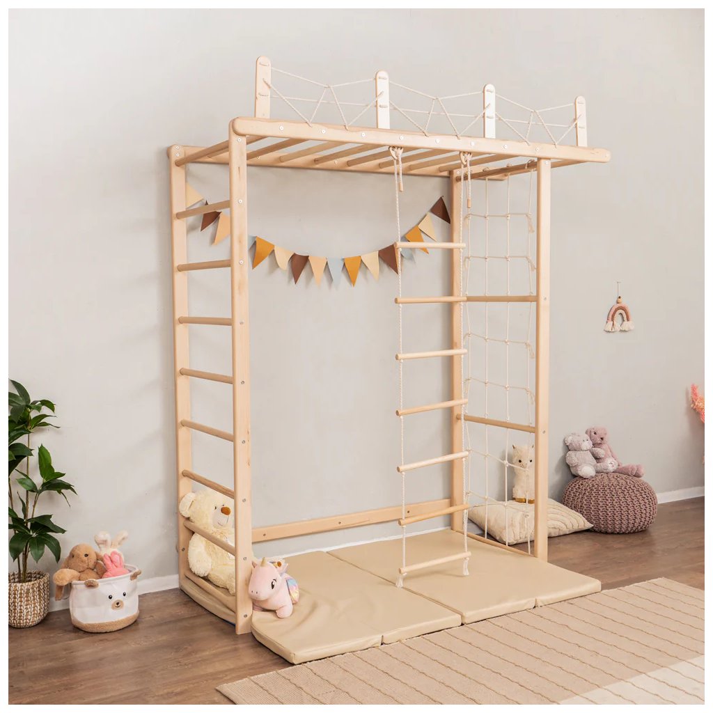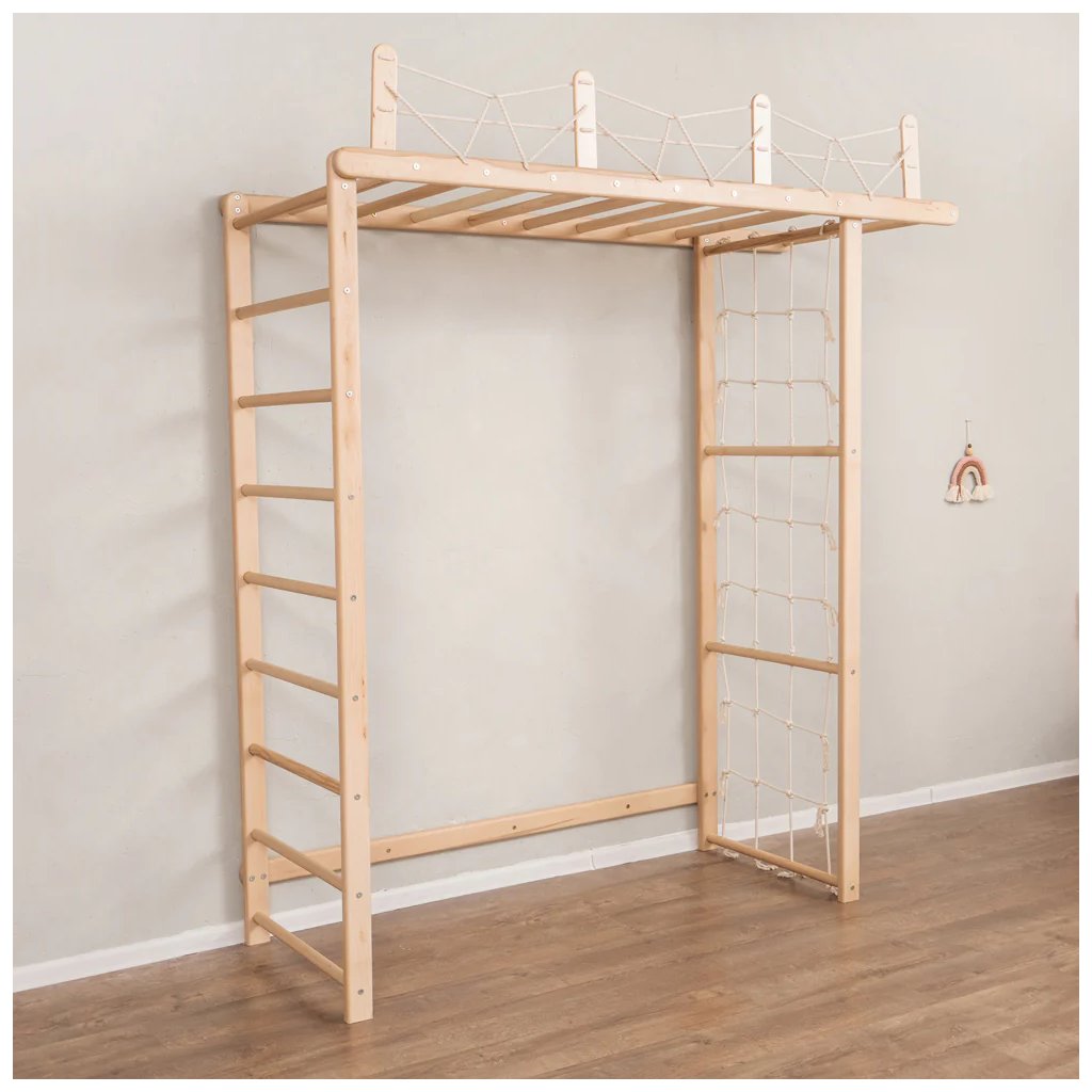Detský švédsky rebrík Montessori v jednoduchom prírodnom designu. Je ideálny na zavesenie hojdačiek a gymnastických prvkov, je to všestranné interiérové ihrisko určené na zapojenie detskej motoriky, kontroly rovnováhy, koordinácie pohybu a nenútenej predstavivosti do hry. Vďaka svojej prívetivej konštrukcii poskytuje rôzne možnosti na lezenie, šplhanie a zlepšovanie fyzickej kondície, a to vďaka herným prvkom, ktoré možno do zostavy pridať. Deti si švédske Montessori ihrisko okamžite zamilujú, je to nekonečné lezenie, plazenie a preliezanie. Deti môžu liezť po drevených priečkach alebo na druhej strane po kombinácii lanovej steny a drevených priečok až na vrchol zostavy, kde je po celej dĺžke bočnej strany lanové zábradlie pre ich bezpečnosť. Vrchná časť je tvorená drevenými priečkami, po ktorých sa lezie z jednej strany na druhú. V spodnej časti sa nachádza rucková časť, kde si deti môžu zlepšiť svoju fyzickú zdatnosť, a to vo vnútri ihriska na ruckovom module. Vnútorná zostava je v základnom vybavení a môžete ju dovybaviť podľa pohybových schopností vašich detí. Na hádzanársky modul môžete zavesiť napríklad gymnastické kruhy, hojdací disk, päťramenný rebrík alebo závesné lano s drevenými schodíkmi, všetko príslušenstvo a mnoho ďalšieho môžete pridať v sekcii súvisiaci tovar. Prvky pre deti môžete zavesiť podľa toho, čo sa im páči a nepáči, podľa telesnej stavby detí. Detské ihrisko je vyrobené z prvotriedneho masívneho bukového dreva, známeho svojou pevnosťou a pružnosťou, pričom prioritou je odolnosť a šetrnosť k životnému prostrediu. Použitie vysokokvalitného ekologického laku na vodnej báze zaručuje bezpečnú a príjemnú hru a prirodzenú farbu dreva s pastelovými alebo prírodnými doplnkami. Vnútorné ihrisko Montessori s maximálnou nosnosťou 60 kg ponúka deťom bezpečné prostredie na skúmanie a rozvoj ich fyzických schopností. Parametre: Celková výška: 222,5 cm Celková šírka: 199 cm Hĺbka ihriska: 72,2 cm Nosnosť: 60 kgDodatočné parametre