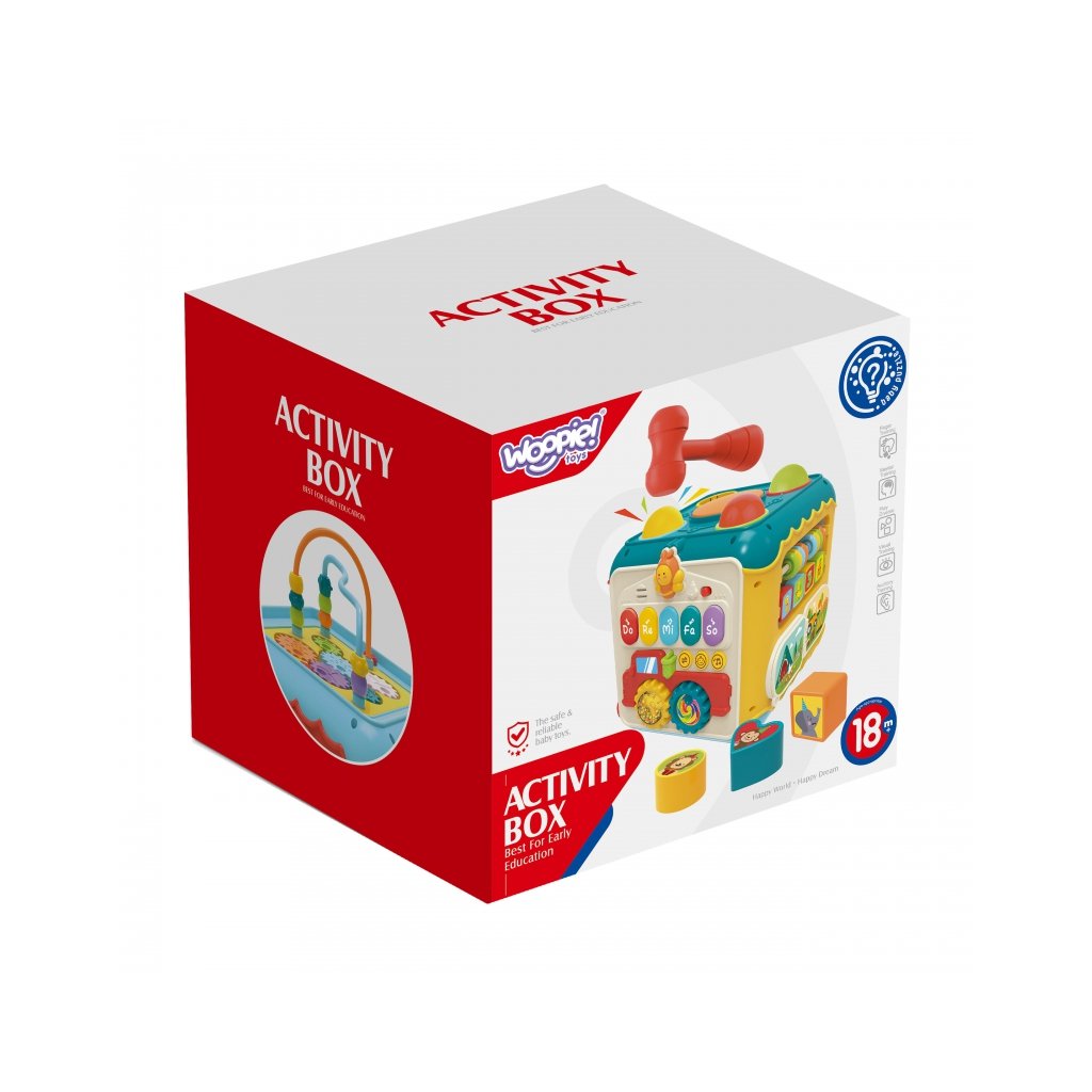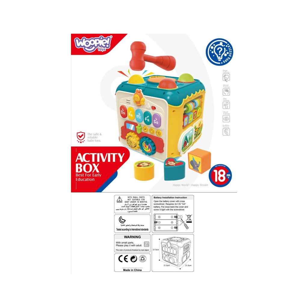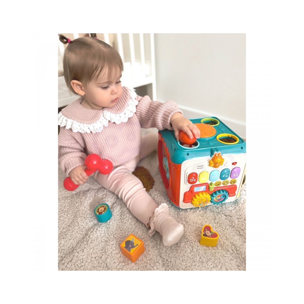 Multifunkčná montessori kocka 6v1 je farebná a zábavná hračka určená pre deti od 18 mesiacov. Ponúka hneď šesť rôznych herných plôch, vďaka ktorým si dieťa rozvíja zmysly, motoriku aj logické myslenie, a pritom sa skvele baví. Každá strana kocky prináša inú aktivitu, takže hra nikdy neomrzí a podporuje prirodzené objavovanie sveta podľa princípov Montessori. Súčasťou kocky je malé pianínko, ktoré rozvíja sluch a cit pre hudbu, ďalej klasický tvarový sorter, kde deti priraďujú farebné tvary do správnych otvorov. Na ďalšej strane sa nachádza labyrint s posuvnými prvkami, ktorý pomáha trénovať jemnú motoriku a koordináciu pohybu. Deti sa môžu tiež hrať s kladivkom a zatĺkať farebné guličky, čím rozvíjajú silu aj presnosť pohybov. Kocka navyše obsahuje prekladací prieplet na precvičovanie prstíkov a malé dvierka so zámkom, ktoré podporujú zvedavosť a pochopenie princípu. Vďaka farbám a rôznym materiálom stimuluje kocka zrak, sluch aj hmat. Hračka rozvíja jemnú motoriku, koordináciu oko-ruka, logické myslenie a schopnosť rozpoznávať tvary aj farby. Parametre: Rozmery: 21,5 x 21,5 x 21,5 cm Materiál: plastDodatočné parametre