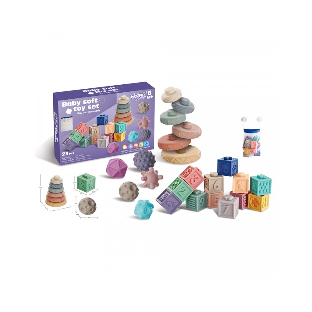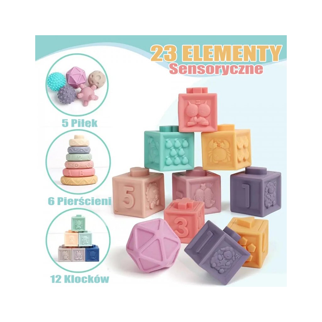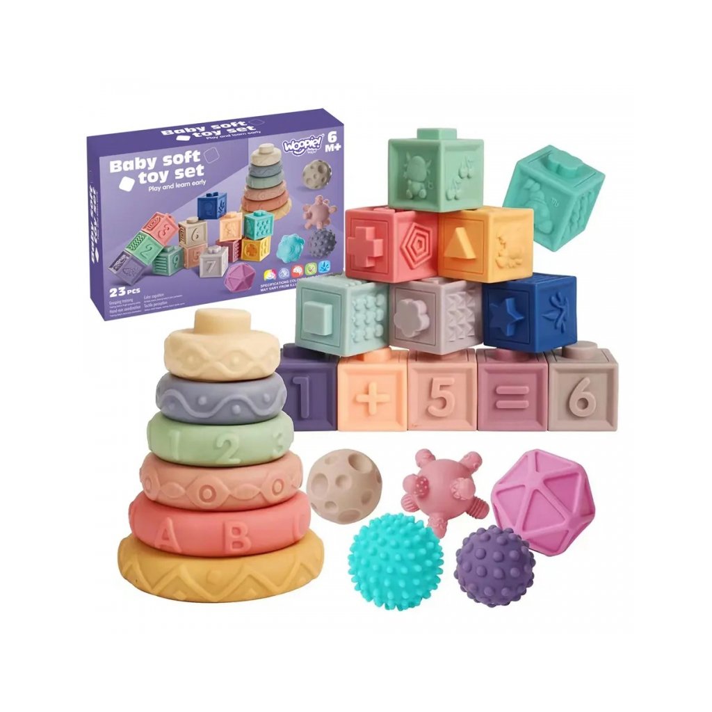 Senzorická sada je perfektní kombinací zábavy a učení pro nejmenší děti už od 6 měsíců. Měkké barevné kostky s čísly a matematickými symboly, texturované mačkací míčky a barevné kroužky na stavění věže rozvíjejí nejen jemnou motoriku, ale také zrakové, sluchové a hmatové vnímání. Každý prvek stimuluje jiný smysl – děti mačkají, skládají, roztřiďují, staví a přitom se učí rozpoznávat tvary, barvy i první čísla. Kostky jsou ideální i jako kousátka – jsou vyrobeny z měkkého, bezpečného materiálu bez BPA. Při stisknutí vydávají příjemný zvuk, který děti zaujme a povzbudí k dalšímu zkoumání. Celá sada je uložena v praktickém sáčku a dárkovém balení, což z ní dělá skvělý tip na dárek pro miminko nebo batole. Parametry: Rozměry: míčky - 6 x 6 x 6 cm kruh - 9,5 x 9,5 x 12 cm kostky - 5 x 5 x 5 cm Materiál: měkká gumaDodatočné parametre