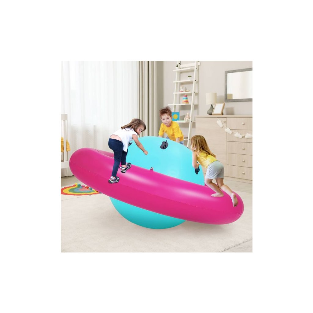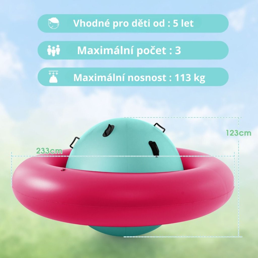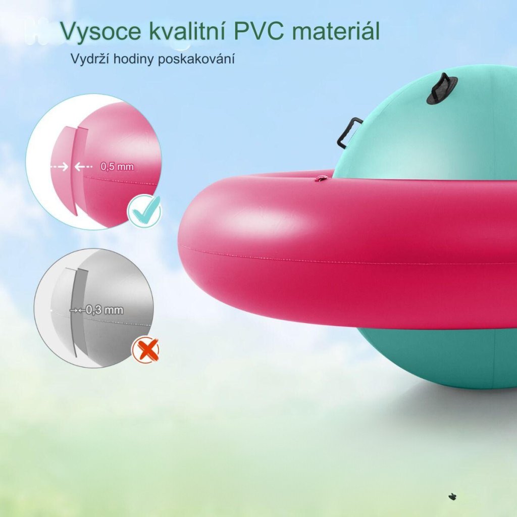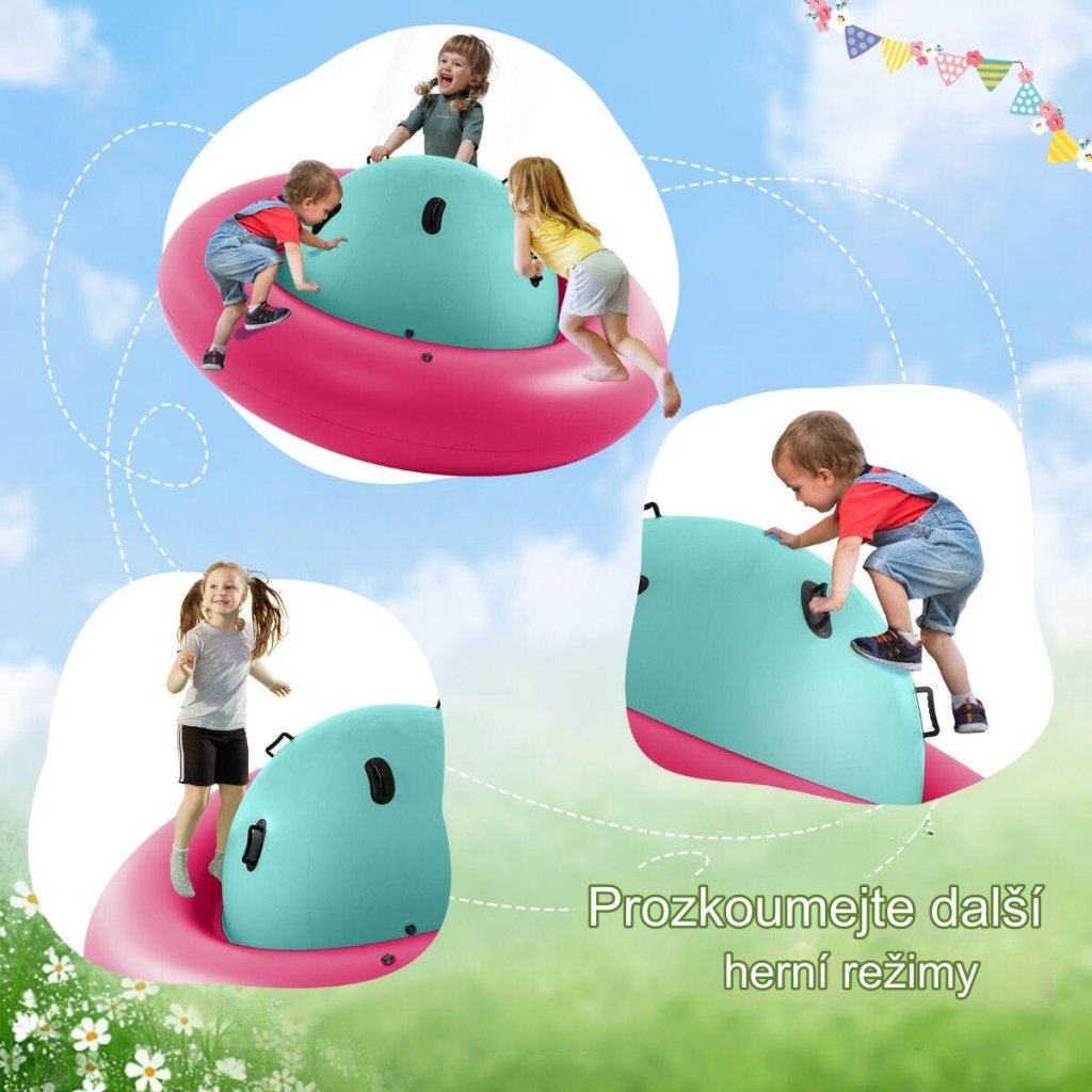 Obria skákacia lopta podobajúca sa vesmírnej lodi ponúka deťom nevšedný a nádherný herný zážitok. Je ideálny až pre 3 hráčov. K dispozícii je 6 vstavaných rukovätí. A ergonomický tvar každej rukoväte je vhodný pre malé detské ruky, takže ju ľahko uchopia a sú pripravené sa kotúľať, nakláňať, šplhať a poskakovať! Nafukovacia skákacia lopta je vyrobená z PVC materiálu s hrúbkou 0,5 mm a jeho použitie je bezpečné a odolné, aby poskytoval roky zábavy. Nafukovacia skákacia lopta sa skladá z dvoch samostatných komôr so samostatnými ventilmi, ktoré ľahko nafúknete pomocou pumpičky (NIE JE súčasťou balenia). Odporúča sa najprv nafúknuť modrý krúžok. Potom, čo je úplne nafúknutý, zatvorte ventil a zatlačte ventil dovnútra, aby sa zasunul. Pomáha im tiež budovať silu, čo má pozitívny vplyv na motoriku, dynamickú rovnováhu a koordináciu tela. Nepoužívajte na vodu. Používajte prosím pod dohľadom rodičov. Neodporúča sa používať vo veterných dňoch. Z balančných dôvodov by bolo lepšie, keby sa hrali dve až tri deti súčasne. Pokiaľ ho nepoužívate, vyfúknite ho a uložte na tienistom a vetranom mieste. Jednoduché nafukovanie a vyfukovanie vďaka dvojstupňovým ventilom Kompaktný, skladací formát uľahčuje skladovanie Vhodné pre vnútorné aj vonkajšie použitie Farba: zelená + modrá Materiál: PVC Celkové rozmery: 223 x 123 cm (priemer x V) Dĺžka rukoväte: 10 cm Max. nosnosť: 113 kg Odporúčaný vek: od 5 rokov Max. počet hráčov: 3 deti Čistá hmotnosť: 7,5 kg Nejedná sa o hračku do vody ani o vybavenie na záchranu života. Obsah balenia: 1 x nafukovacia hračka na skákanie a hojdanie 1 x návodDodatočné parametre