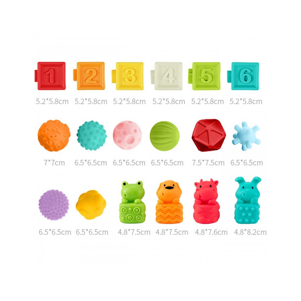 Táto sada zmyslových kociek je určená pre deti od približne 6 mesiacov. Každý z 20 dielikov je mäkký na dotyk, pri stlačení vydáva zvuk a ponúka rôzne textúry, tvary, čísla, symboly a motívy zvierat a ovocia. Kocky je možné medzi sebou spájať, čím je rozvíjaná aj jemná motorika dieťaťa. Hračka podporuje vnímanie zraku a sluchu, zmysel pre hmat, logické myslenie a prípravu na prvé počítanie. Parametre: Vek: od 6 mesiacov. Materiál: mäkké plastové dieliky s textúrou. Počet dielikov: 20. Každý dielik: cca 6 × 5,5 × 5 cm. Rozmer balenia: cca 43 × 7,5 × 27 cm. Obsahuje čísla a matematické symboly pre podporu učenia počítanie. Vydáva zvuky pri stlačení, podporuje viac zmyslov (dotyk, sluch, zrak)Dodatočné parametre
