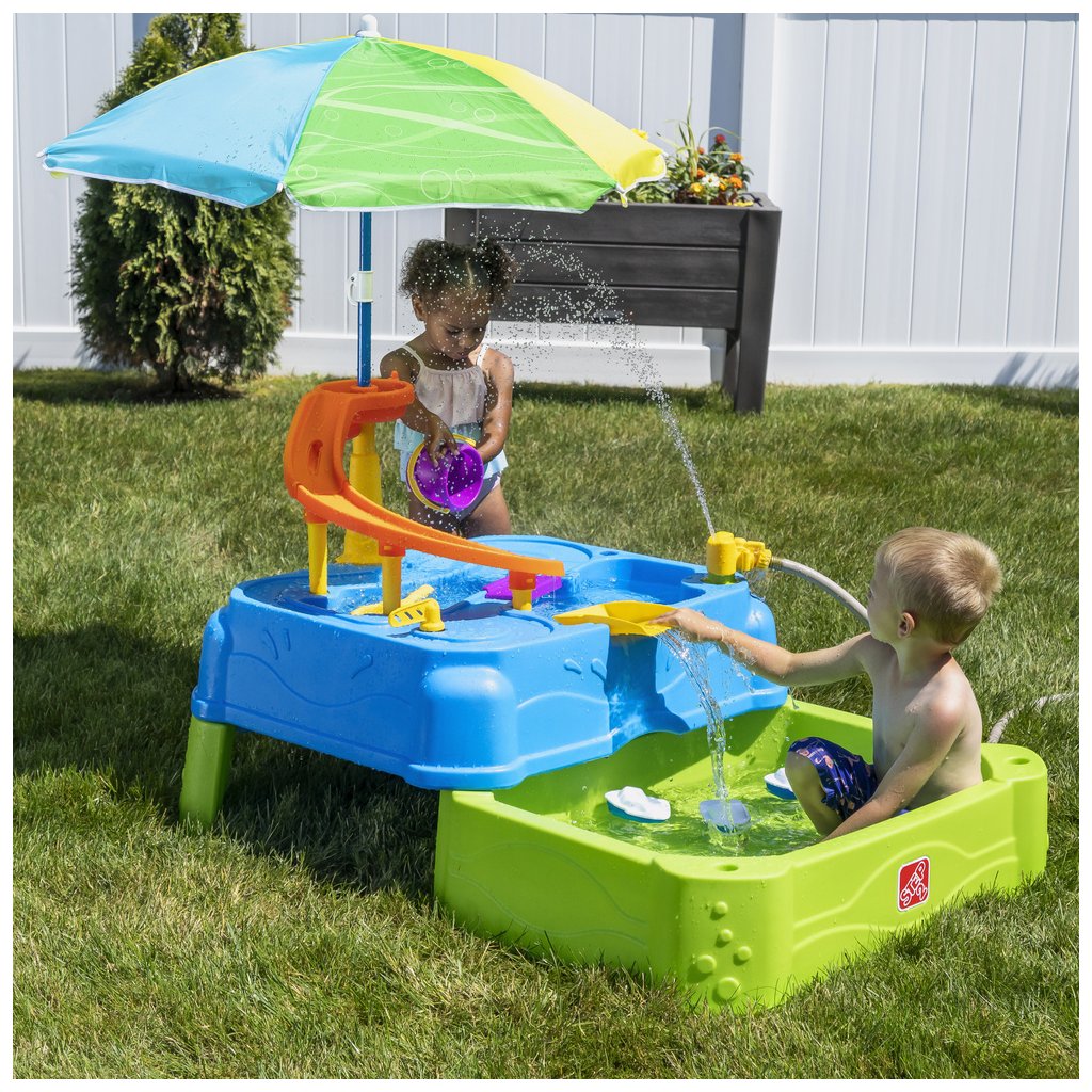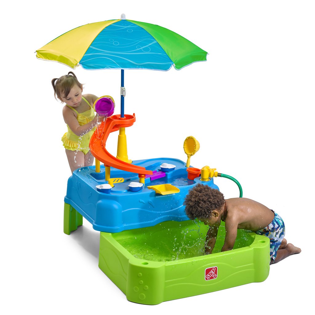 Dvojposchodový vodný stôl plný zázrakov a vodnej zábavy! - kropte, namáčajte a ešte viac vodných aktivít v tieni slnečníka -herný stôl je možné použiť ako jednoposchodovú aj dvojposchodovú hernú plochu - na hornom poschodí herného stola tobogán, z ktorého stekajúca voda padá rovno do lagúny -prevezte lode so vstavanými kolesami z mora na pevninu a prejdite sa po dráhe cez padací most -padací most umožňuje preplávanie lodí z jednej zátoky do druhej -naliatím vody na preklápací diel nateká voda do spodnej časti herného stolíka - deti si môžu pri hre vliezť do spodného bazénika a osviežiť si zároveň aj nožičky -súčasťou vybavenia je záhradná hadica, ktorú stačí pripojiť do nástavca vodného zavlažovača -po ukončení hry je možné vodu vypustiť cez vypúšťacie zátky v hornej a spodnej úrovni -pre skladovanie zasuňte jednoducho spodné poschodie späť pod hornú hraciu plochu -výškovo nastaviteľný slnečník s priemerom 106 cm -výšku je možné nastaviť z výšky 82,5 cm až na 130 cm -vhodné pre deti od 1,5 roka -herný stolík sa vyznačuje bezkonkurenčnou pevnosťou, odolnosťou a stálosťou farby -ľahké čistenie: používajte dezinfekčné obrúsky alebo bežné čistiace prostriedky pre domácnosť -vrchná časť stola pojme až 15 litrov vody, spodný bazénik až 60 litrov vody -príslušenstvo: sitko, vedro, hrnček, 3 člny s kolieskami, rozstrekovač na hadicu a slnečníkDodatočné parametre