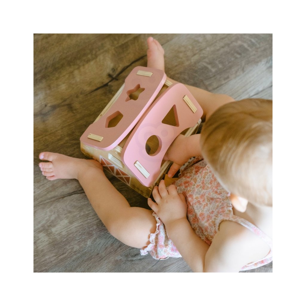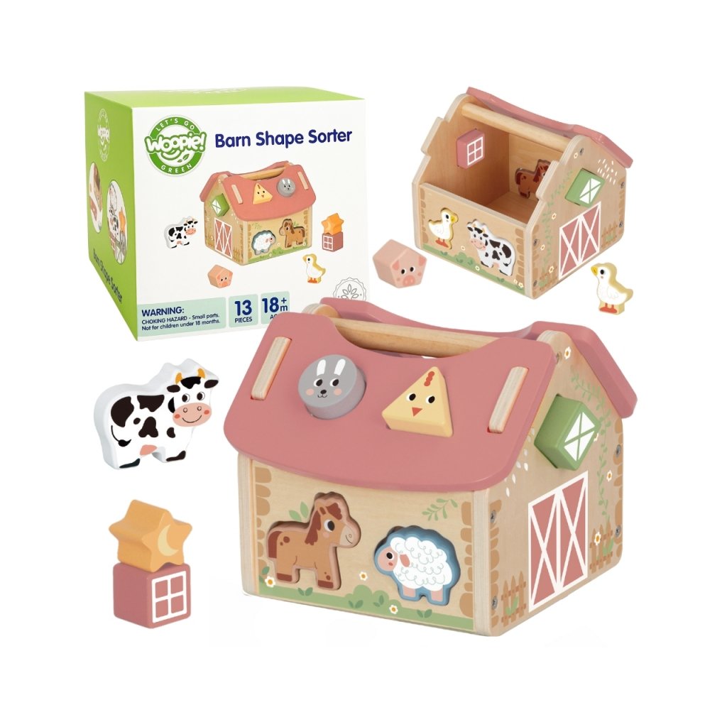 Táto roztomilá drevená farma je vkladačka (sorter) obsahujúca 13 dielov v pastelových farbách, navrhnutá tak, aby ponúkla deťom zábavný a zmysluplný spôsob hry aj učenia. Hračka je určená pre deti od zhruba 18 mesiacov veku. Hlavný motív je farma - súčasťou sú figúrky zvierat a tvary ako kruh, trojuholník, hviezda, päťuholník ai. Tieto dieliky dieťa vkladá do zodpovedajúcich otvorov na stenách stodoly a tým si prakticky precvičuje rozpoznávanie tvarov a farieb, koordináciu ruka-oko a jemnú motoriku. Stodola má odnímateľnú strechu, ktorá uľahčuje prístup k vkladaným dielikom a zároveň poskytuje priestor na ich uskladnenie. Hračku je možné ľahko prenášať vďaka zabudovanému držadlu. Materiál je kvalitné drevo v jemnom, pastelovom prevedení. Parametre: Rozmery: 18 x 18.6 x 16 cm Materiál: drevo Vhodný pre deti od 18 mesiacovDodatočné parametre
